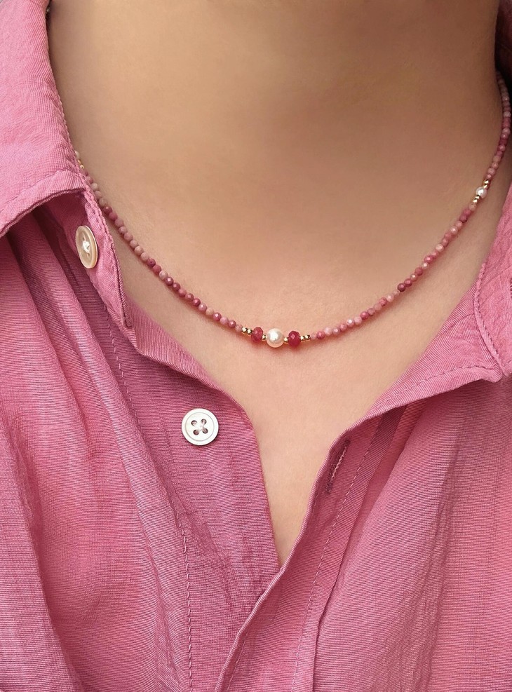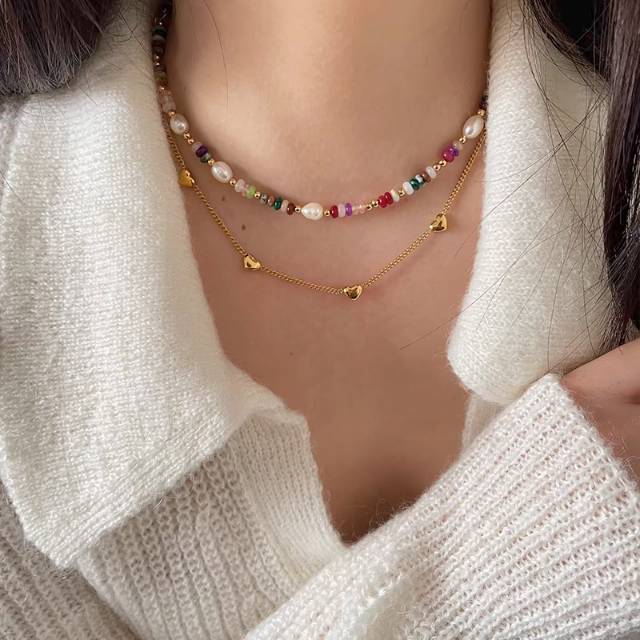 这条项链集合了清新淡雅的淡水珍珠、柔美的粉色小珠和精致的爱心吊坠,