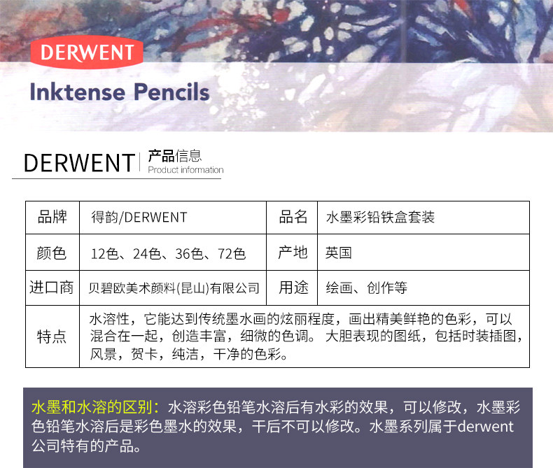 英国进口Derwent得韵水墨水溶彩铅12色24色36色72色铁盒彩铅套装