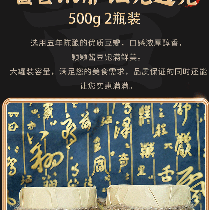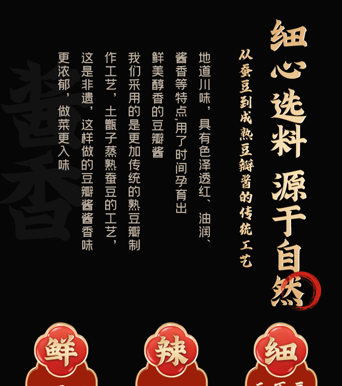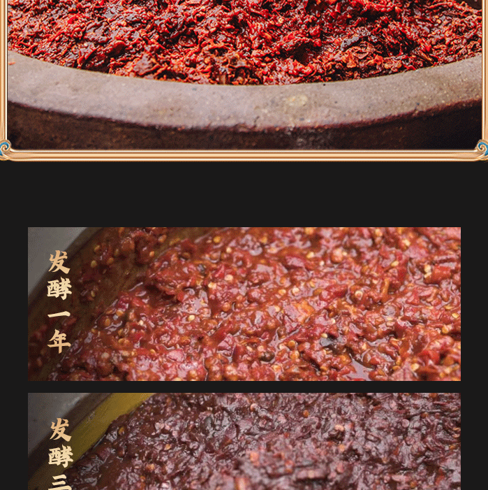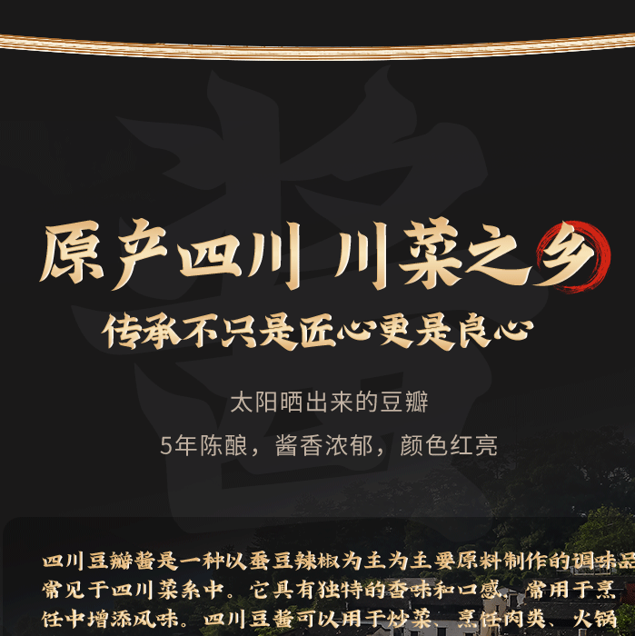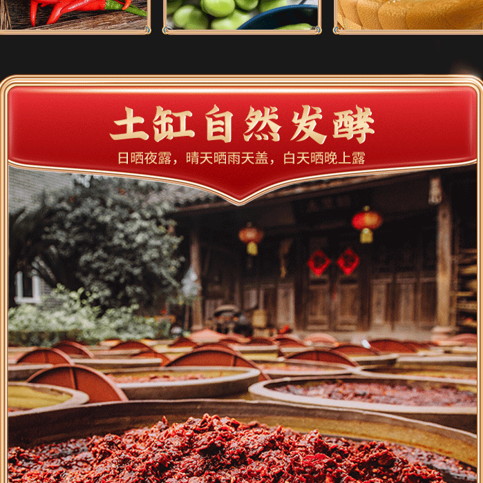 自然发酵1000+天,坚持日晒夜露,不到时间不提缸,真正遵循时间周期规律,酱香味非常浓郁,为川菜加分