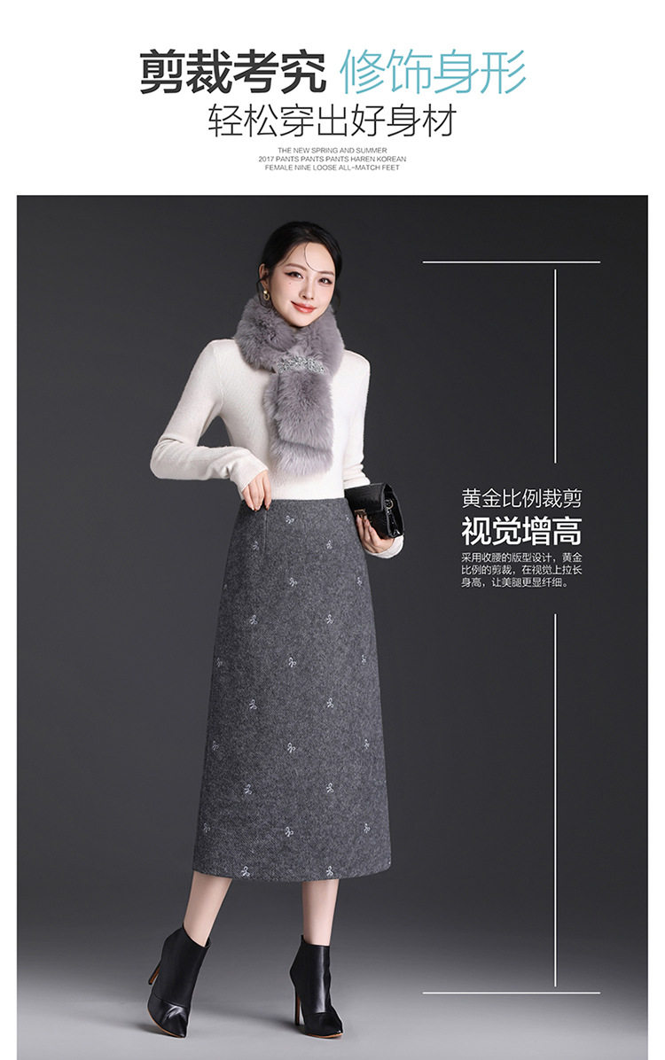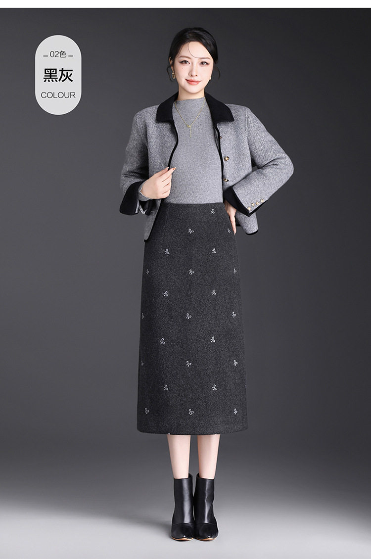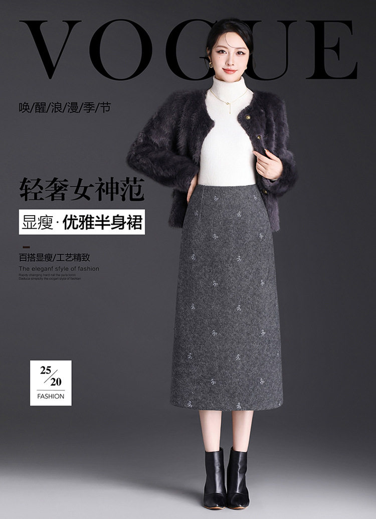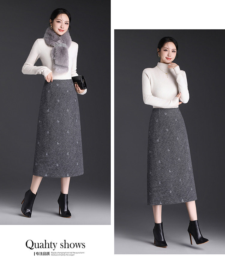 「自」全新升级【铂金会员146/天猫199/差价53】(13952)洛诗琳蝴蝶结刺绣毛呢半身裙2025秋冬新款高腰A字中长直筒裙