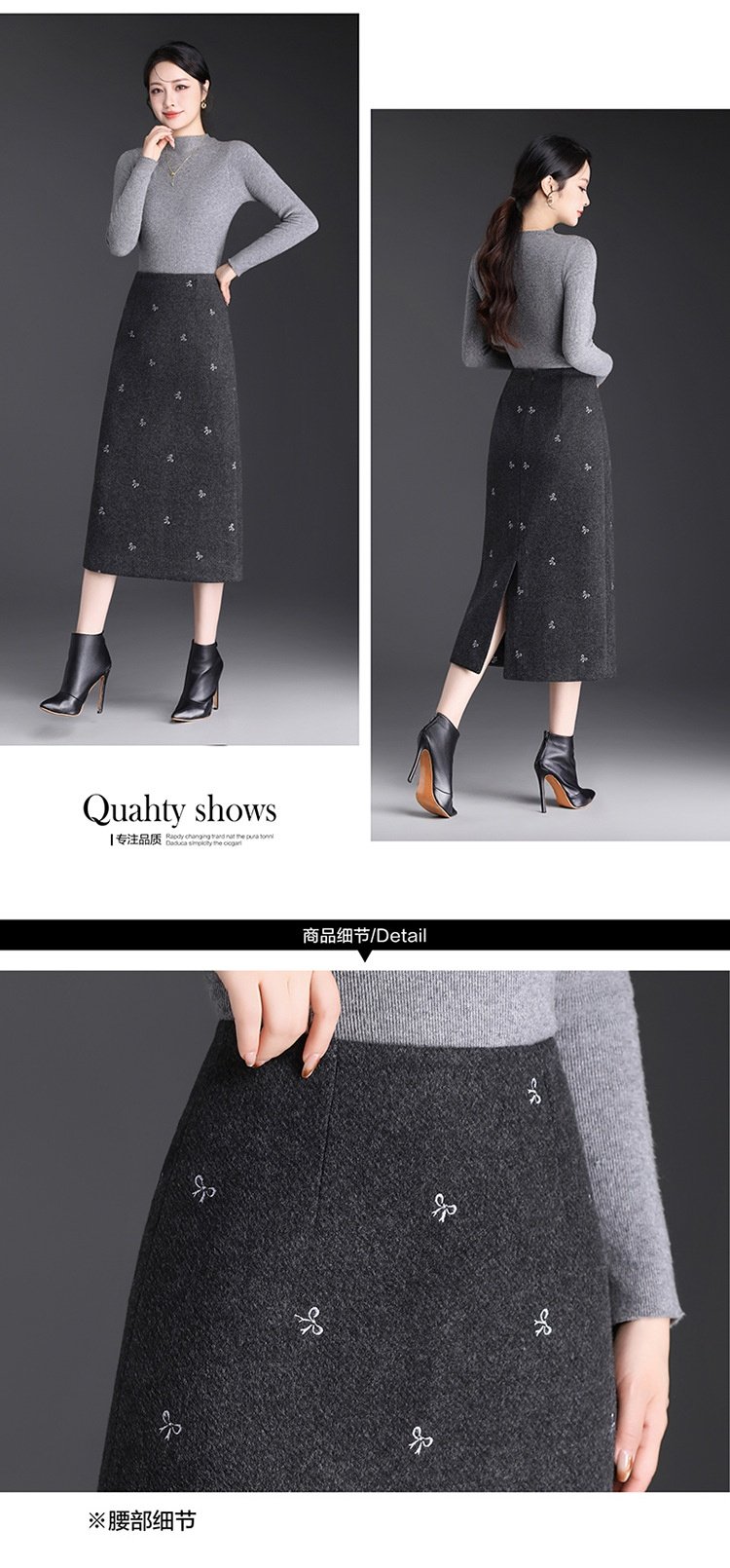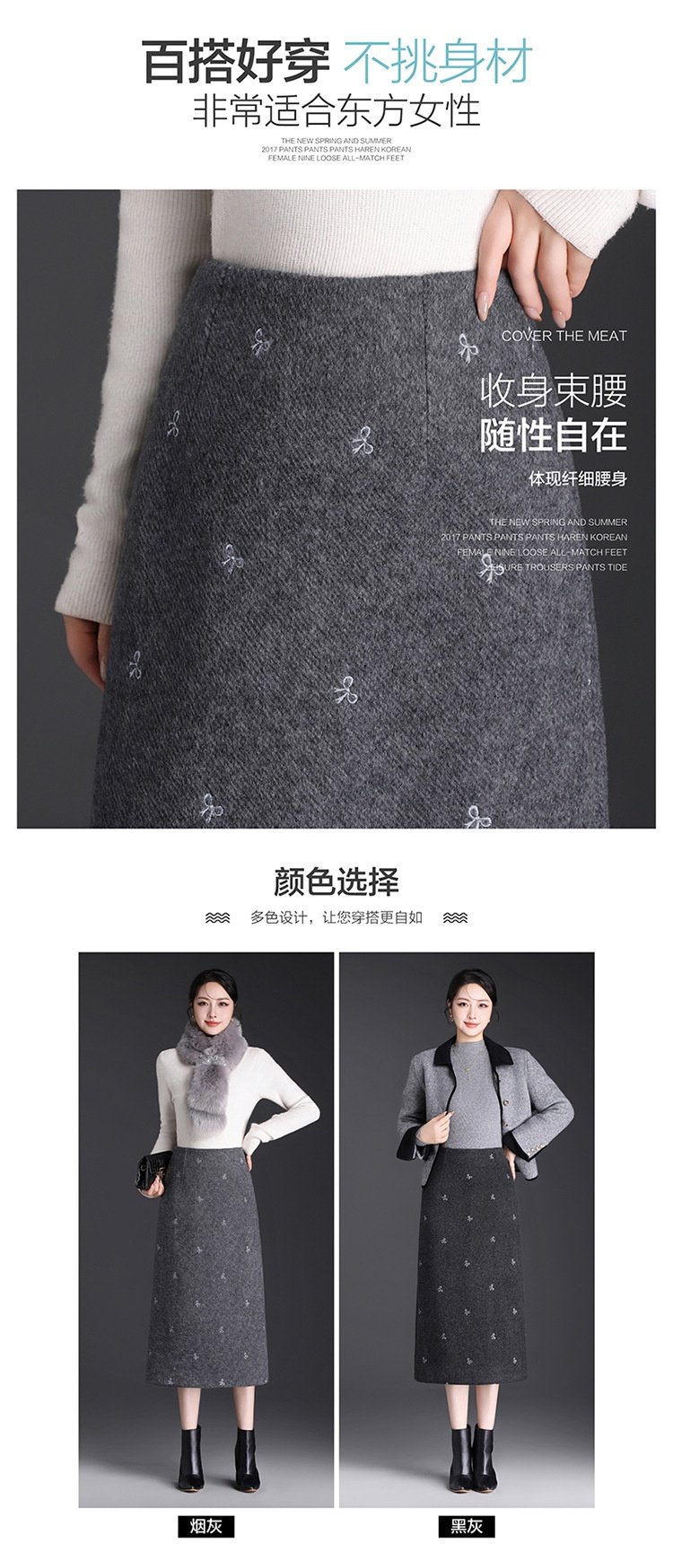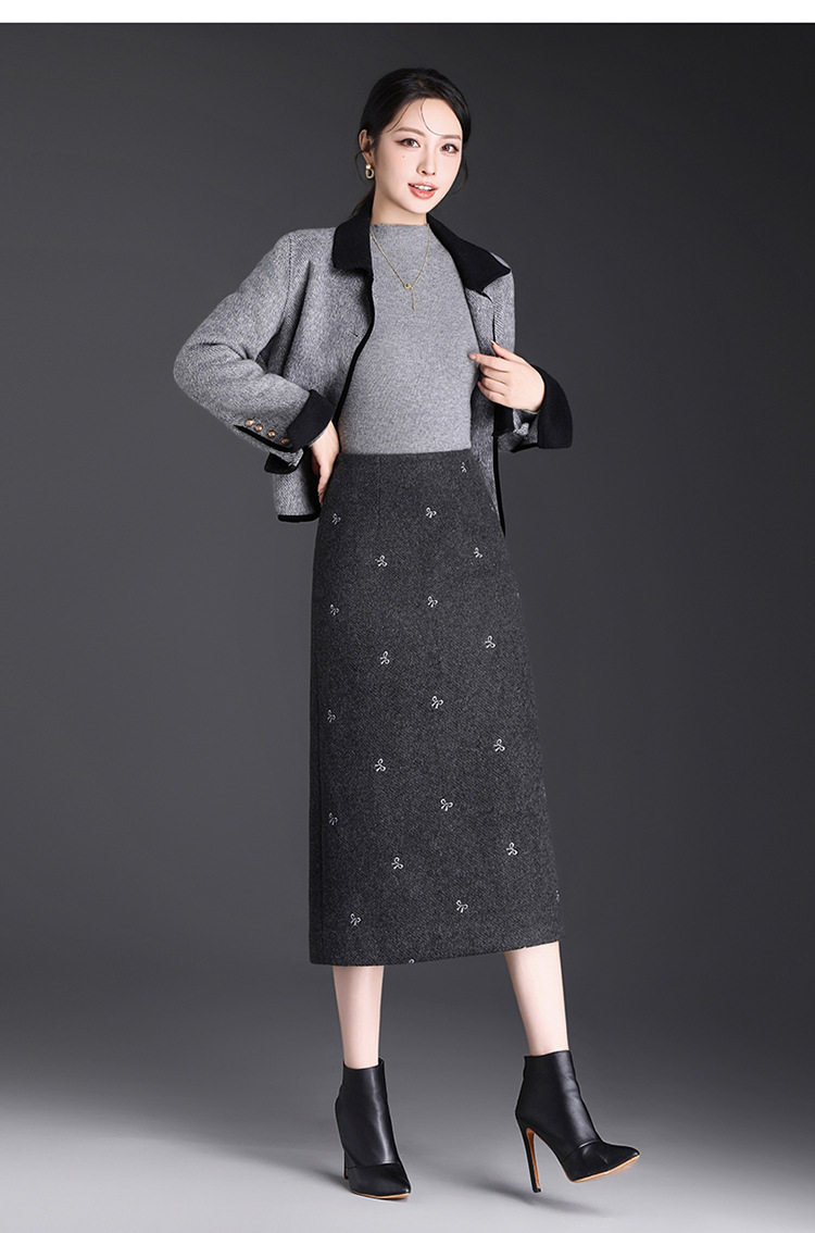 「自」全新升级【铂金会员146/天猫199/差价53】(13952)洛诗琳蝴蝶结刺绣毛呢半身裙2025秋冬新款高腰A字中长直筒裙