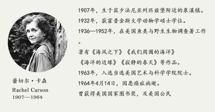 罹患癌症的卡森带病写完本书,两年后告别人世。她被视为全世界环保运动的先驱,她在书里留下的呼吁,她所提出的人应与自然合作、毒害大自然就是在毒害人类的思想,至今仍值得我们重视。