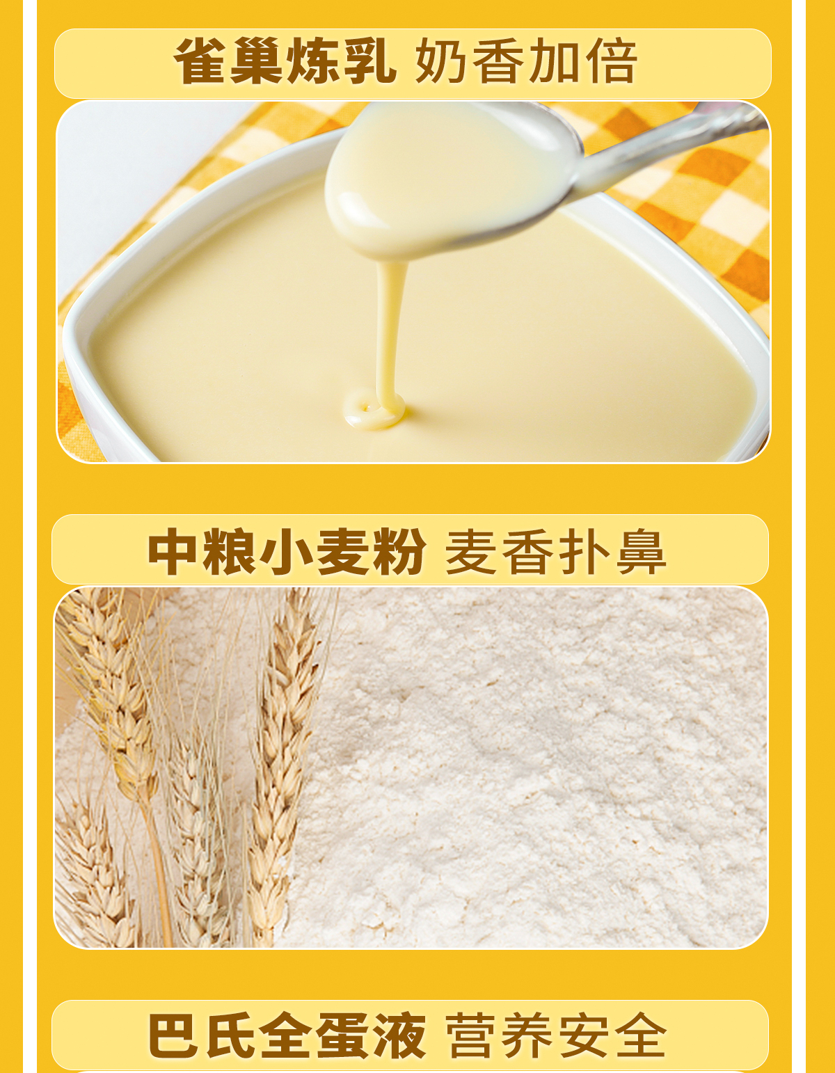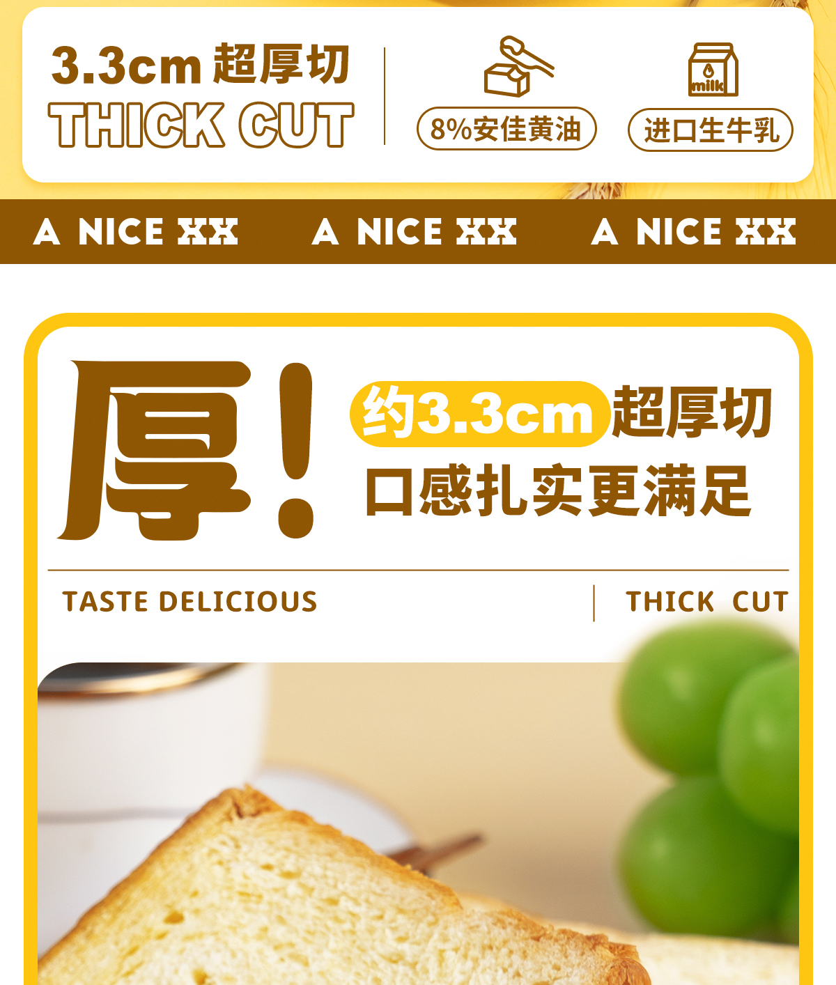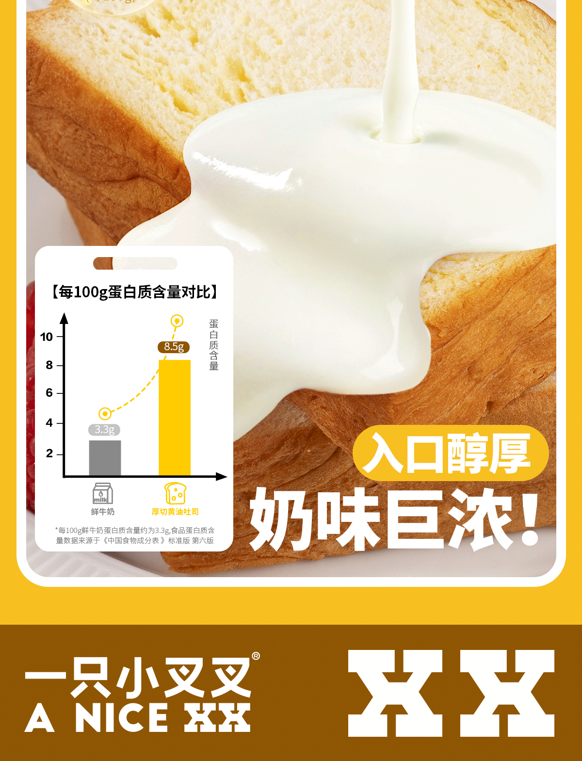 1、厚!约3.5cm超厚切口感扎实更满足 2、香!添加8%安佳黄油、澳洲进口生牛乳入口醇厚,奶味巨浓! 3、软!手工和面+6小时发酵传统手工编花工艺 纹理层叠口感丰富 4、五重好原料自然好味道:安佳黄油香醇浓郁、雀巢炼乳奶香加倍、中粮小麦粉麦香扑鼻、巴氏全蛋液营养安全、澳州进口乳粉新鲜清甜 5、不含反式脂肪酸美味安心轻负担 |