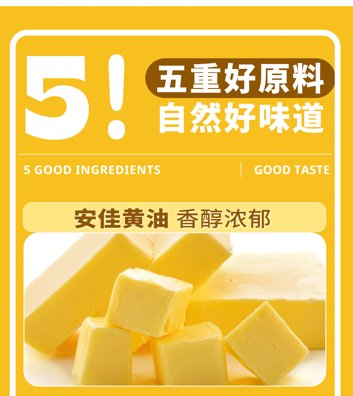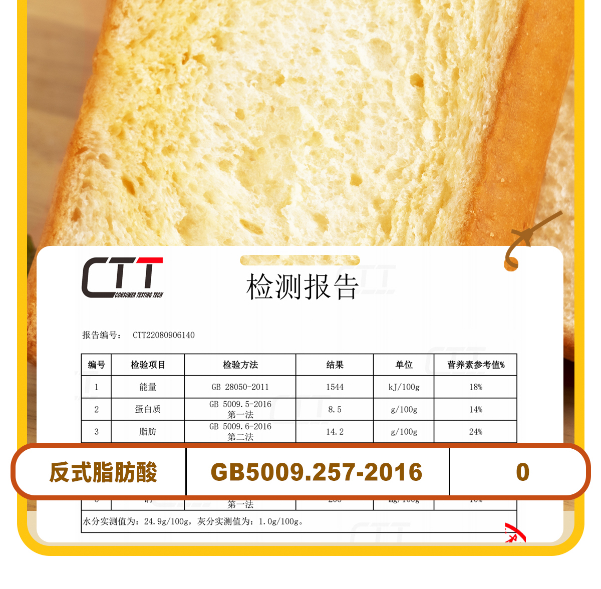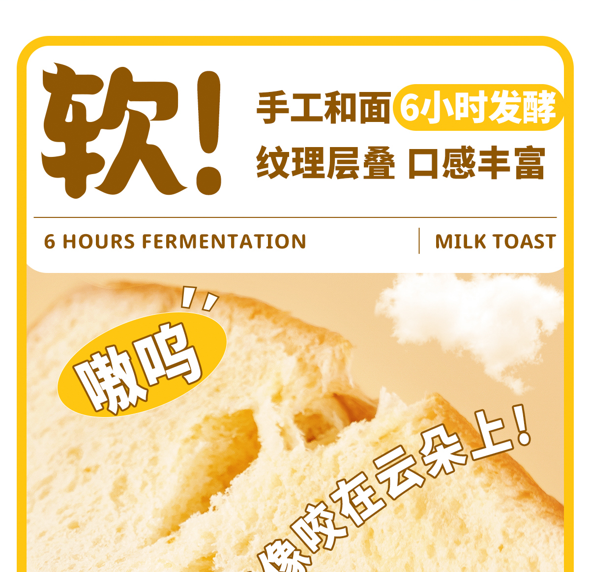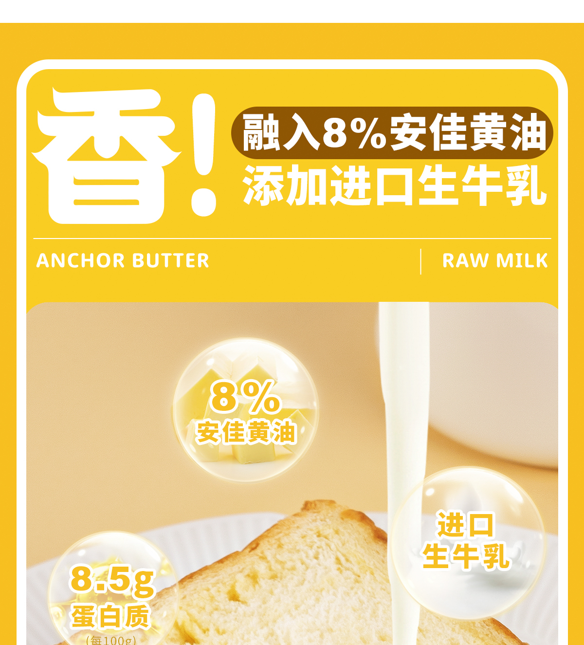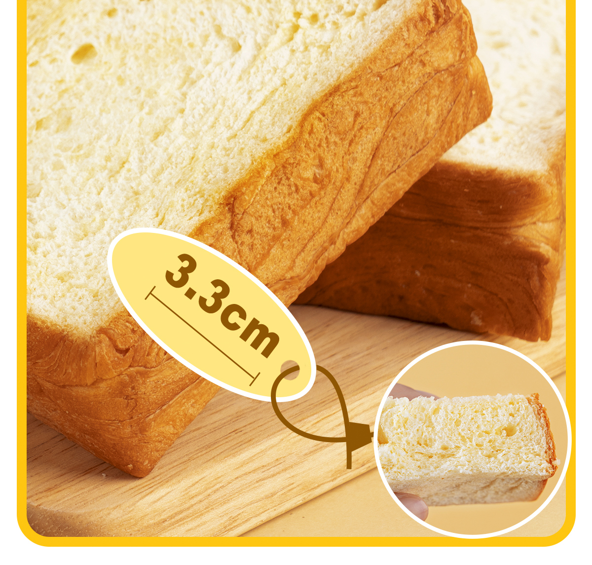 一家老小都强烈要求囤这个!口感如云朵般绵软的黄油吐司!使用新西兰原装进口的全球顶级安佳黄油!奶源地顶尖的澳洲进口生牛乳!高品质中粮小麦粉!汇集顶级原料, 产地原生态,多道工序检测无污染,只为了做出这个3.5厘米超厚切的宝藏吐司,一口下去奶香四溢,绵软柔韧超满足!堪比烘培店的口味口感!