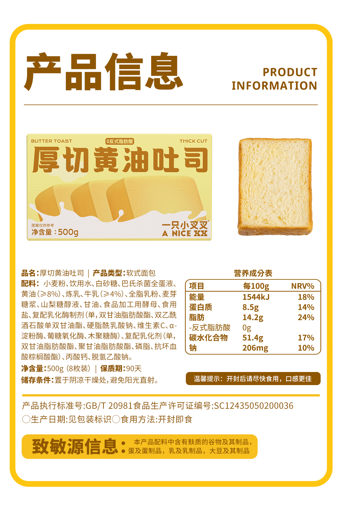 【产品名称】一只小叉叉厚切黄油吐司 【产品规格】500g一箱 【发货地】福建泉州 【合作快递】圆通韵达(暂不接受备注指定其他快递哦) 【不发货地区】新疆、西藏、内蒙古、青海、港澳台及海外地区、疫情地区 【主要成分】小麦粉、饮用水、白砂糖、巴氏杀菌全蛋液、黄油(≧8%)等 【生产日期】近半个月内生产 【储存方式】:常温储存 【保质期】3个月 【适合人群】建议3岁以上人群食用,孕妇可食用,儿童及老人请在监护下食用 【售后相关】食品类暂不支持七天无理由退款 |