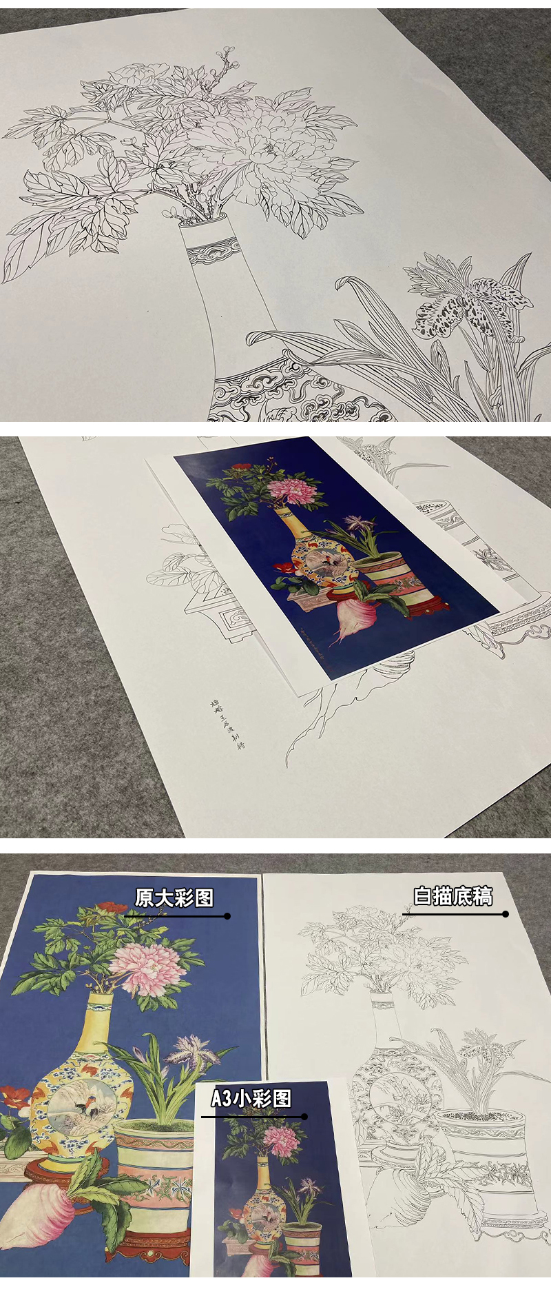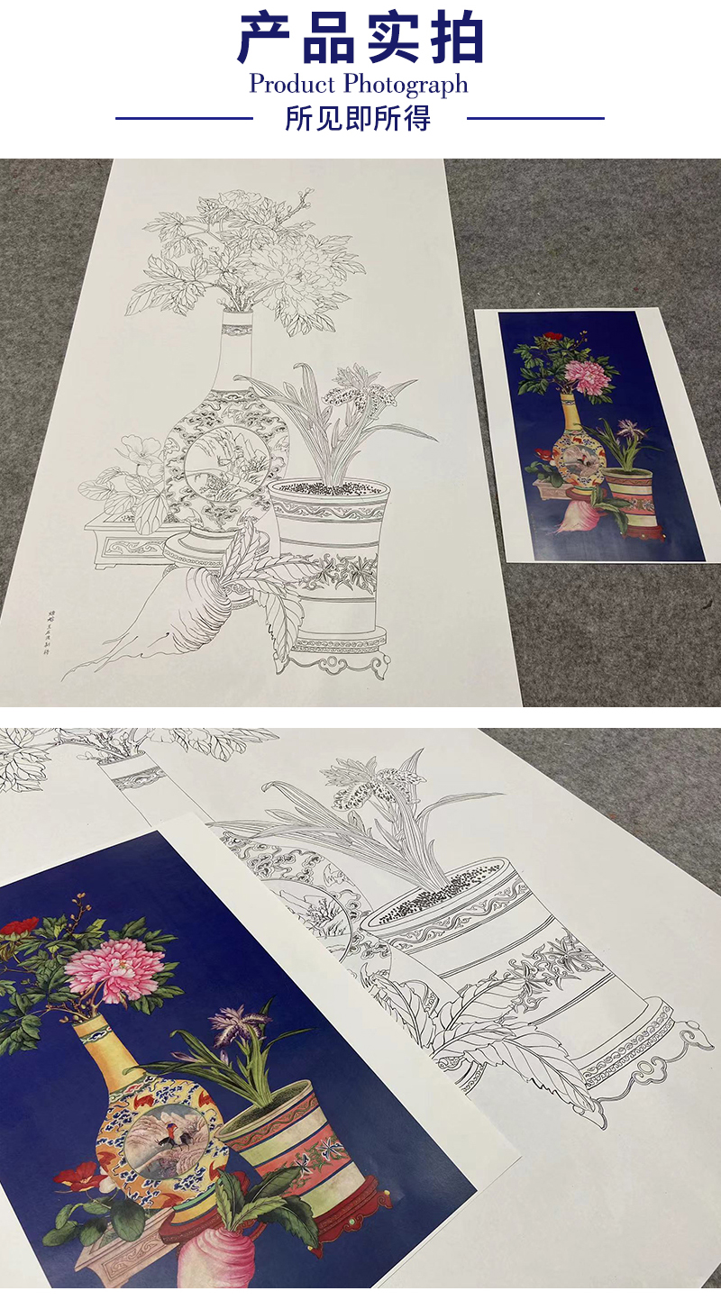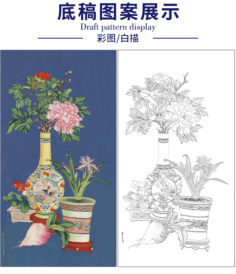 【大彩图】郎世宁工笔画白描底稿《平安富贵图》花瓶临摹勾线高清打印稿LS18