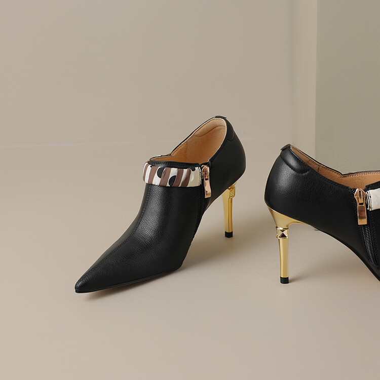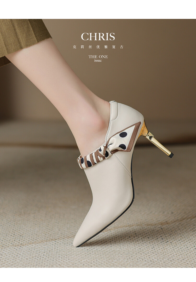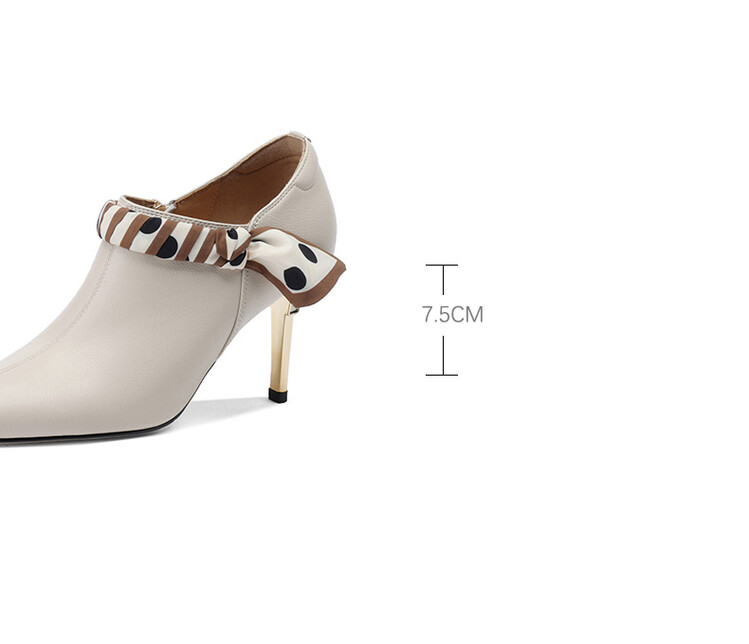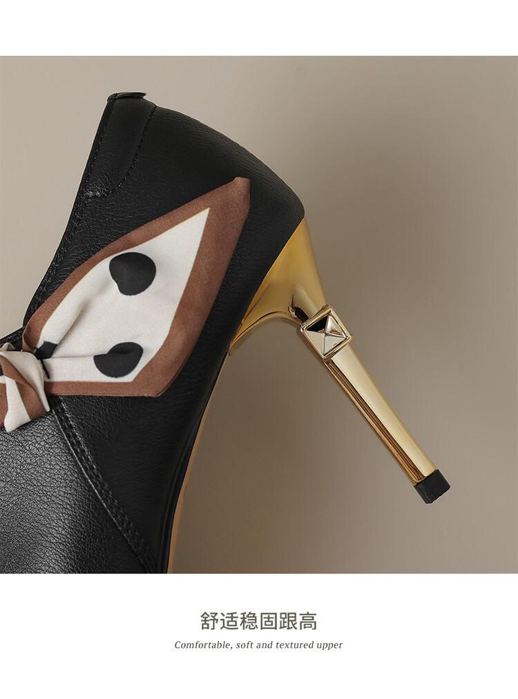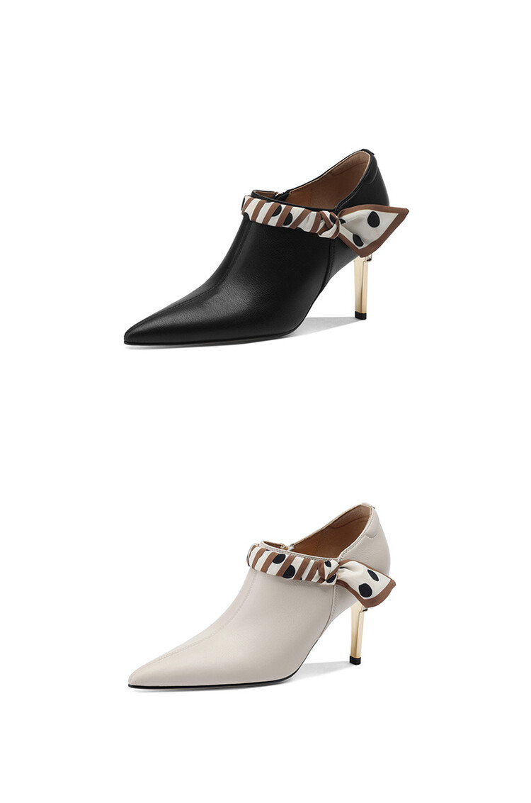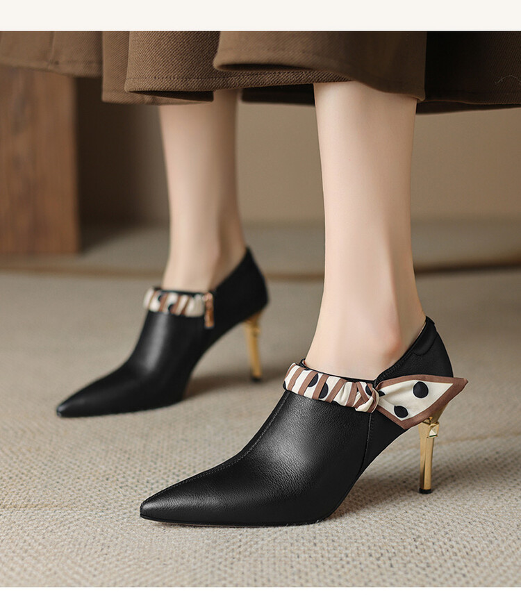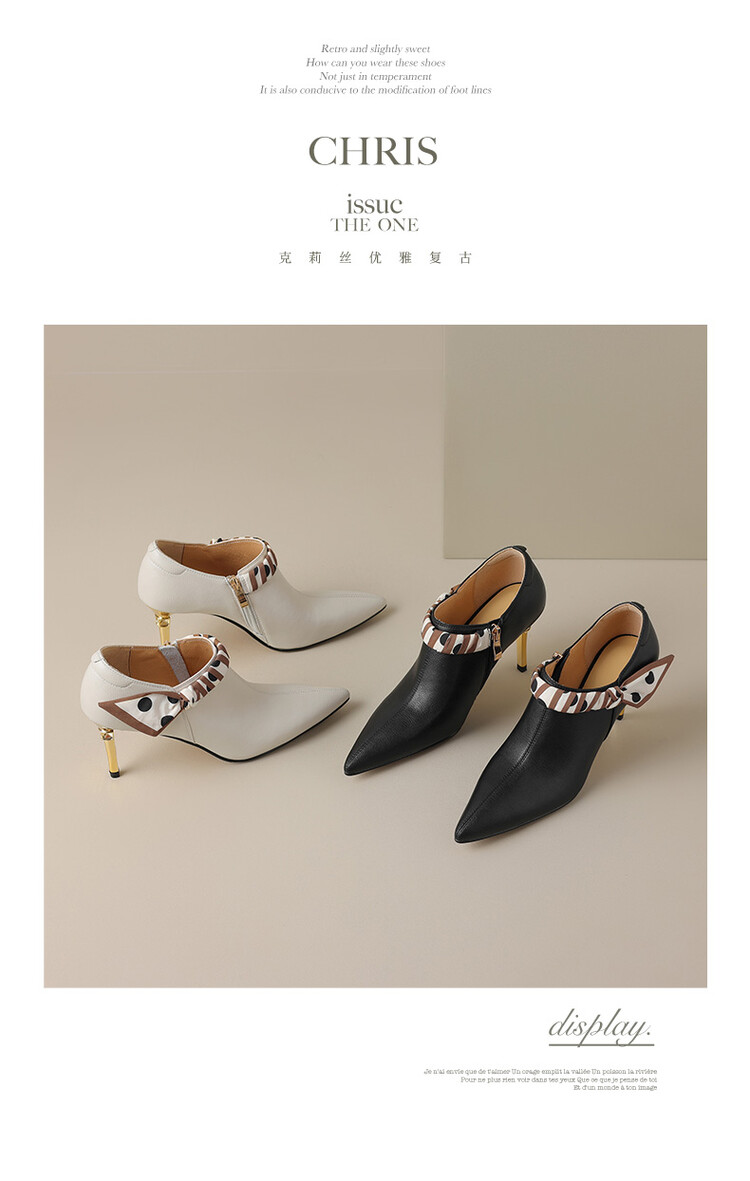 【预售5天】里外全皮细跟尖头丝带链条侧拉链深口单鞋牛皮韩版复古高跟鞋裸靴FDME&FD5281