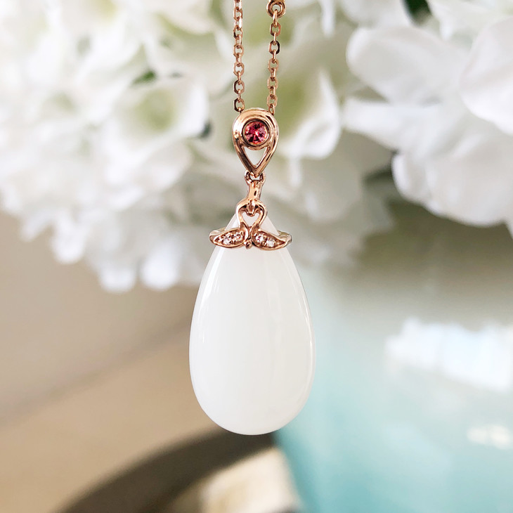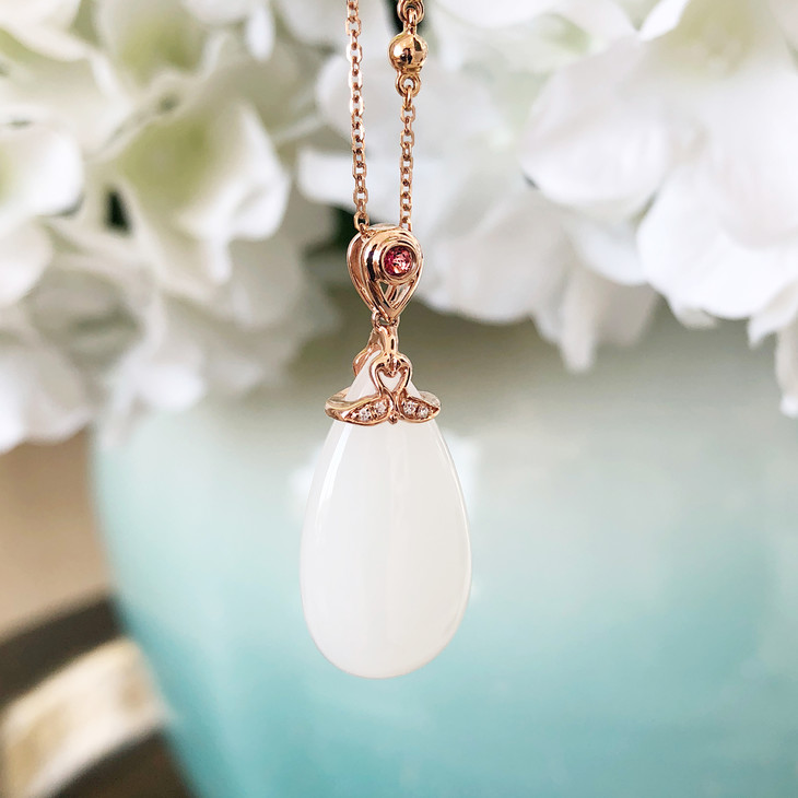 18K玫瑰金和田玉(白玉)镶钻水滴吊坠