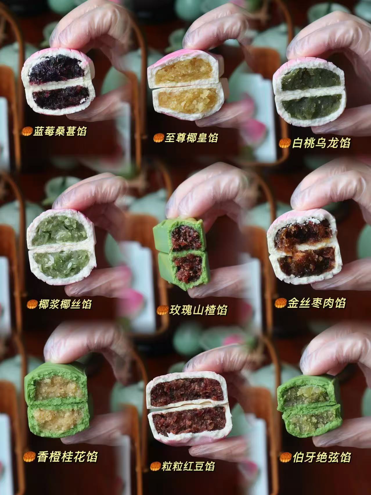 纯手工制作,采用王后小麦粉,水怡麦芽糖浆、牛奶,奶粉,白芸豆,莲蓉,椰浆,椰丝,白桃丁,乌龙茶,蓝莓,桑葚,红豆伯牙绝弦茶,茉莉花茶,玫瑰干花,山楂红枣肉,椰蓉,香橙丁,桂花,仙人掌果粉,抹茶粉,红曲粉,芝士粉,食用色素极少量。