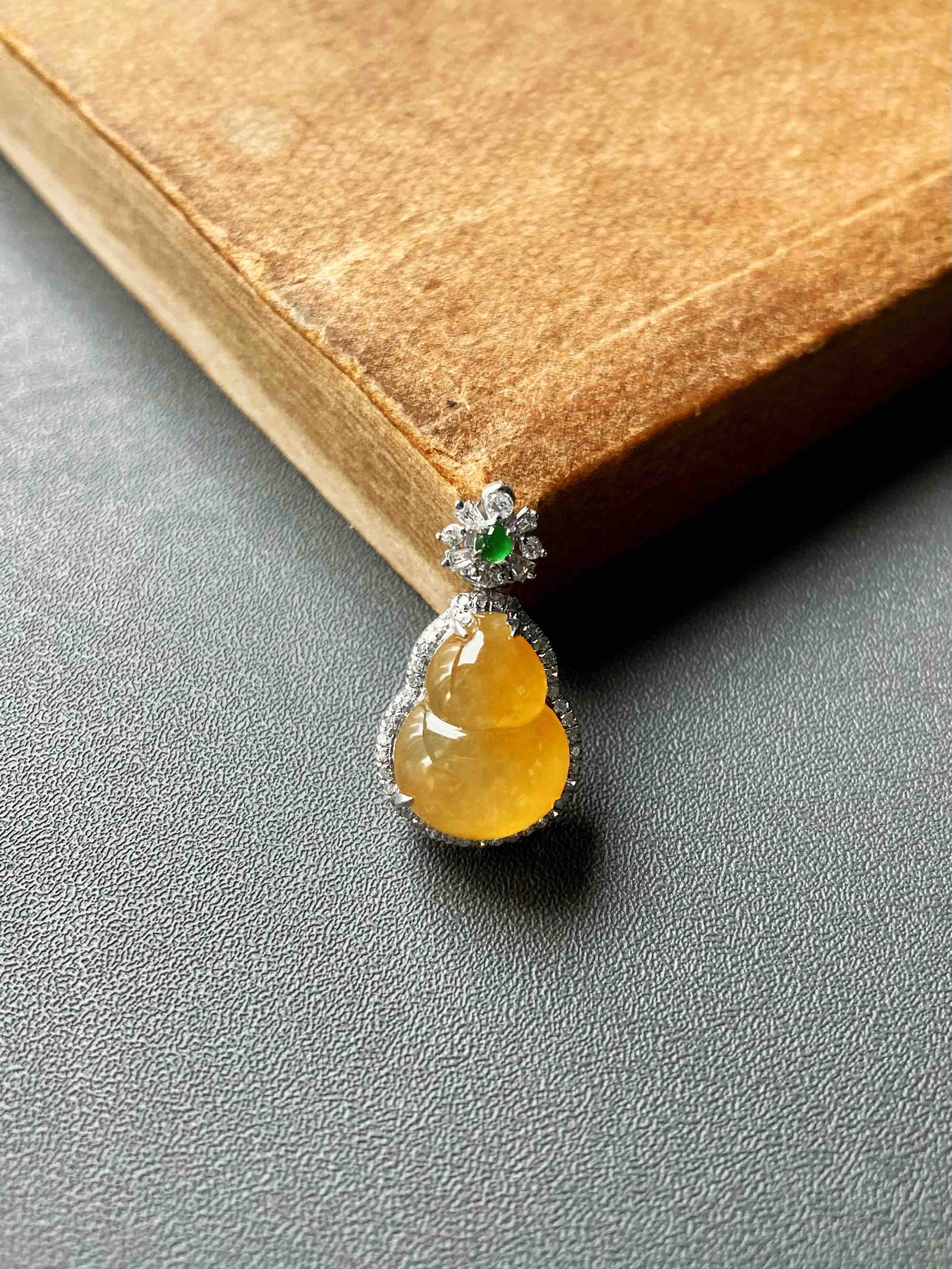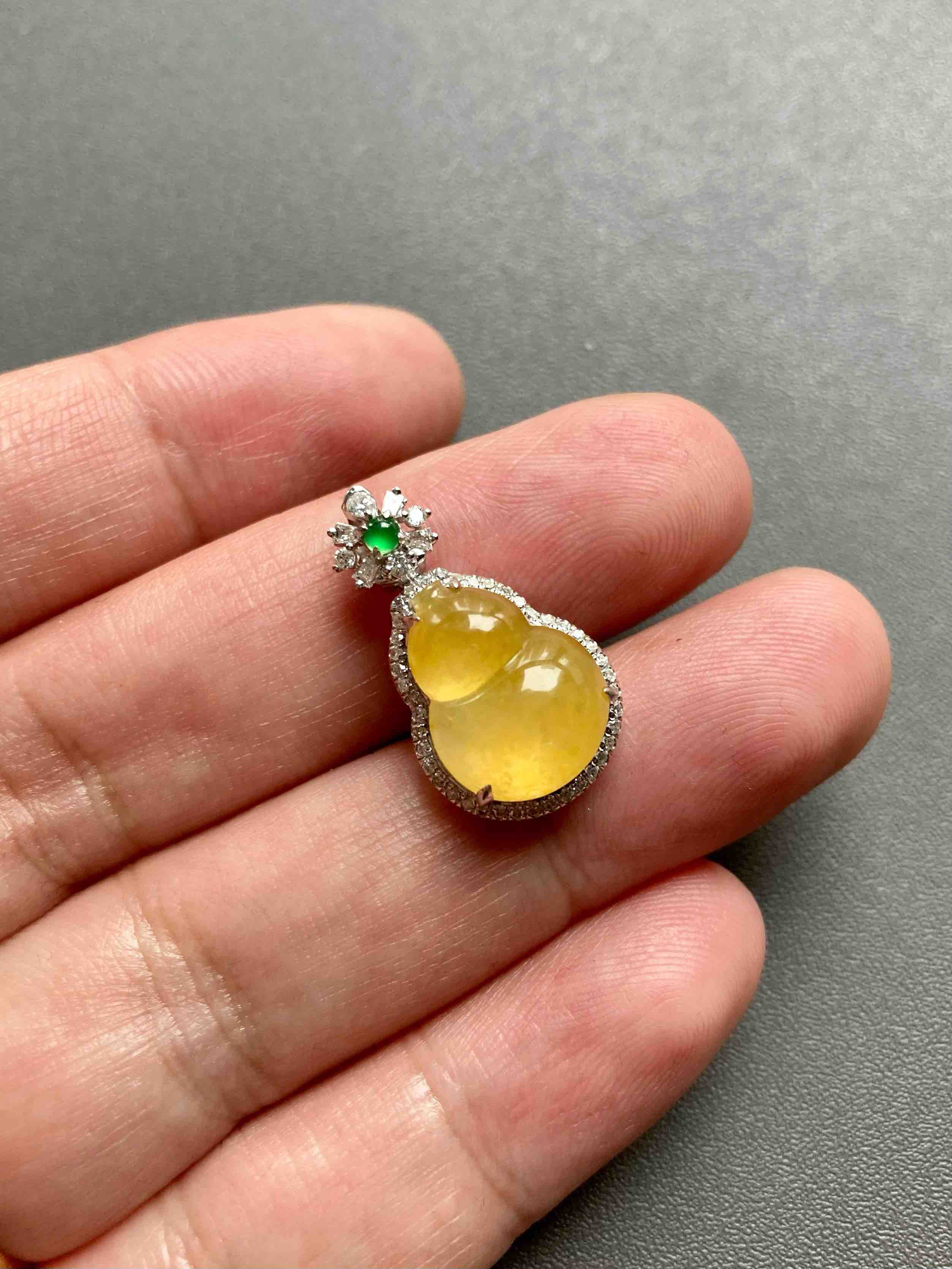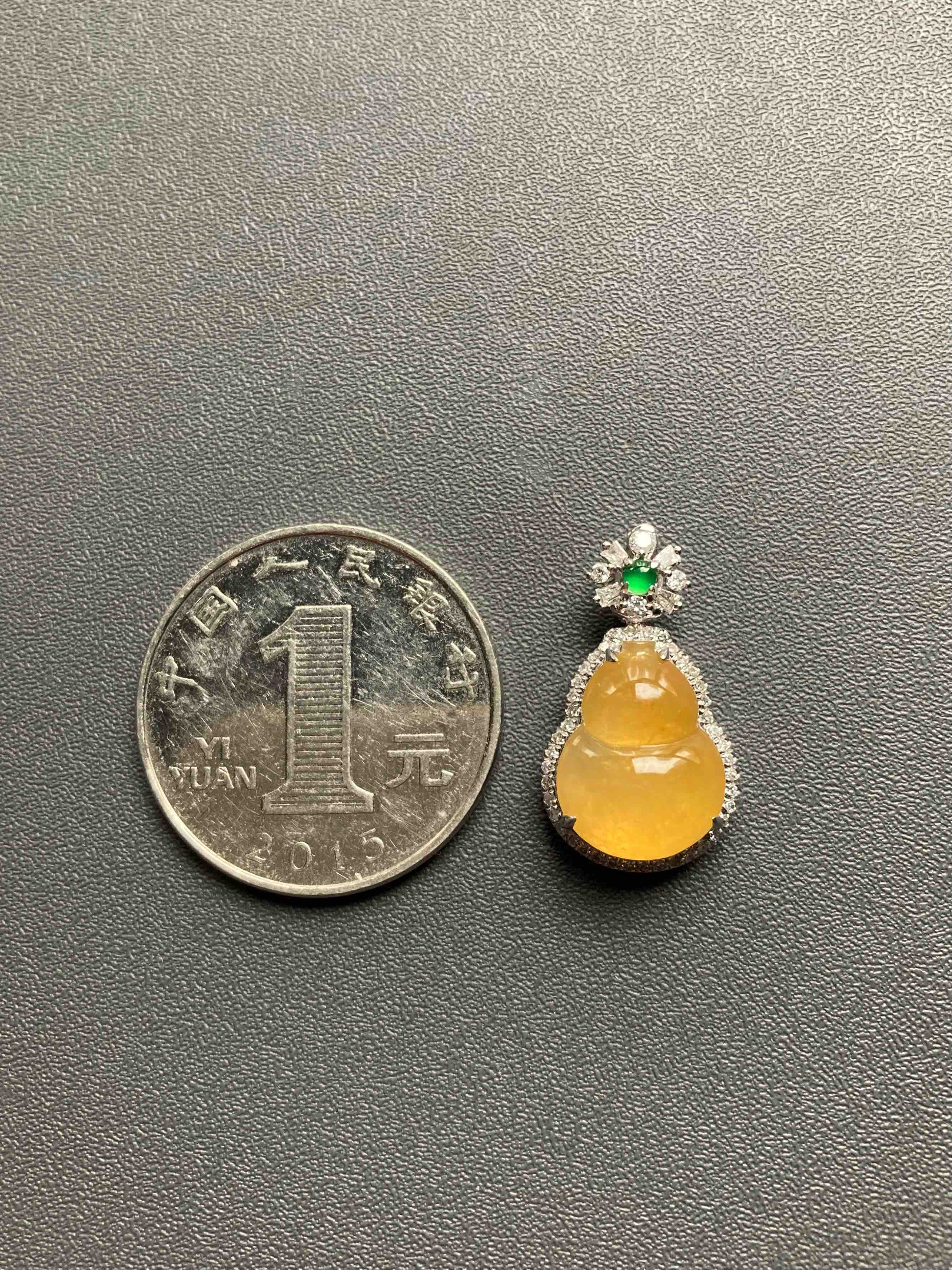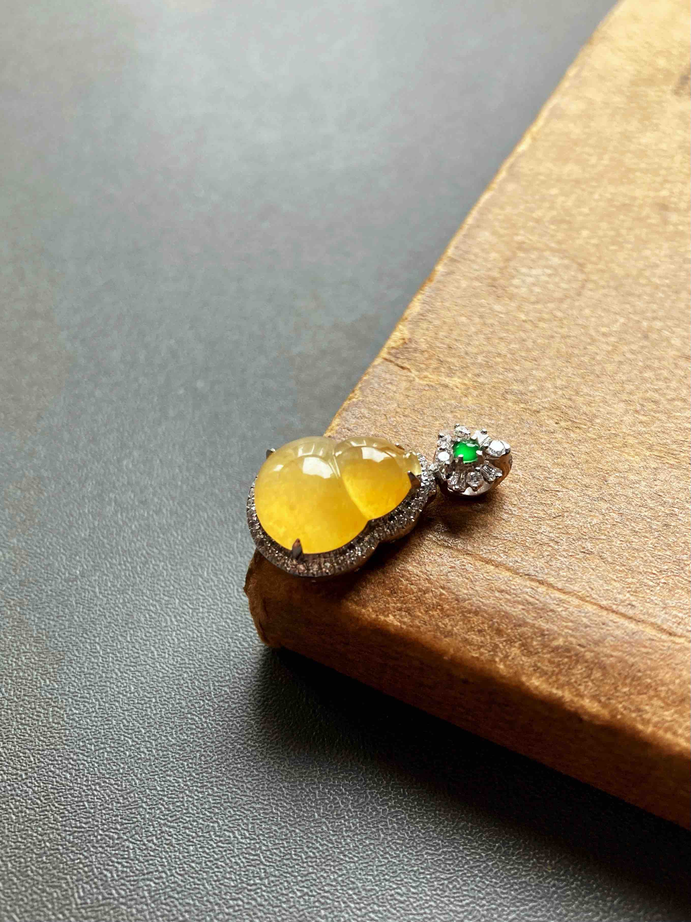 特别罕见的黄翡厚庄翡翠葫芦,黄翡取自原石表层,容易受杂质干扰,大多不厚,能达到这样标本级高冰种艳丽金黄还如此厚实可谓十分稀有,18k白金钻石镶嵌,阳绿蛋面扣头,高货后开盖款式,宝物圆润饱满,福气满满,让人一见倾心,收藏级别的东西,只要四位数,错过不再有,葫芦13.7×10.5×4.3mm,镶嵌后22.5×12.6×8.3mm
