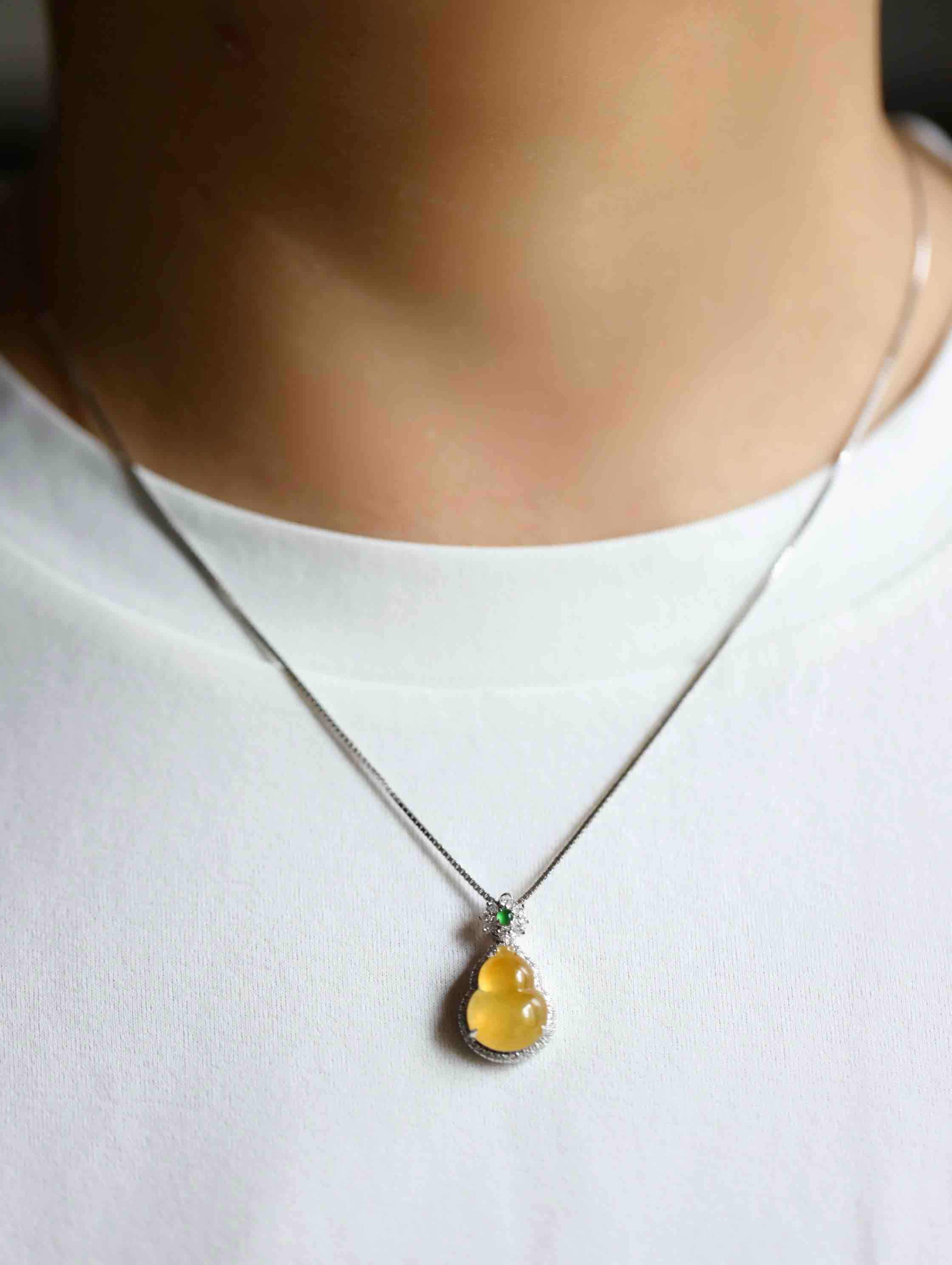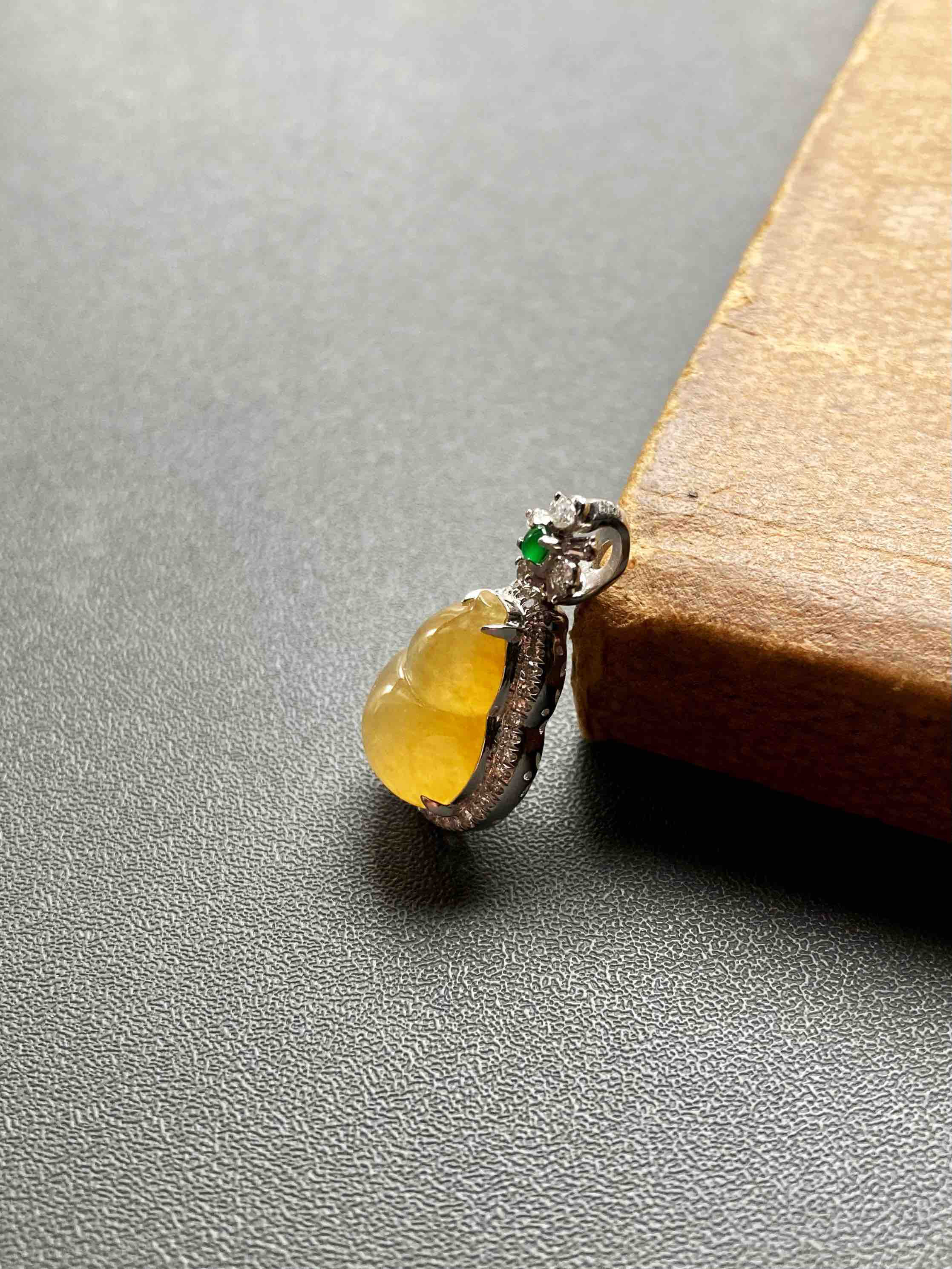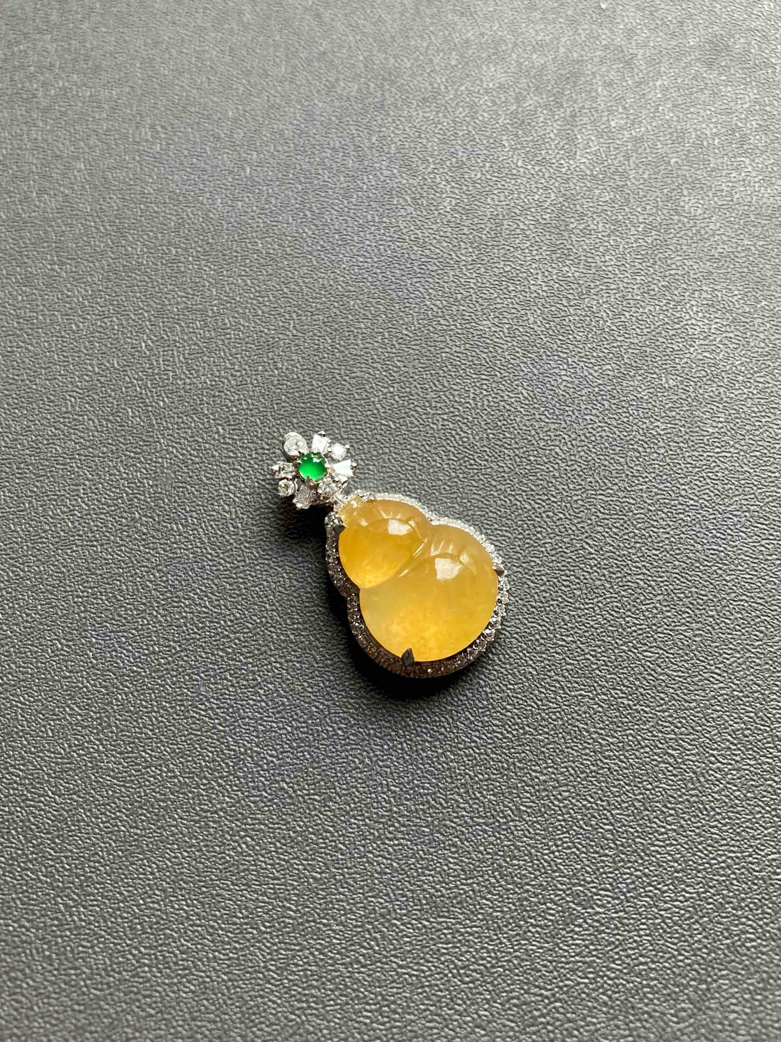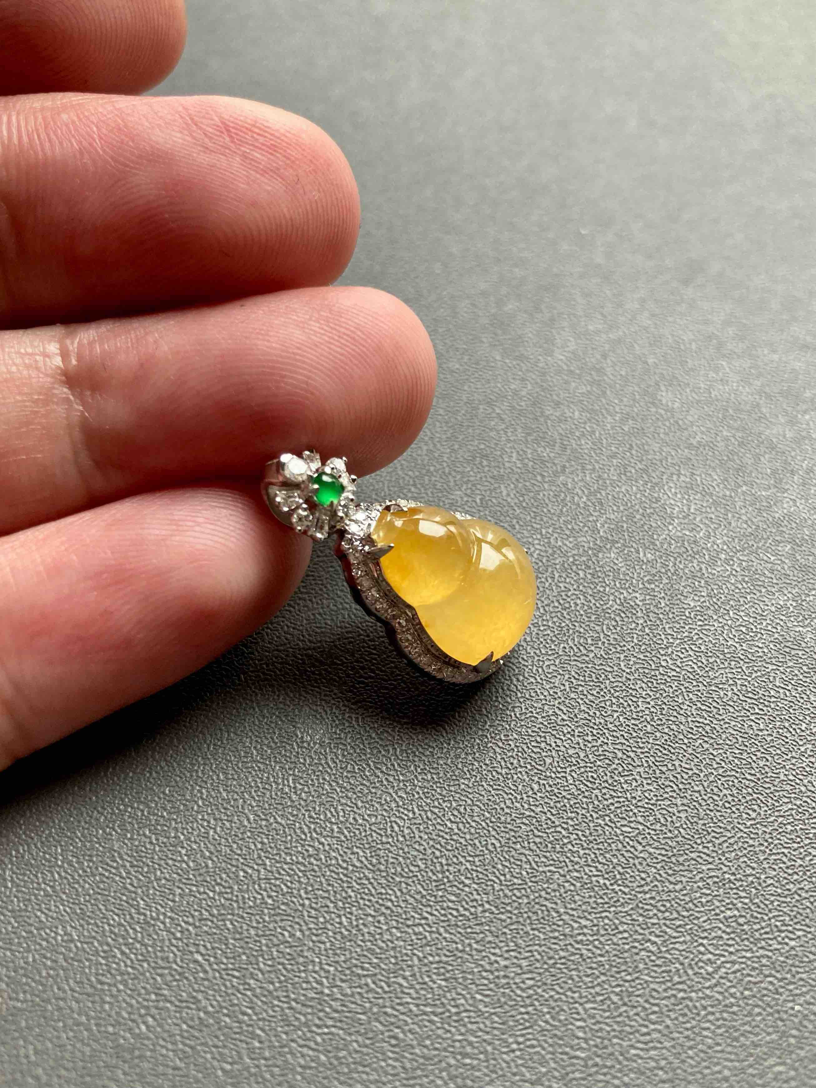 特别罕见的黄翡厚庄翡翠葫芦,黄翡取自原石表层,容易受杂质干扰,大多不厚,能达到这样标本级高冰种艳丽金黄还如此厚实可谓十分稀有,18k白金钻石镶嵌,阳绿蛋面扣头,高货后开盖款式,宝物圆润饱满,福气满满,让人一见倾心,收藏级别的东西,只要四位数,错过不再有,葫芦13.7×10.5×4.3mm,镶嵌后22.5×12.6×8.3mm