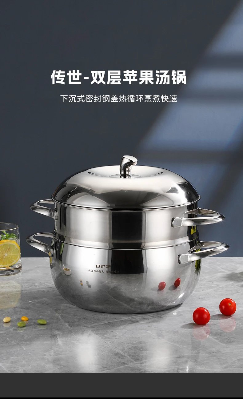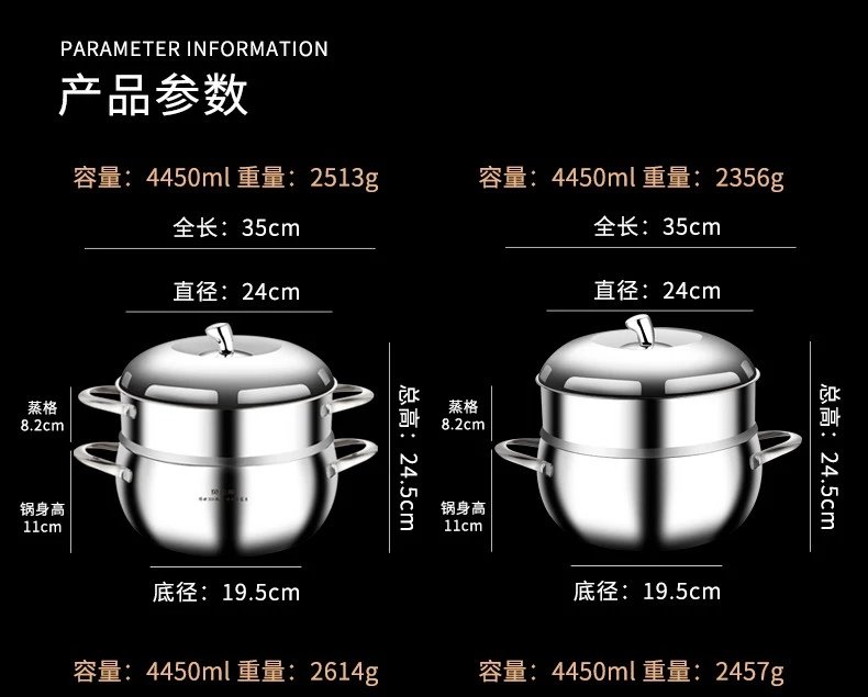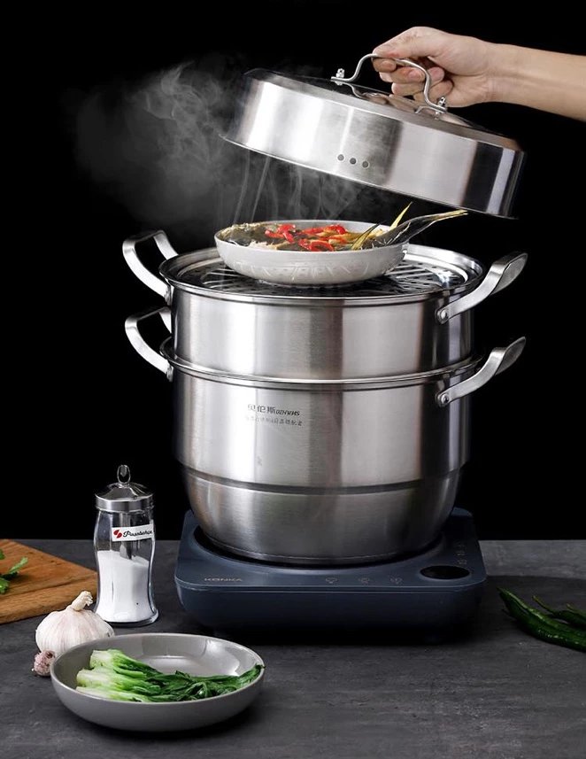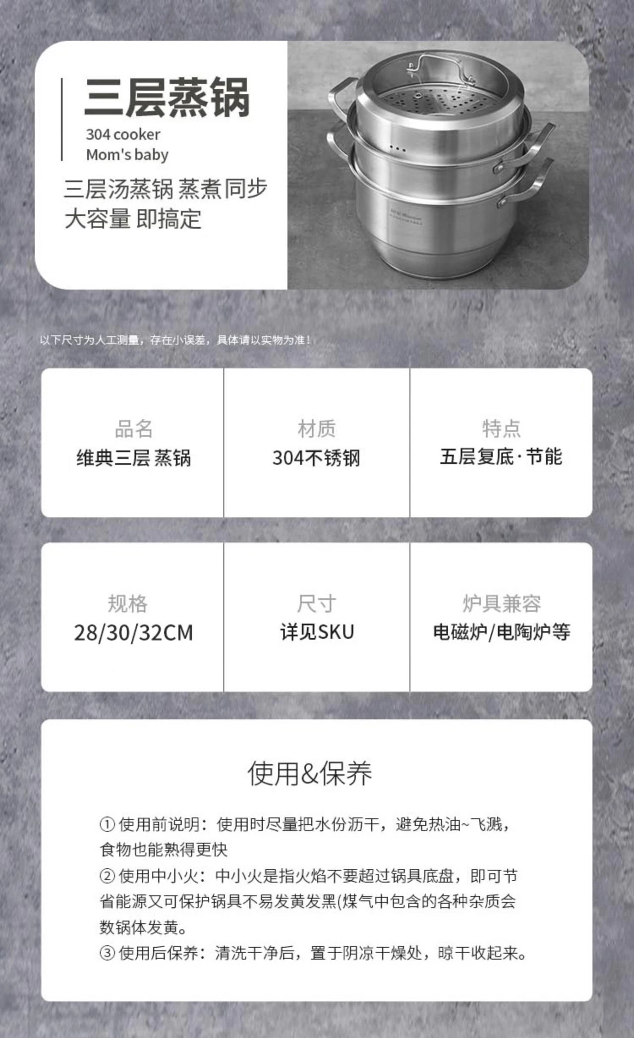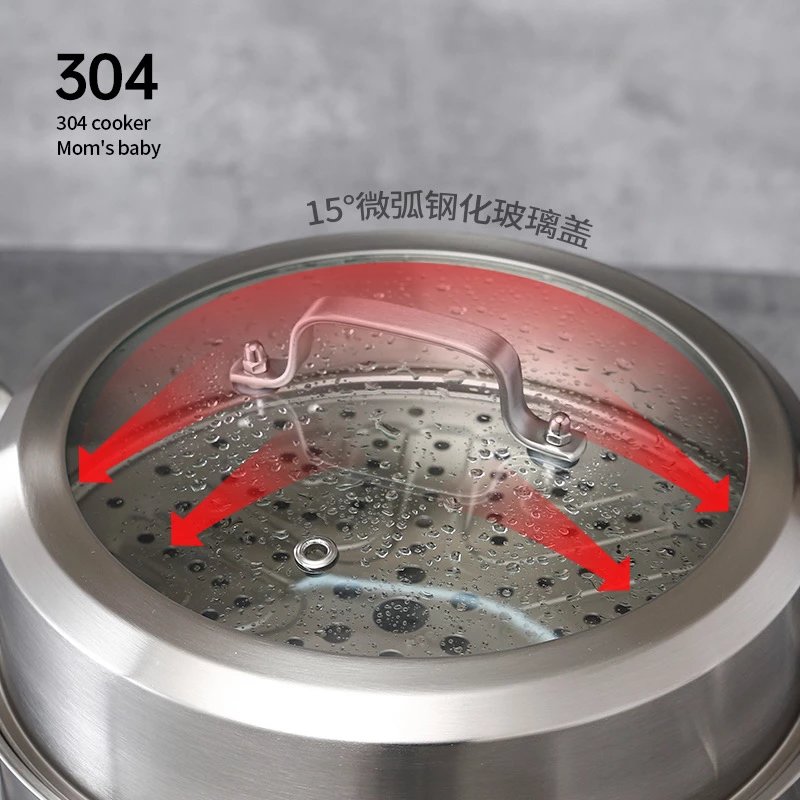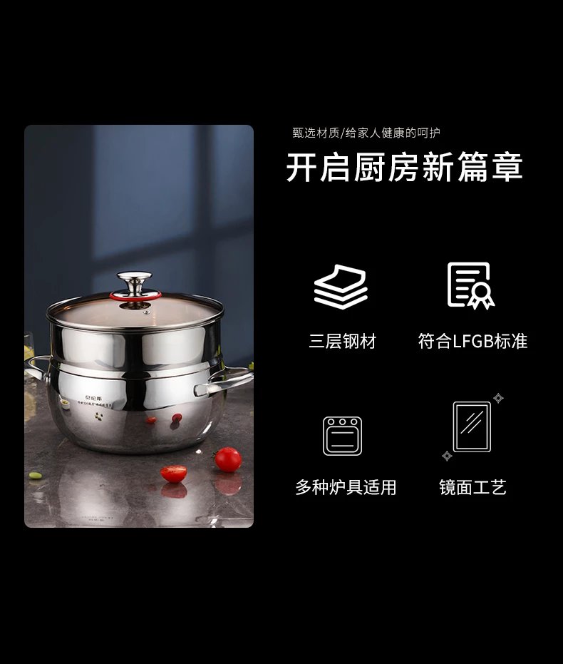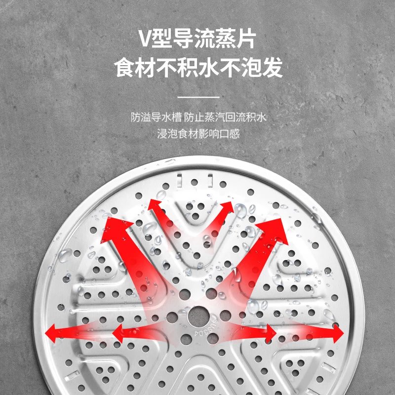 ✅全锅身采用食品级一体成型304不锈钢 ✅三层大容量蒸煮空间,全家够用 ✅V型导流蒸片,食材不积水不泡发 ✅专利五层加厚复合底,各路硬菜都蒸的超快 ✅锅壁有刻度线,锅界中的一把尺