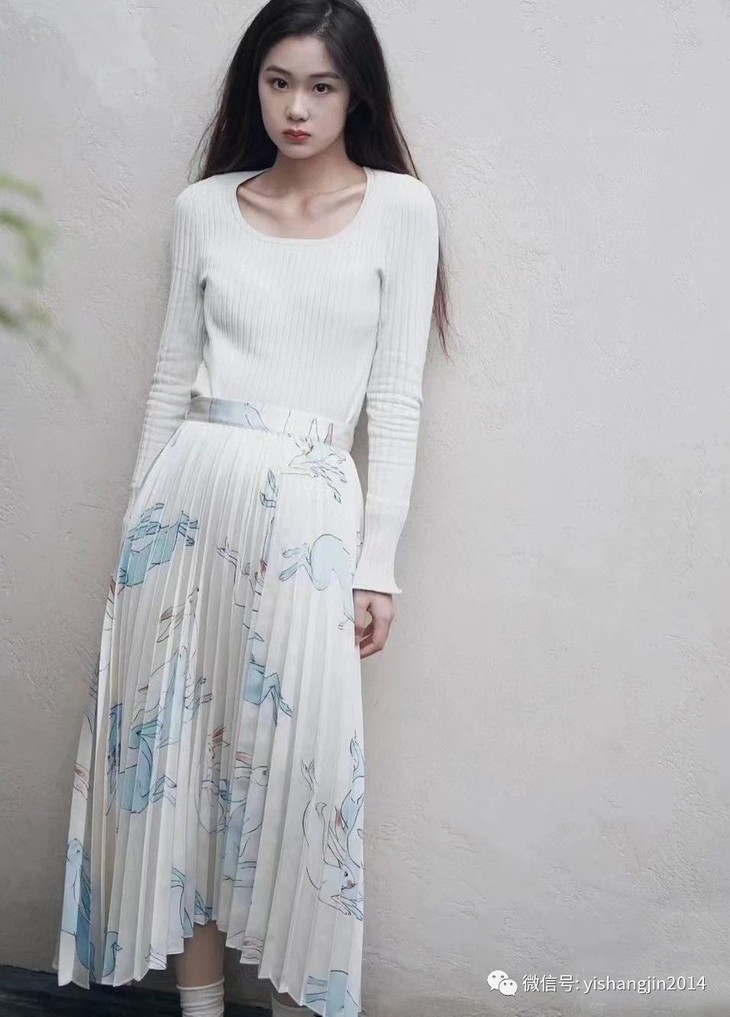A字版型,不规则过膝长裙包容性好,露出更多的小腿部分,视觉上更显轻盈,瞬间显高,同时整体压太阳花褶设计,百褶上小下大逐渐延伸,视觉上进一步拉伸腿部线条。