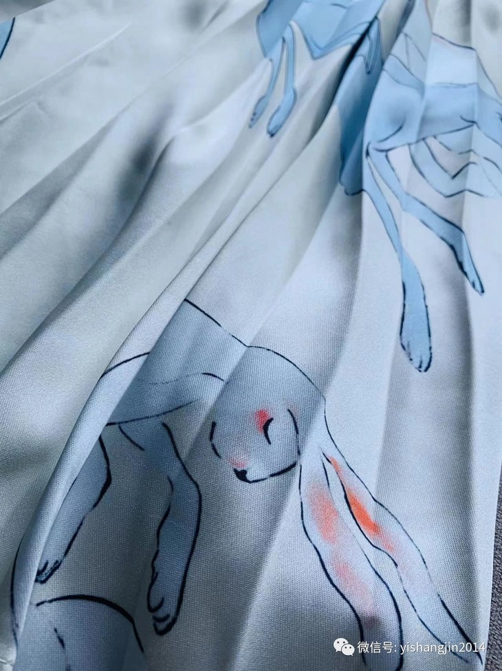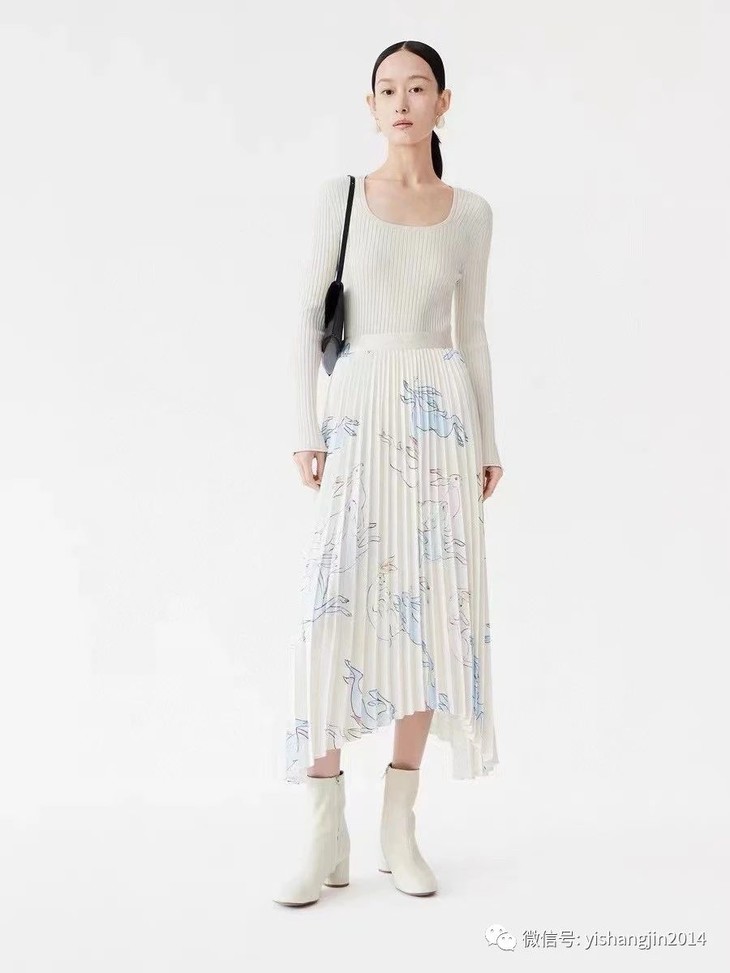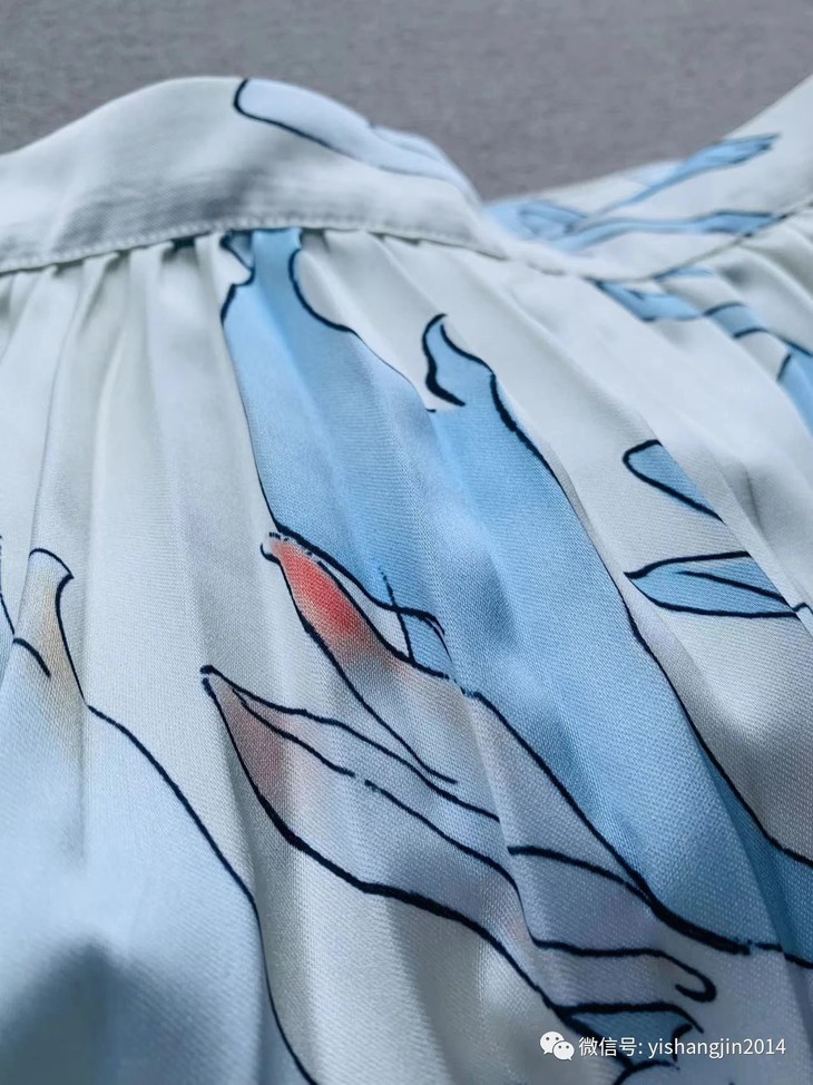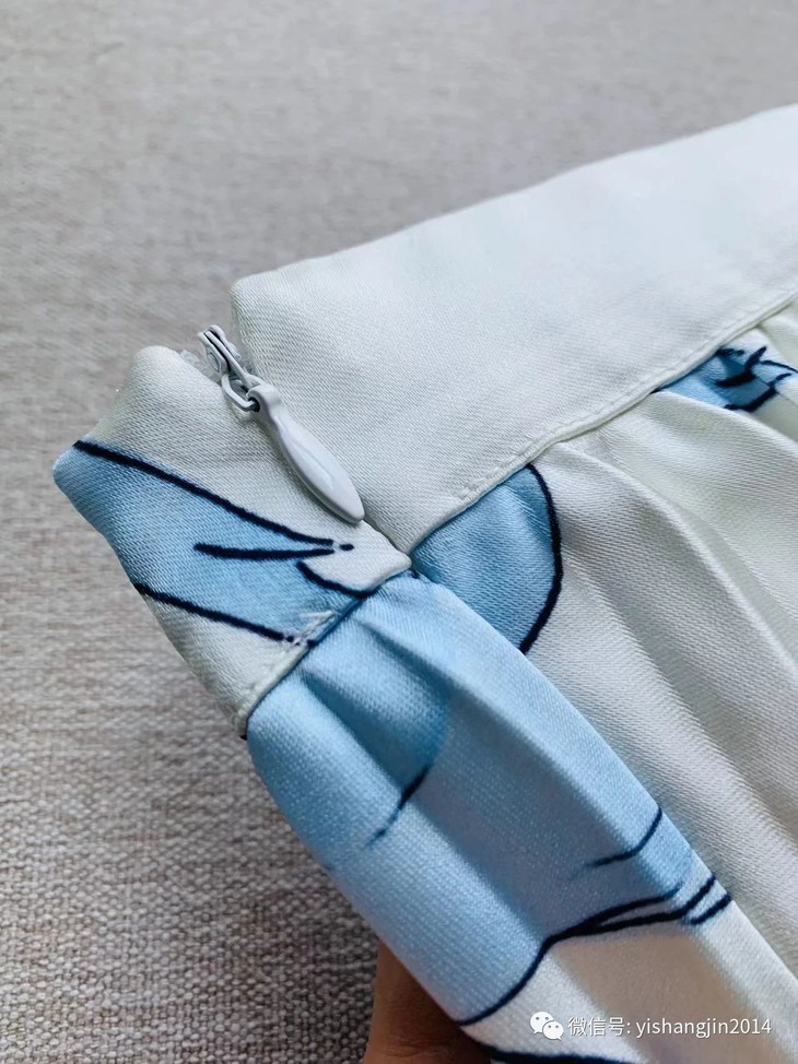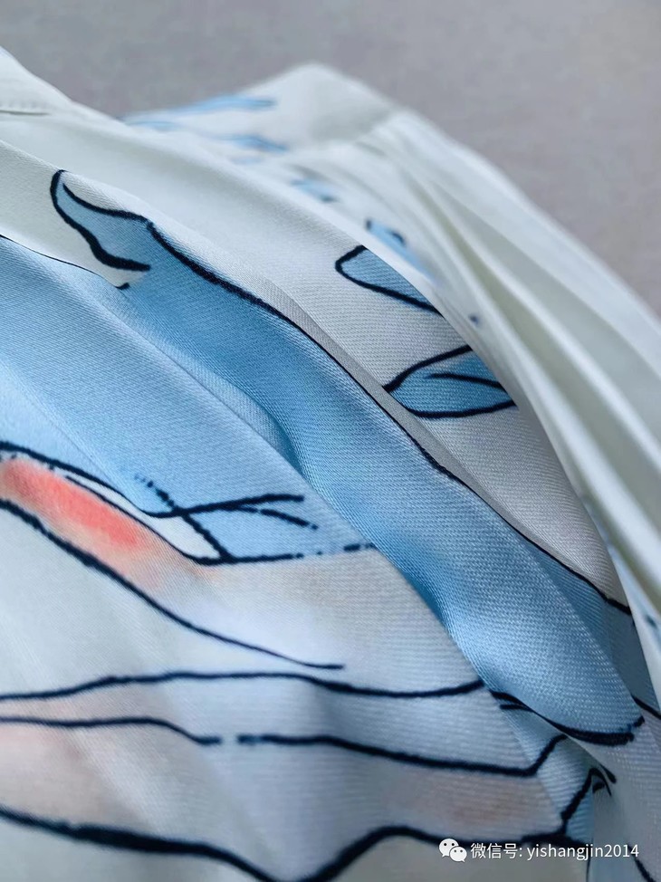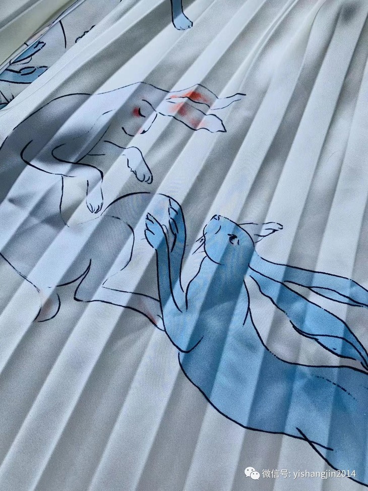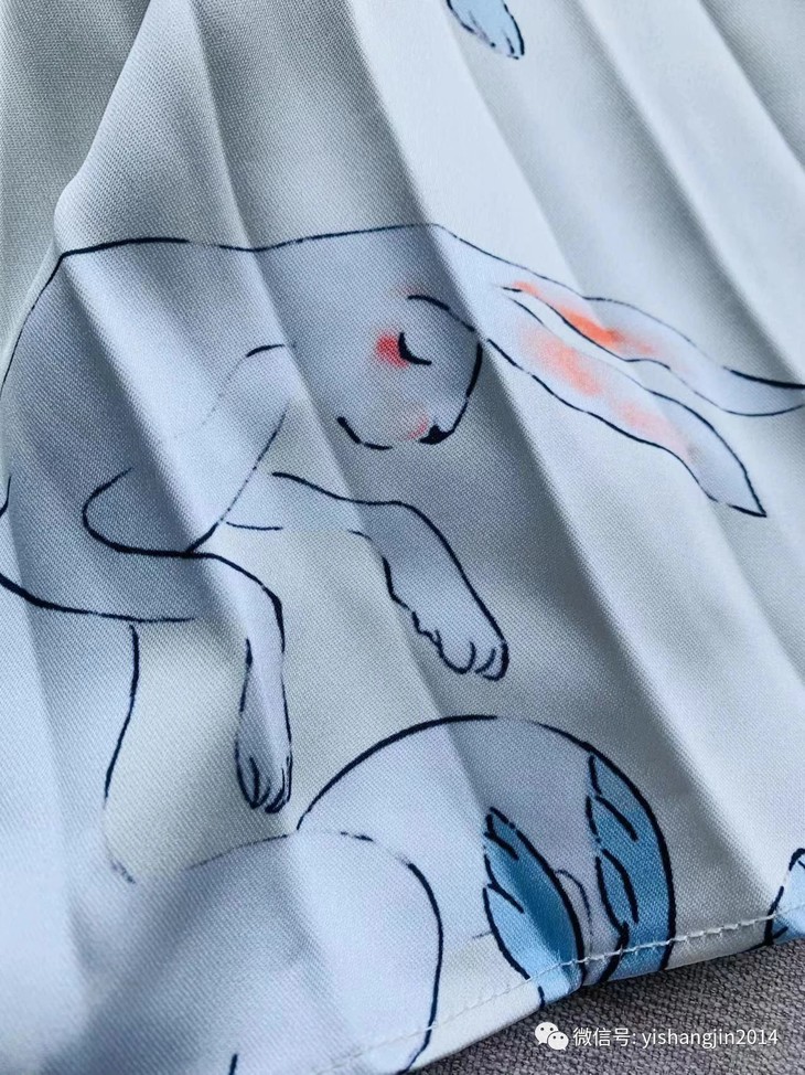 23夏季新款,专柜1899元,这款裙子最妙的是印花,灵感出自宋代著名词人谢薖的“坐待丹山飞玉兔”,活灵活现的“丹山玉兔”印花图案,中西合璧的设计元素,新中国风的feeling,令人十分惊喜。
