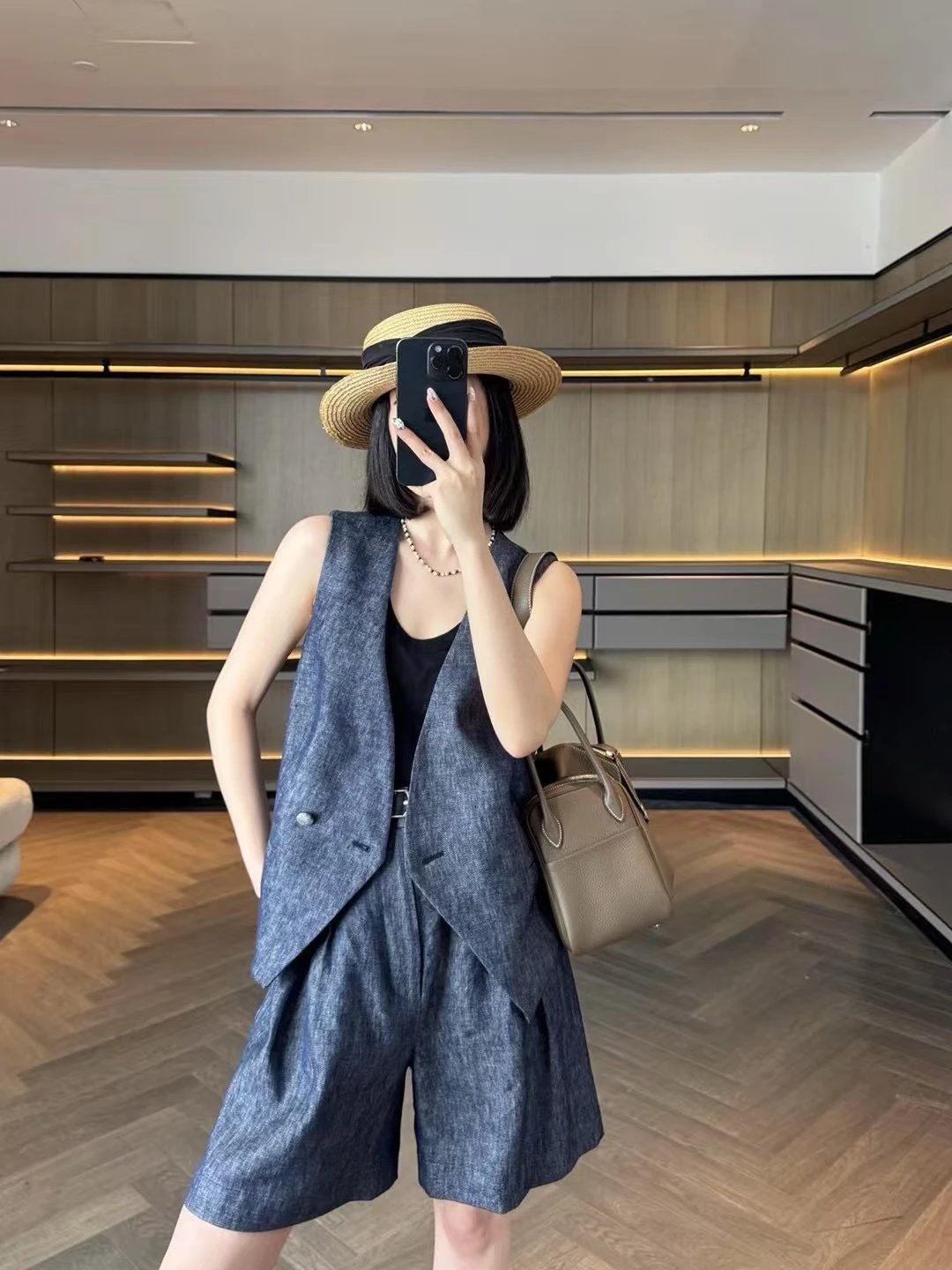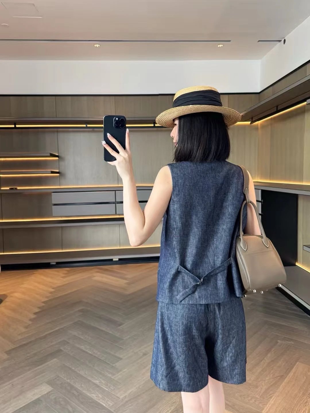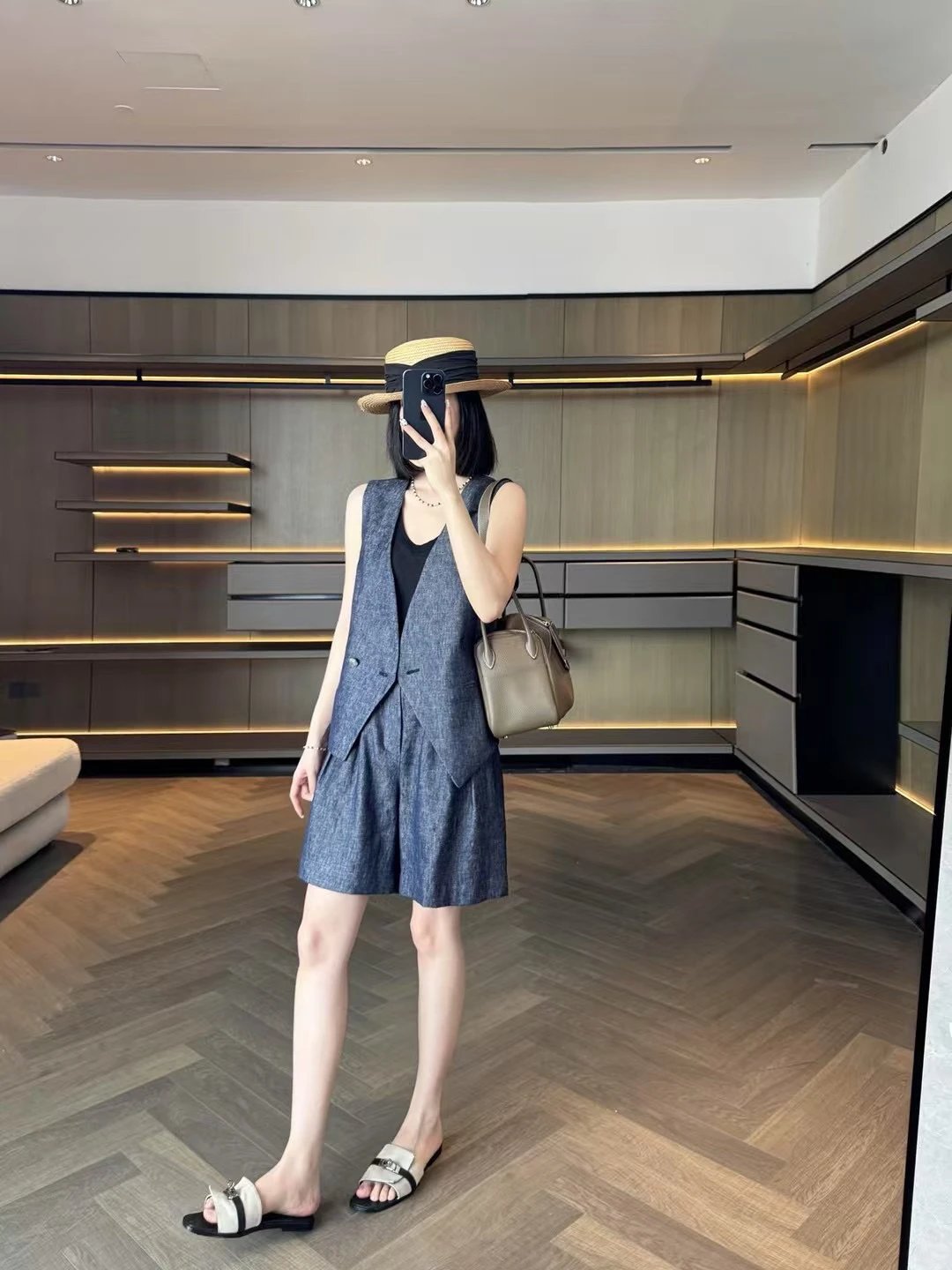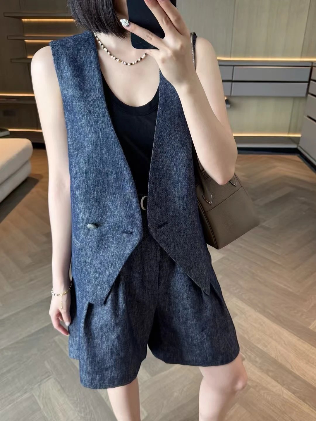实际库存 售完无补 真丝亚麻牛仔套装 马甲背心/短裤 日本进口面料 6A级桑蚕丝