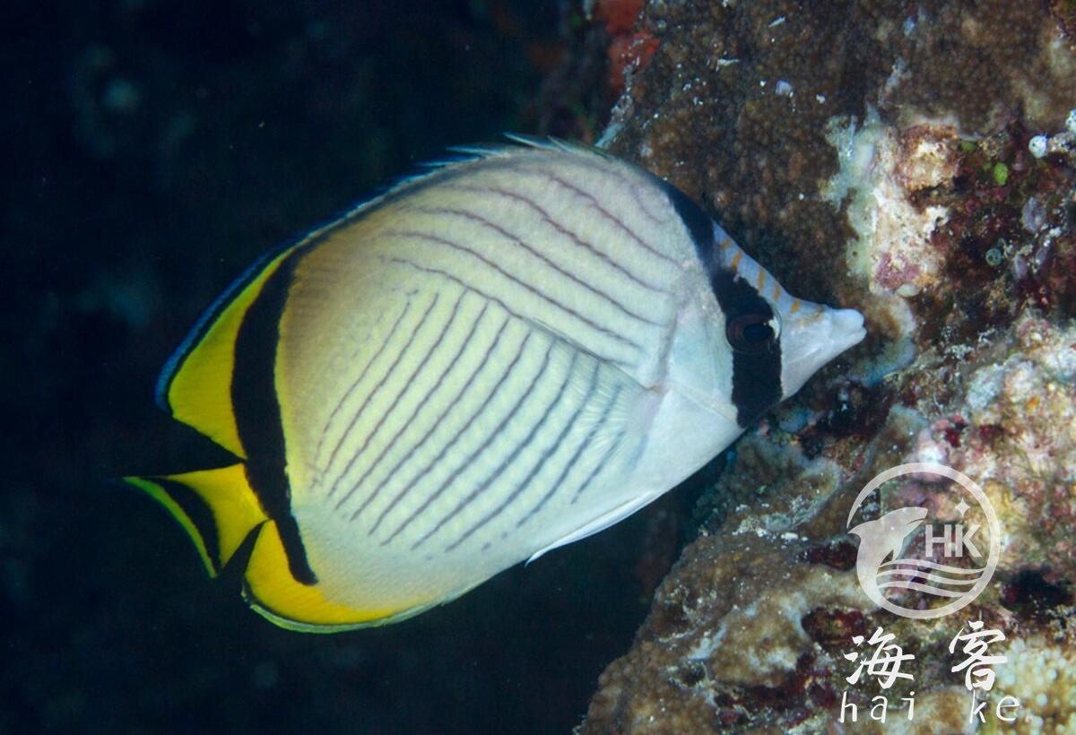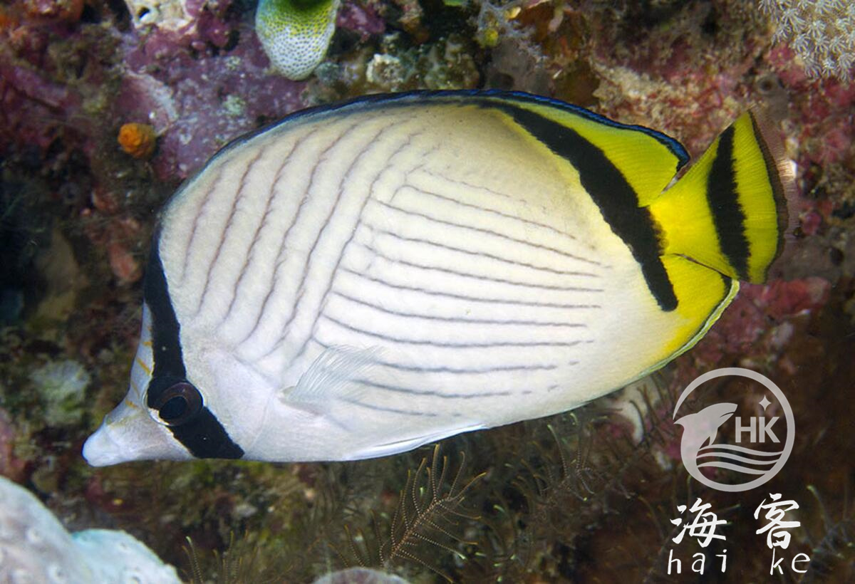 也叫飘浮蝴蝶鱼。身体主要颜色为白色,带有暗色斜纹。眼睛上有黑色条纹穿过,背鳍、尾鳍及臀鳍是黄色带两条黑色条纹。