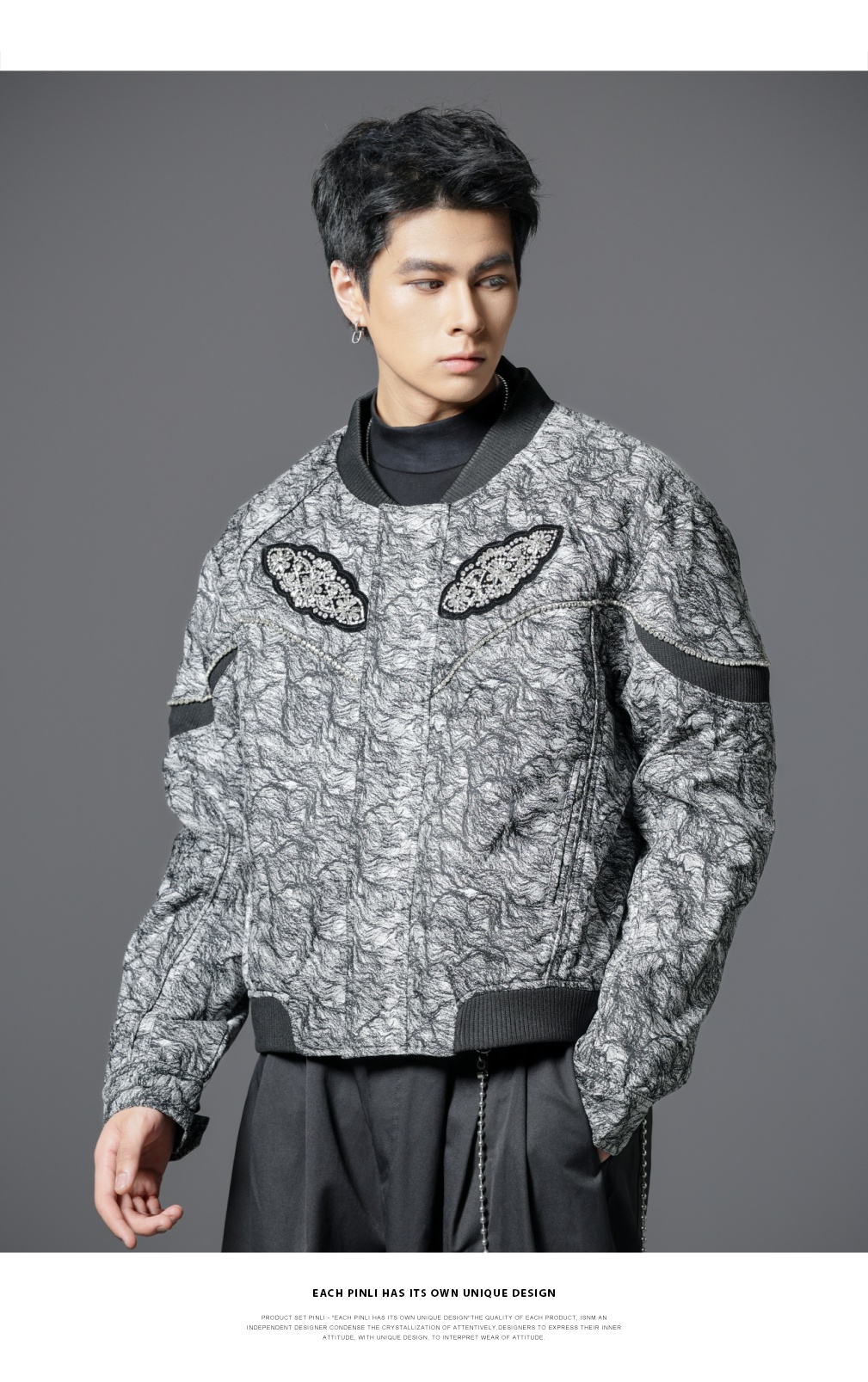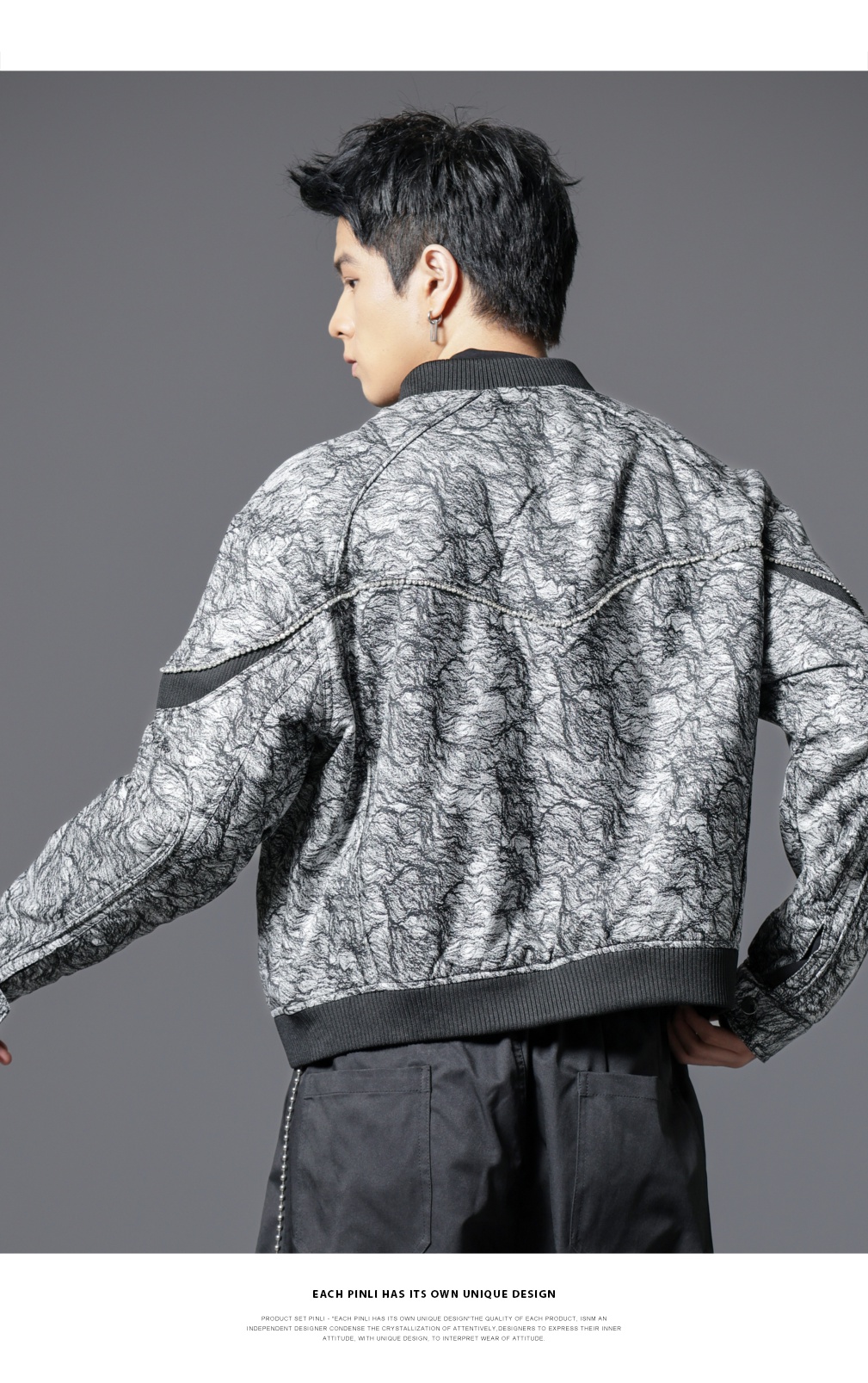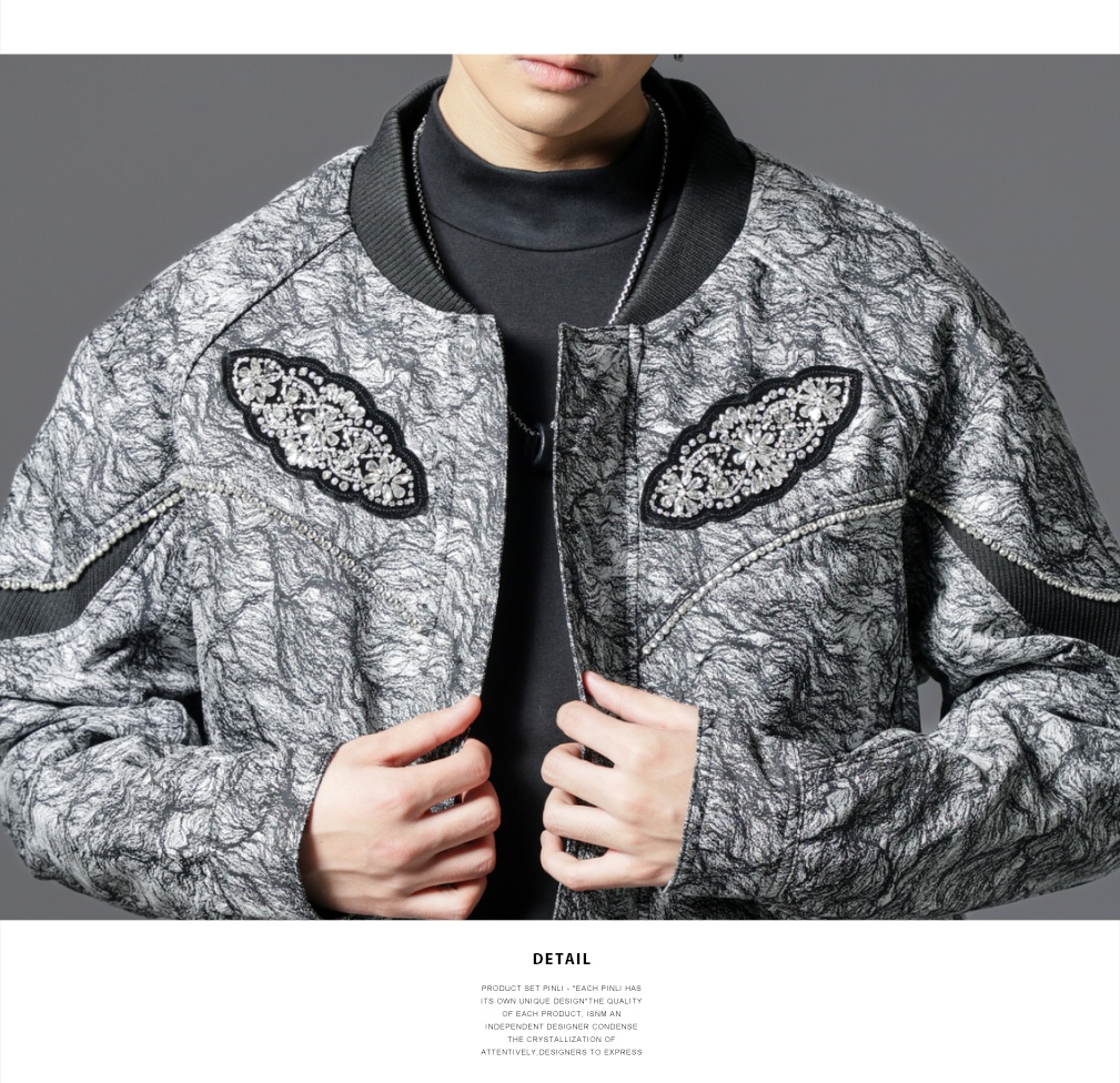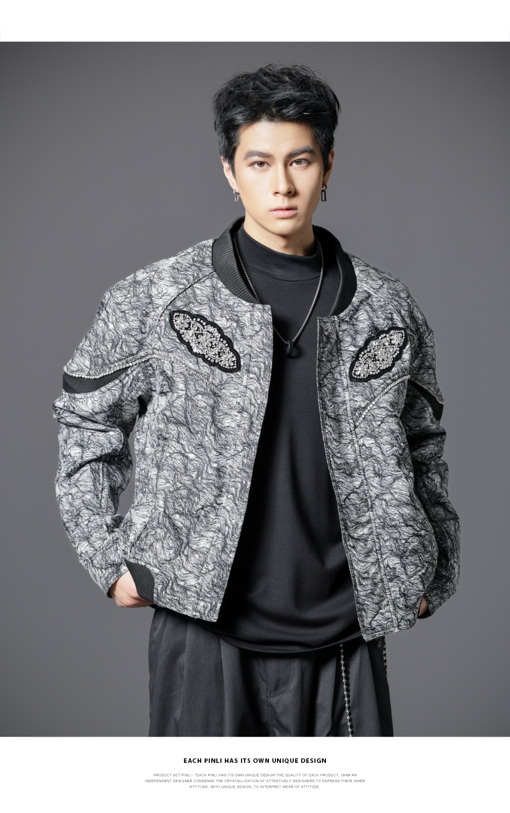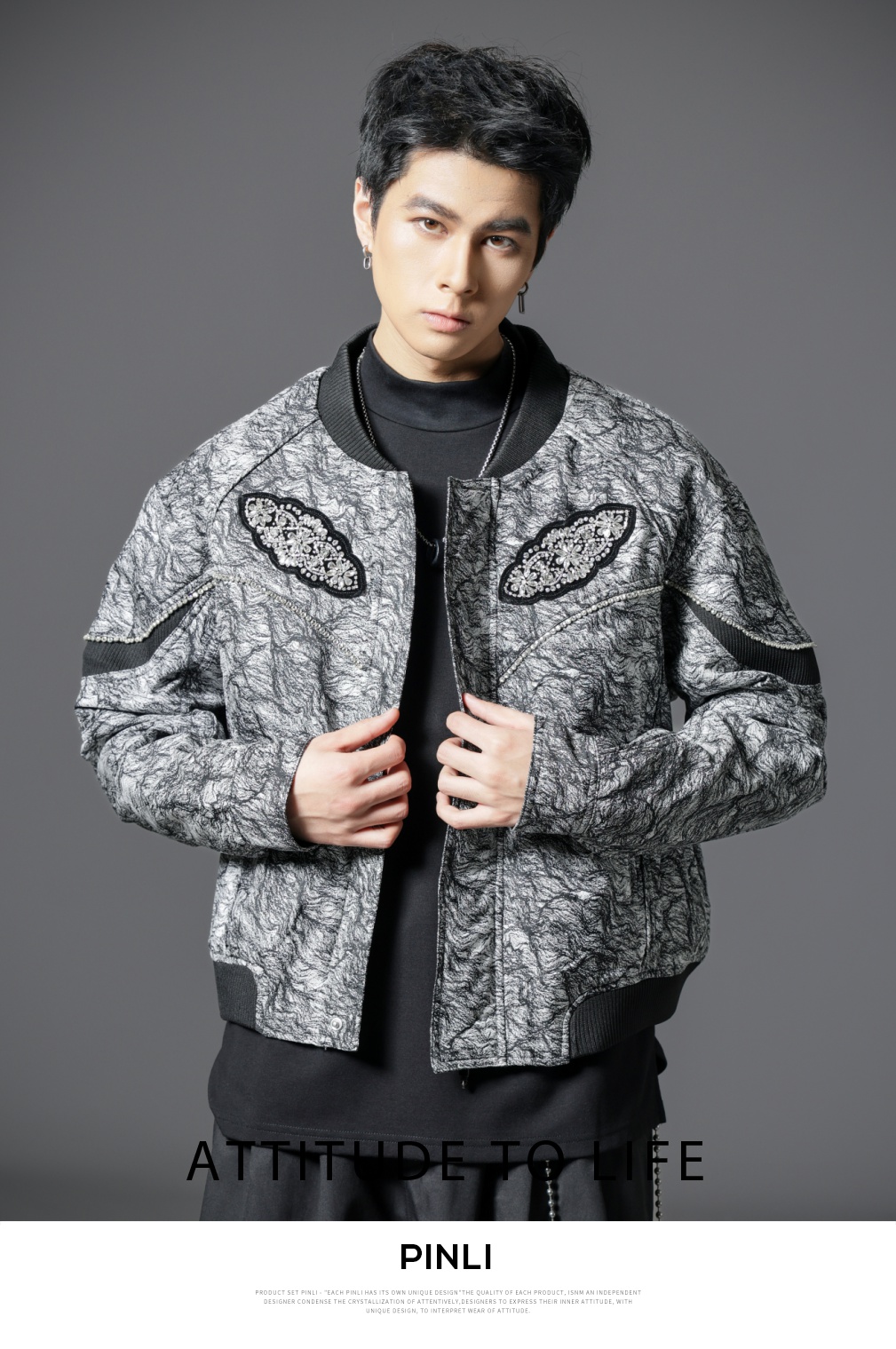 PINLI品立2025冬季新款男士棒球领贴布烫钻棉衣棉服夹克外套潮牌B253105016