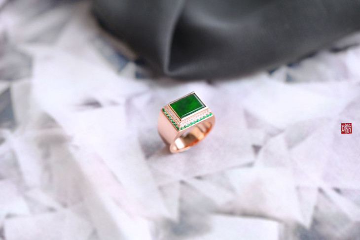 玻璃种正阳绿的蛋面,种老,色阳,超美,存了很久的绿蛋,也是心心念念要做一个特别的款。在配镶宝石的材质和用金的色上产生微妙的变化,用玫瑰金,密镶小白钻,露珠钉镶嵌更大一些的祖母绿,层层梯状而下。映衬蛋面华丽而不失复古的别致美感。整件珠宝的款式,佩戴起来,卓尔不群,高贵非凡。