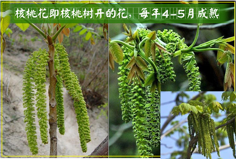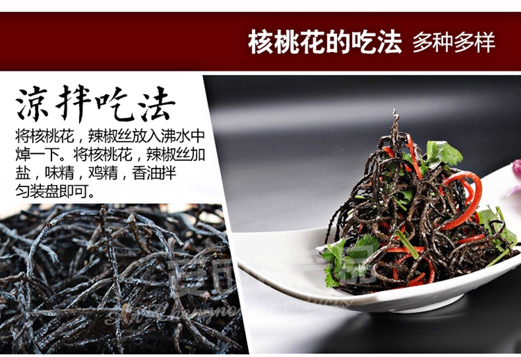 核桃花即核桃花柱,又称核桃纽,长寿菜,龙须菜。是采用野生新鲜、质嫩,去掉须花,色泽呈天然绿色的核桃花朵嫩茎作原料,表面淡棕色或深黑色,还原后呈绿色或灰色.恢复其天然形态及色、香、味和营养成份。