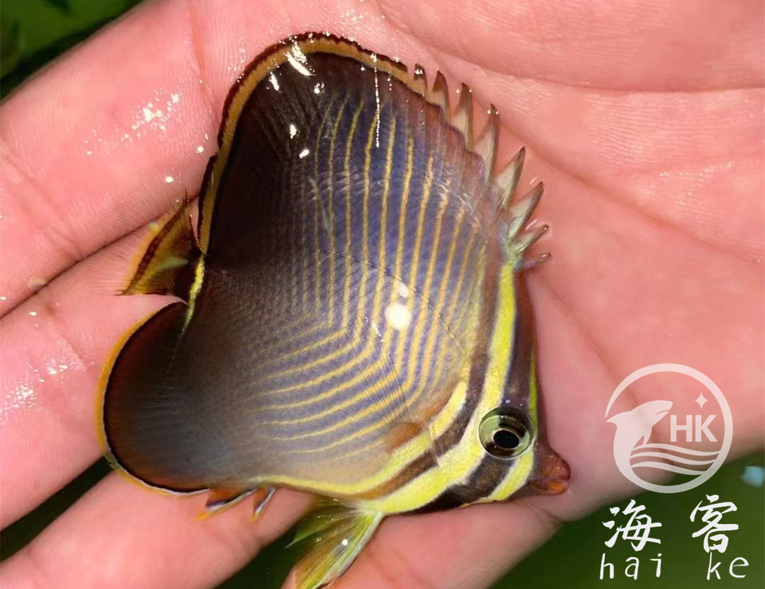 也叫红海天皇蝶。头部棕黄色,身体蓝白色带有数条“<”的白色条纹,尾部和身体末端是黑色带白边。
