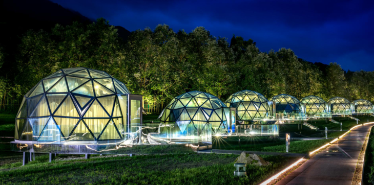 充满未来感的半球形外观,由三角形蓝色玻璃拼接而成,手绘星空墙面,如同浩瀚宇宙,每间房内都有一架天文望远镜,仰观宇宙之大,星空触手可及。