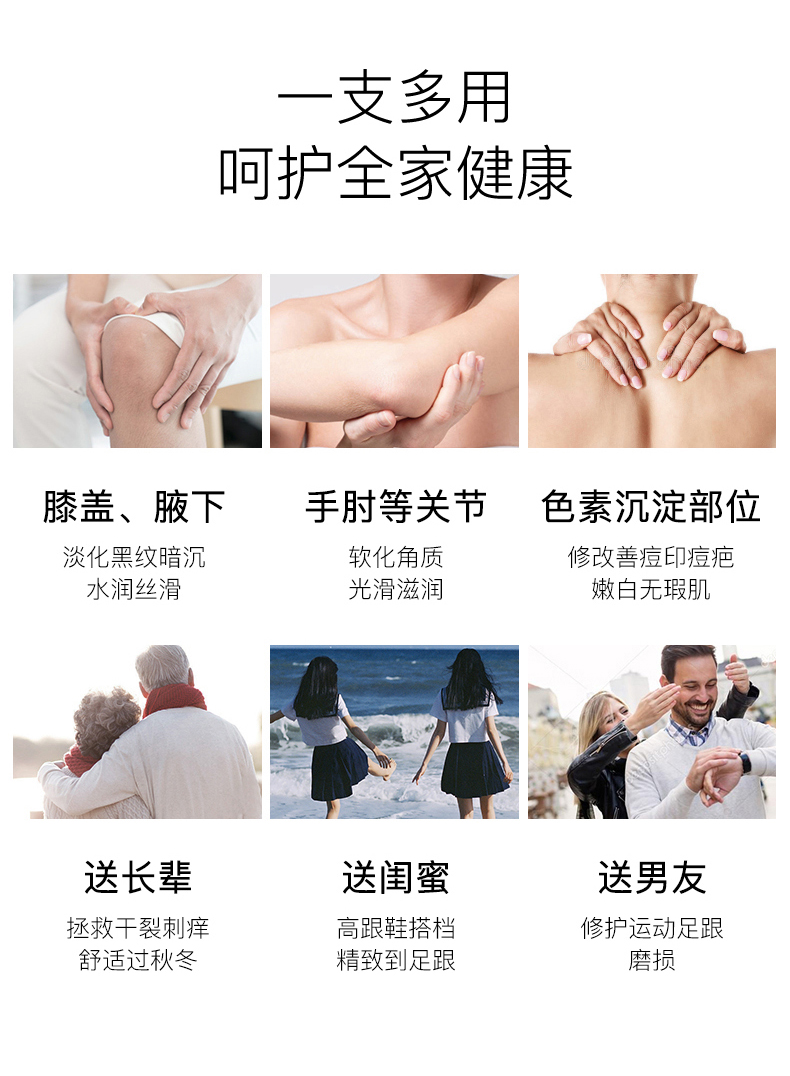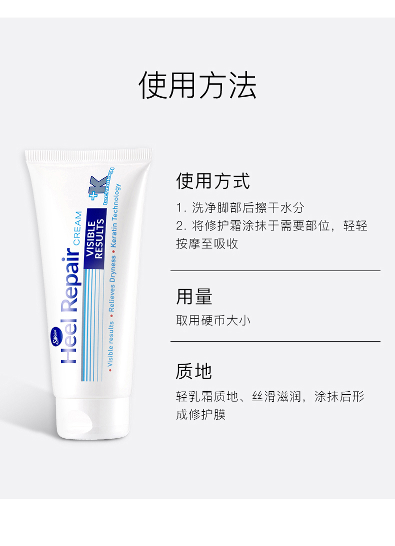 【使用方法】①温水泡脚软化角质②用磨脚石去除老废角质③涂抹干裂部位1-2次④按摩充分吸收效果更佳