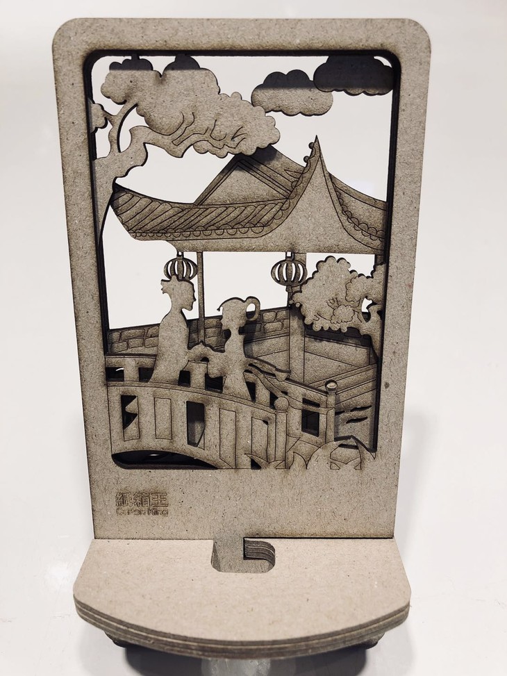 纸箱王®原创设计出品,福州限定版名为福州万象。灵感来源于福州保存最好的水榭戏台,在三坊七巷衣锦坊的古厝里,古色古香、余音绕梁,让周边居民为之骄傲,令游客们如痴如醉、流连忘返。手机支架由纸浆压制而成,激光微雕技术成型,轻巧易携带,环保且耐用。保留纸制品固有颜色,除了让使用者感受“原汁原味”也为其留下自由创作的空间。