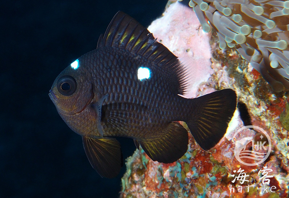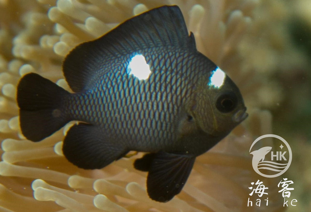 身体黑色,带有三个白色的点。成鱼后会很凶猛,白色斑点会消失,并开始与地毯海葵建立共生关系。