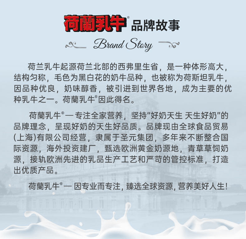- 荷兰乳牛品牌于1990年进入中国,相伴31年始终致力于为更多家庭奉上优种荷兰乳牛带来的营养与美味。秉承“珍选至纯营养,传承经典醇香”的理念,打造一个覆盖全人群、多品类、高品质的国际化品牌。