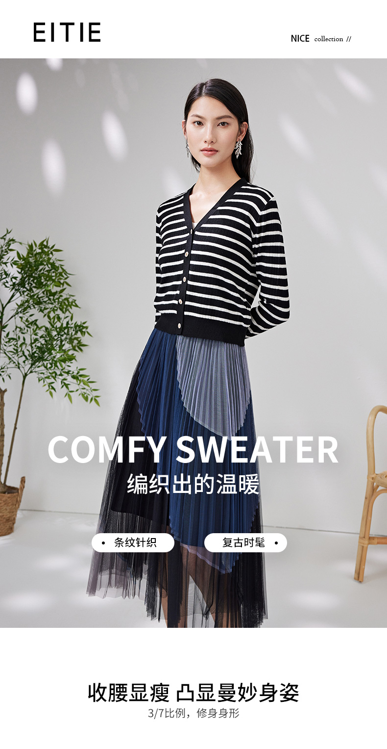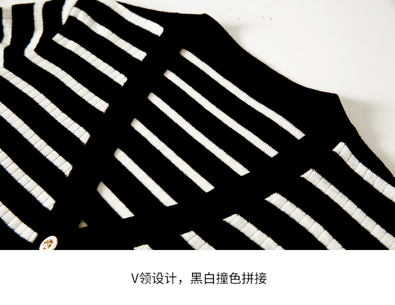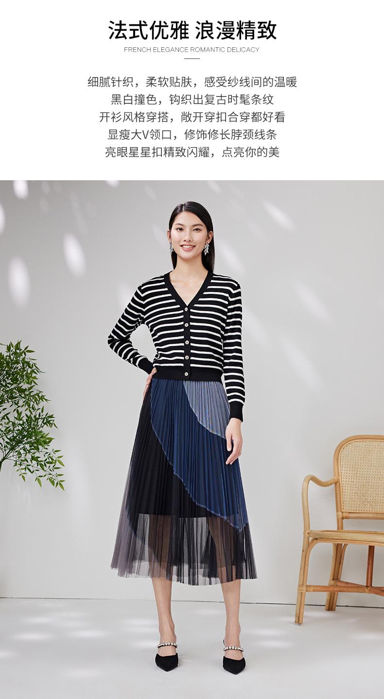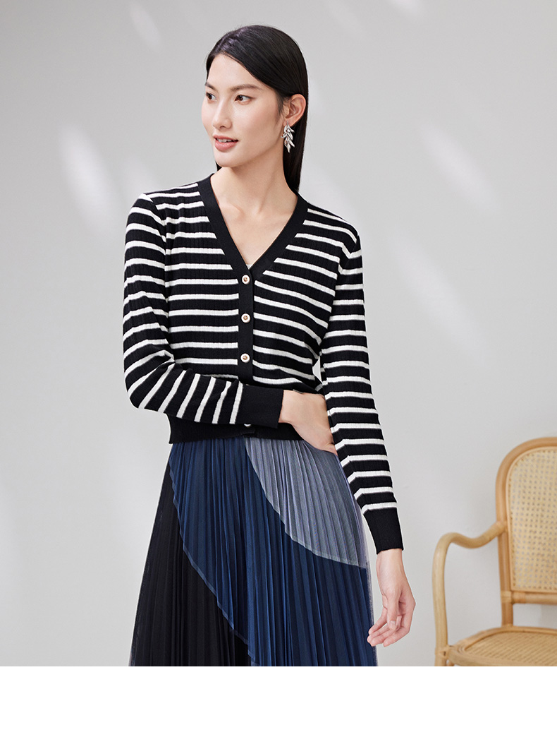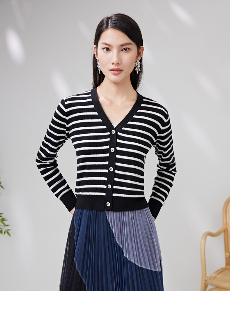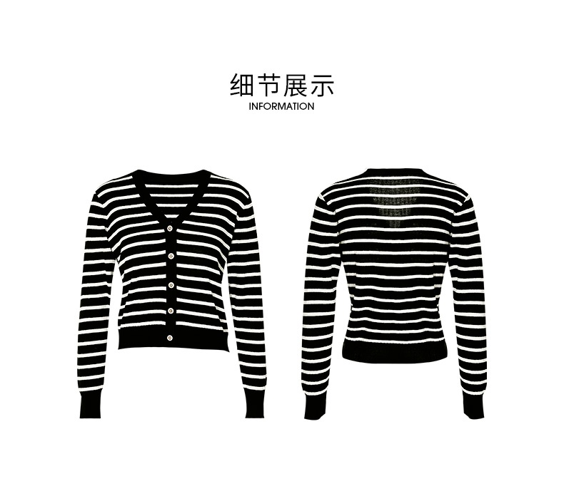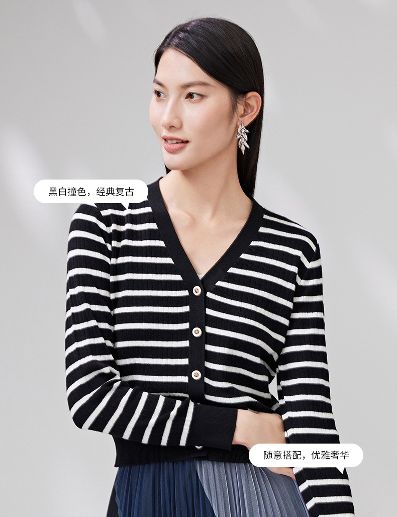 EITIE爱特爱春季新款黑白撞色条纹显瘦百搭基础简约针织开衫A2301103