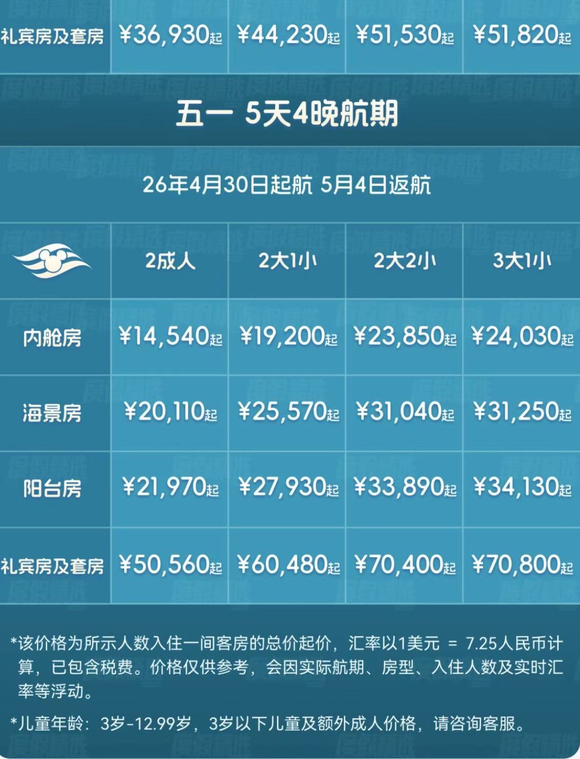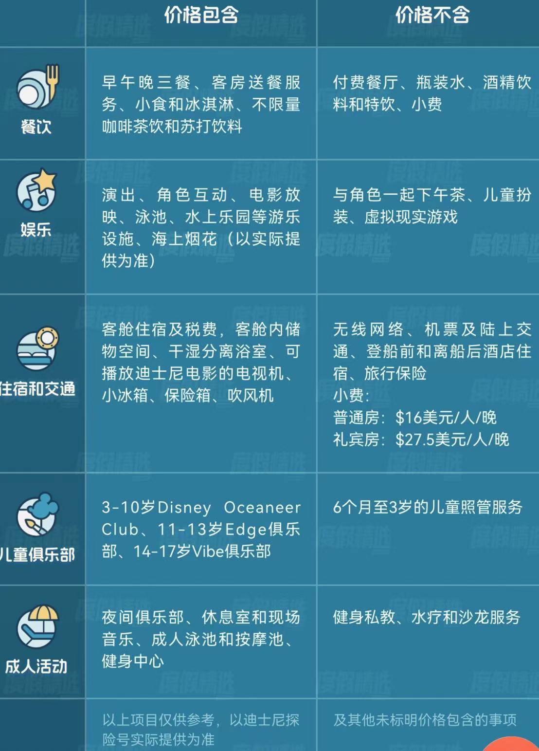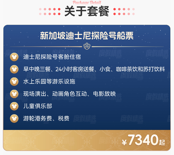 套餐仅含新加坡迪士尼探险号代订订金,并不构成实际行程预订,下单后请联系客服;新加坡迪士尼探险号价格表仅供参考;实际价格可能会受预订时间、入住日期、汇率浮动及房态等多种因素影响而产生变化,价格以最终预约成功后实际价格为准;新加坡迪士尼探险号预约时所提供船期、房型、人数所有出行人姓名拼音、性别、出生年月日等信息,皆为官方预订所需必要信息,请如实提供;此套餐内项目不可折现,不可拆分使用,不可与其他优惠同时使用;购买此套餐视为认同以上声明及活动规则。