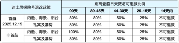 未预约新加坡迪士尼探险号或预约失败,可免费退款;预约后,非首航航次的内舱房、海景房及阳台房可在免费取消期内取消订单,所支付订金和首期款全部退回:首航航次的全部房型和全部航次的礼宾房型,预订一经确认订金及首期款不予退还预约时,每间客房须提供一位主要出行人完整信息,预订成功后主要出行人信息无法修改,修改视为取消订单;免费取消期因船期、房型等因素有所不同,以实际预约时官方政策为准,下图仅供参考,具体请咨询客服