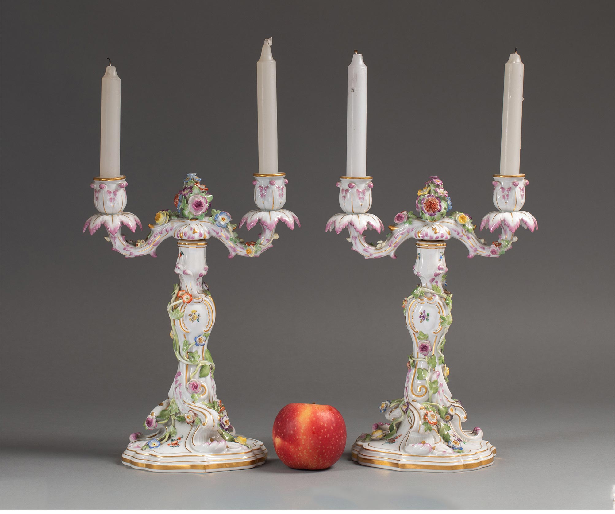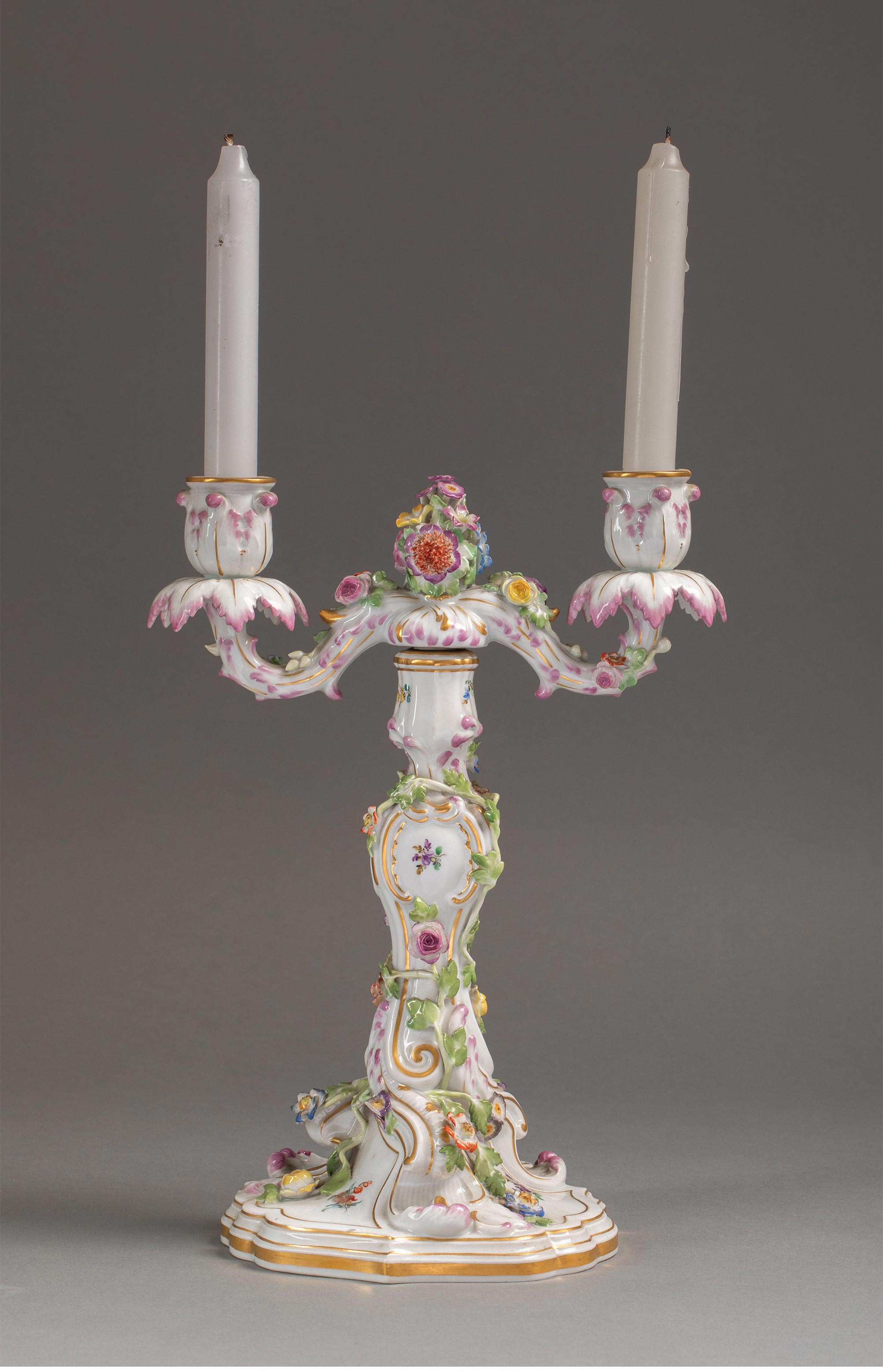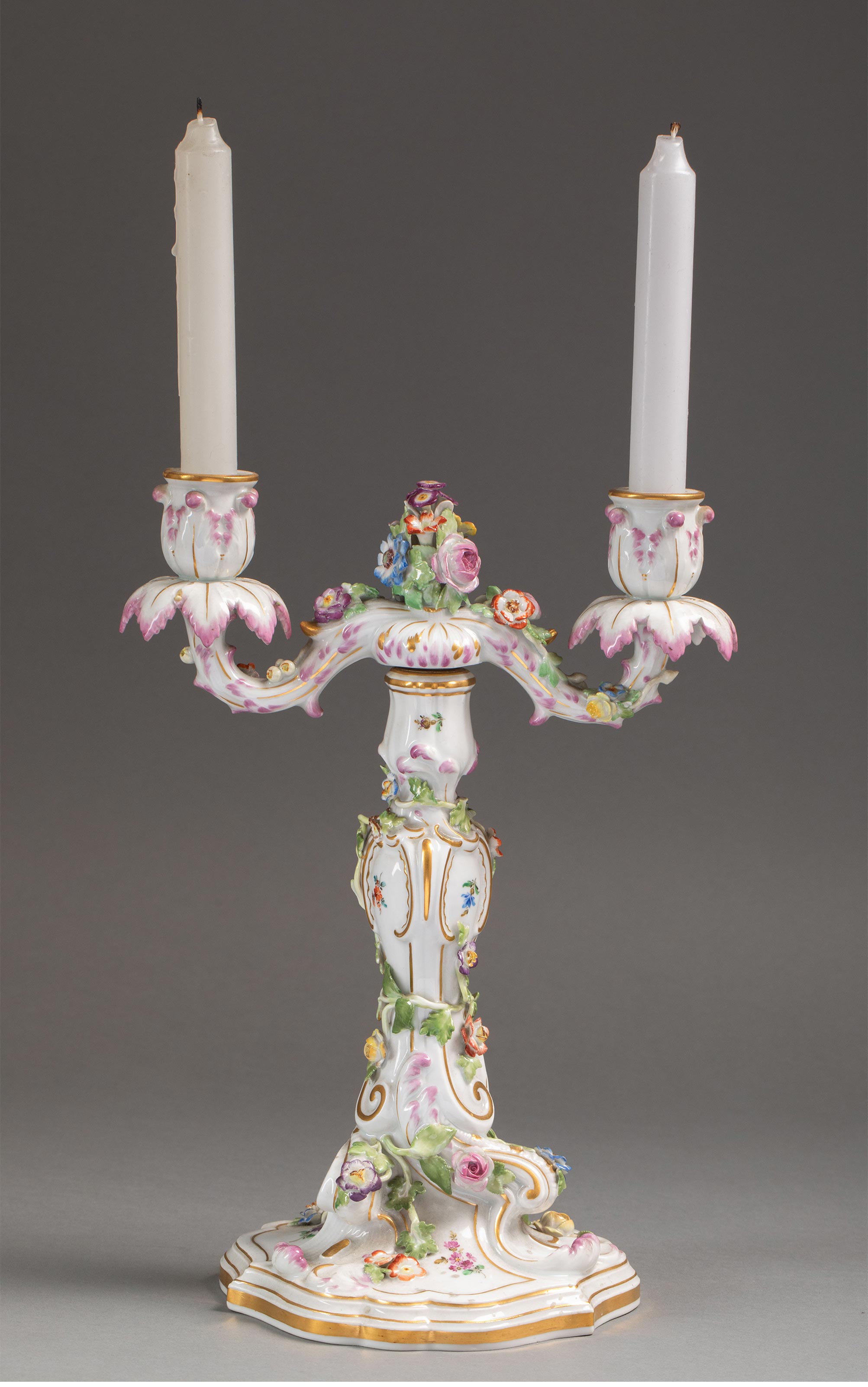 20世纪德国著名瓷窑梅森Meissen出品花卉藤叶主题瓷面浮雕装饰彩绘描金双枝头烛台一对