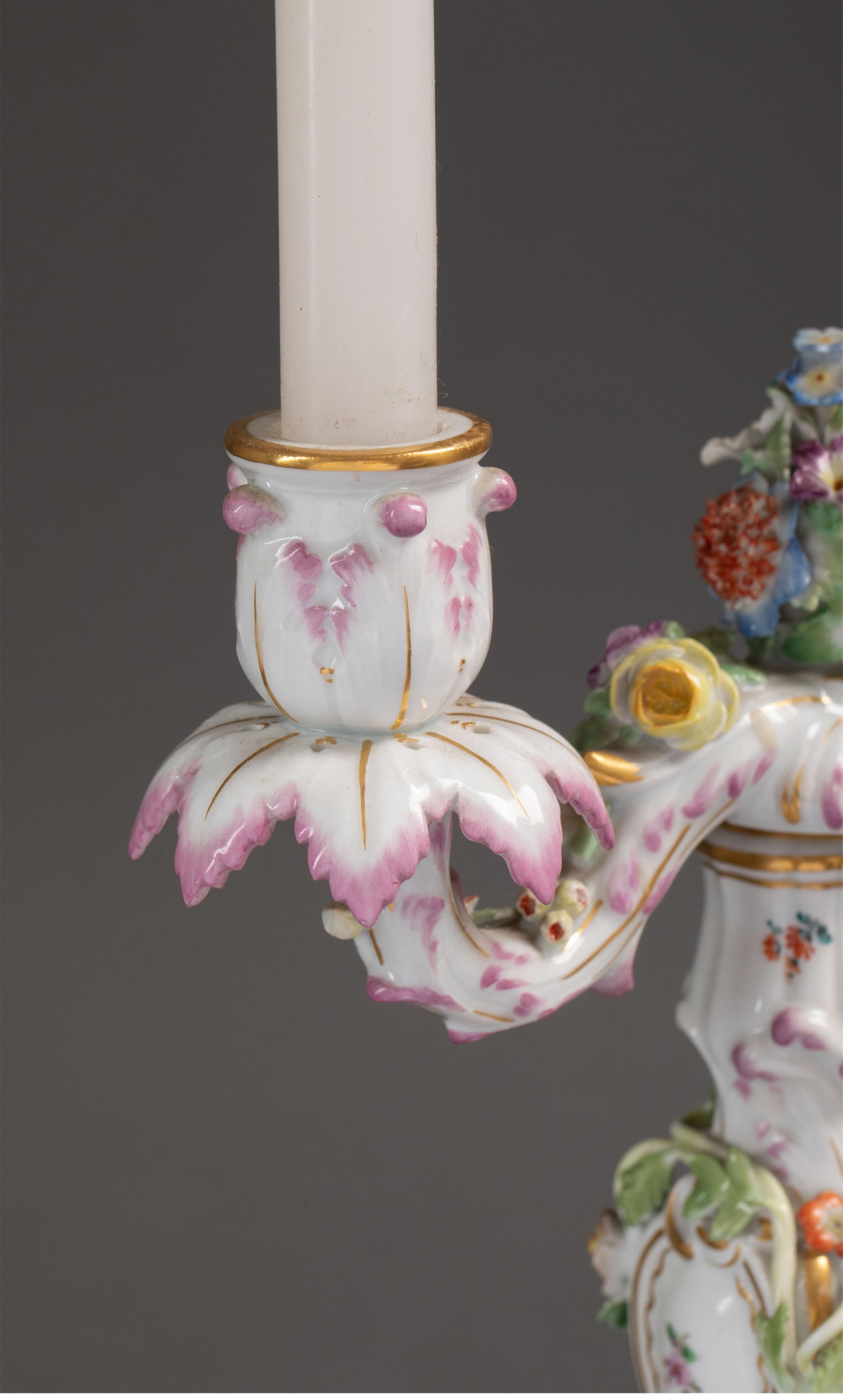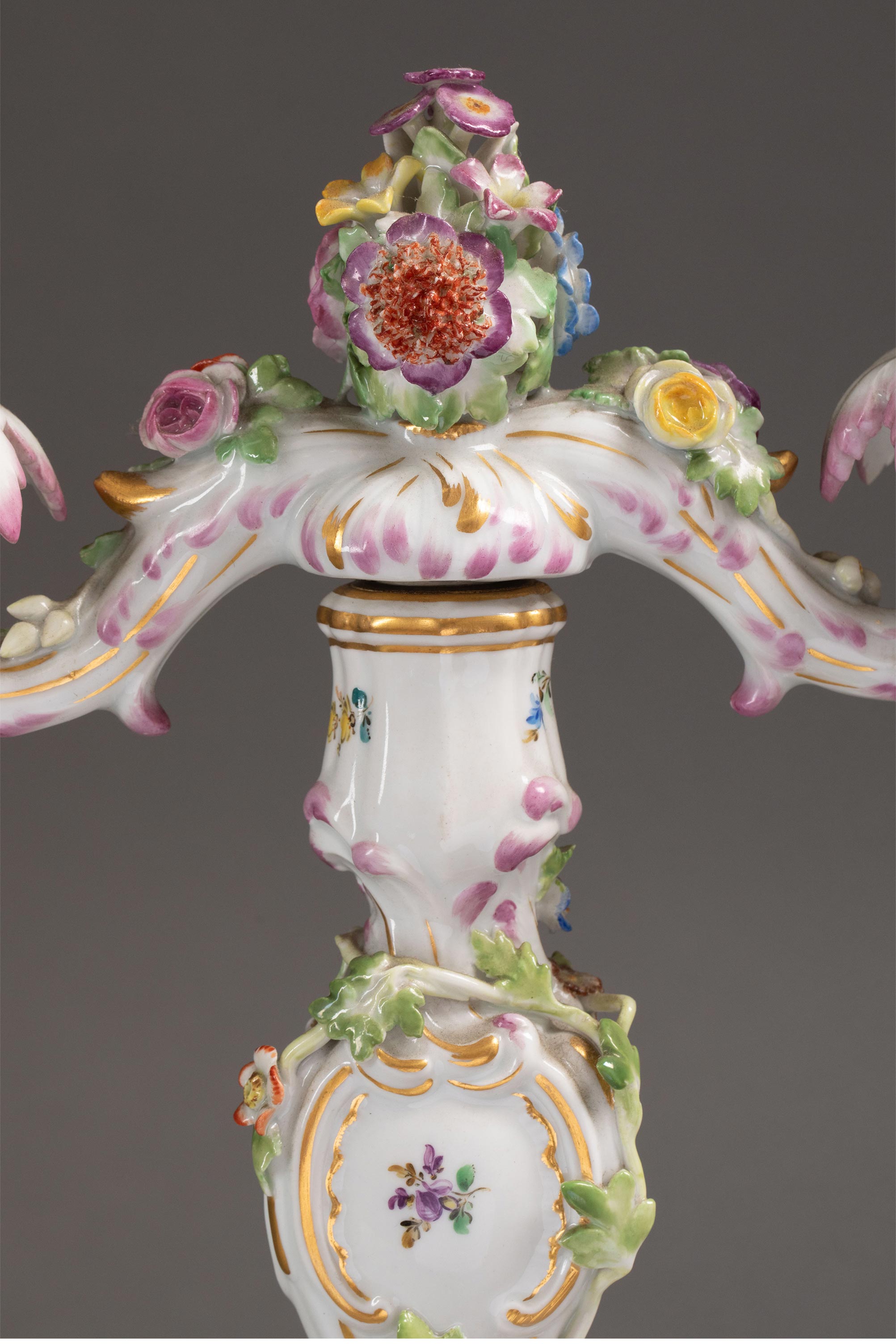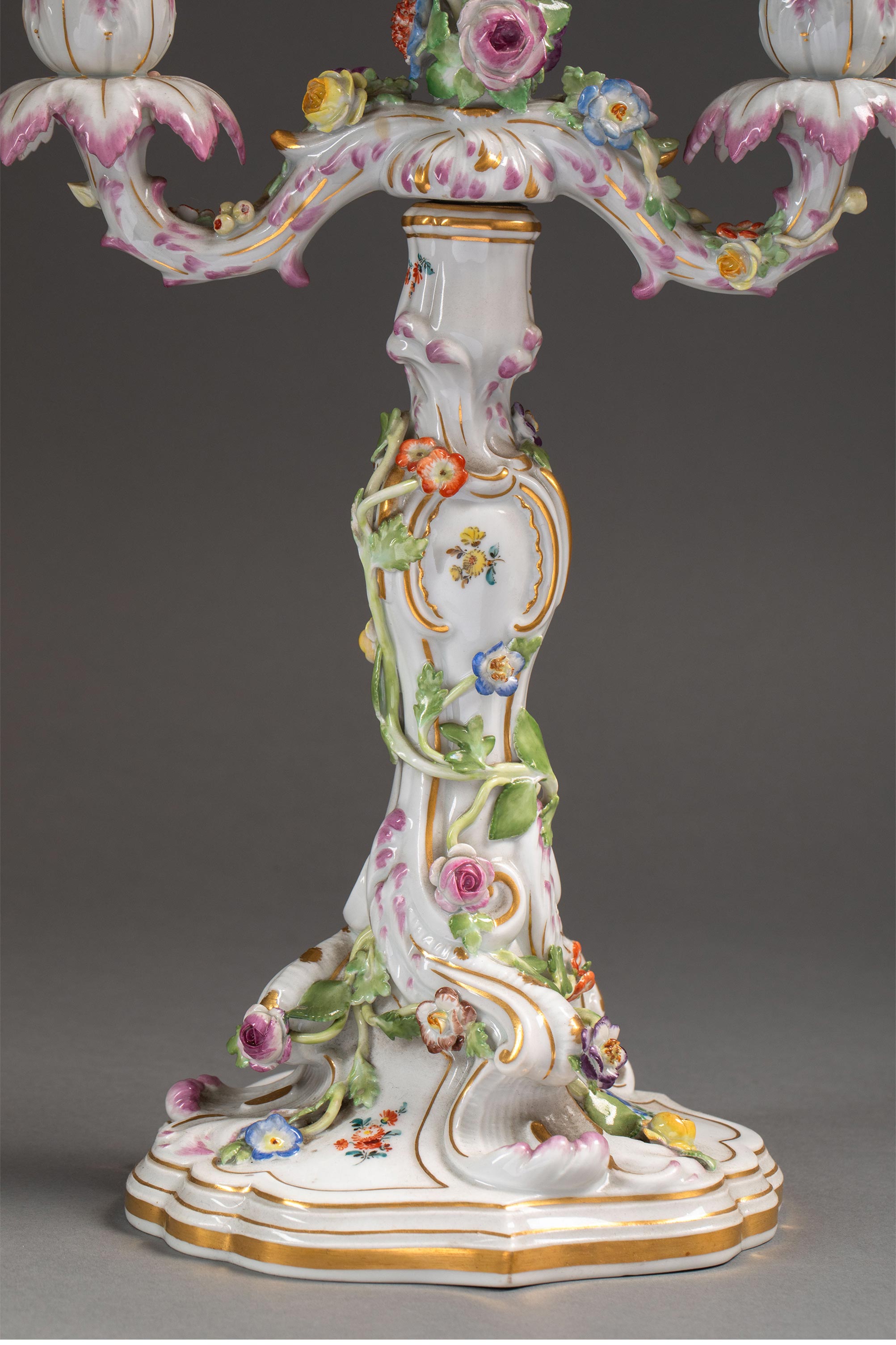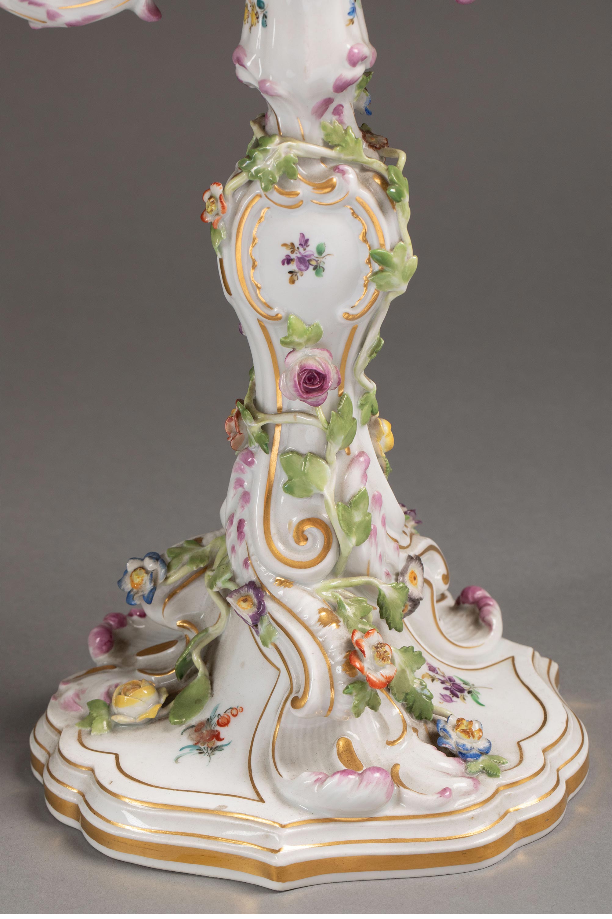 20世纪德国著名瓷窑梅森Meissen出品花卉藤叶主题瓷面浮雕装饰彩绘描金双枝头烛台一对