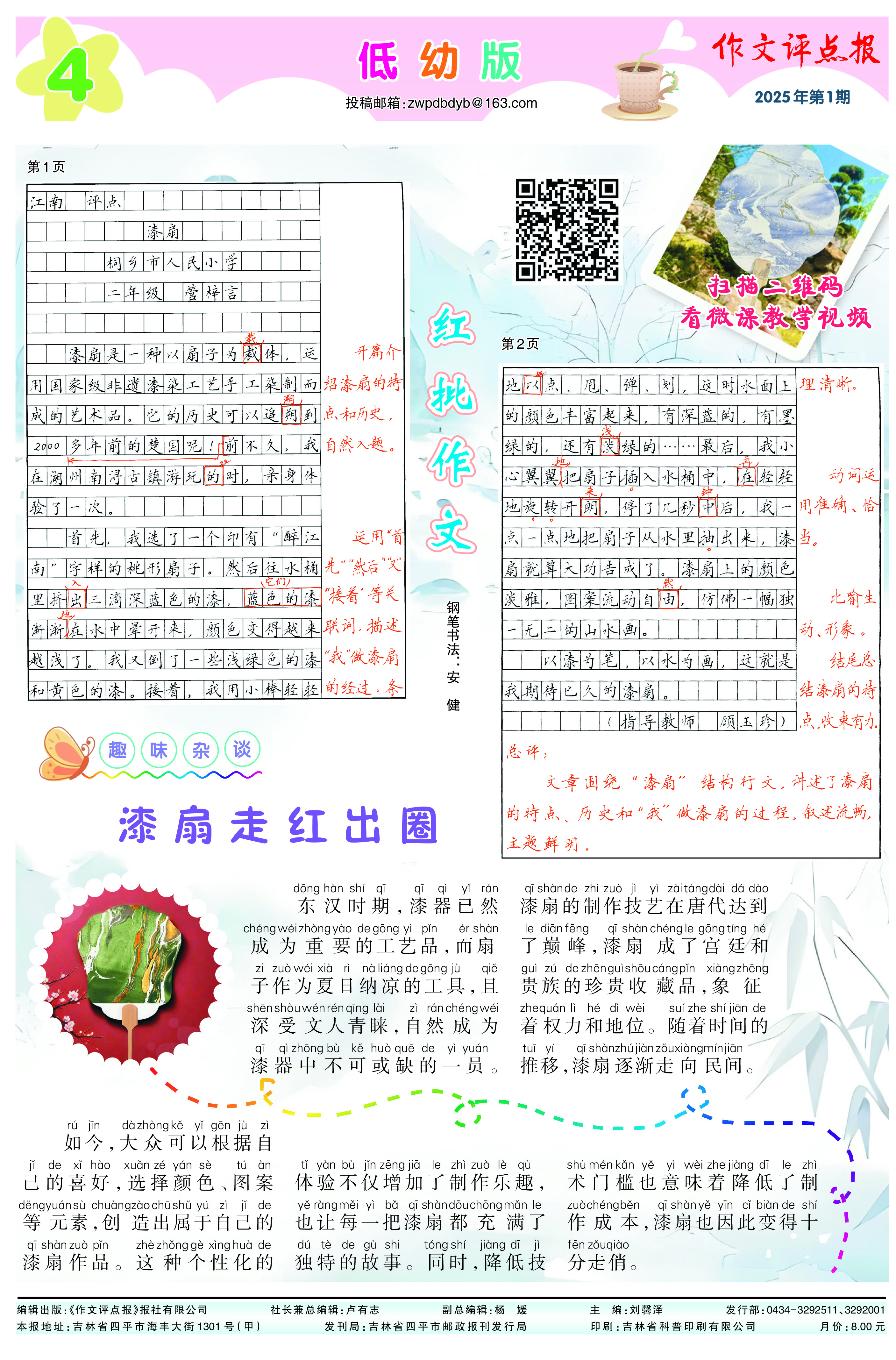 二、有声、视频同步讲解。扫描“红批有声、视频作文”栏目的二维码即可收听名师详解作文或观看微课教学视频,让作文学习有“声”有“色”。