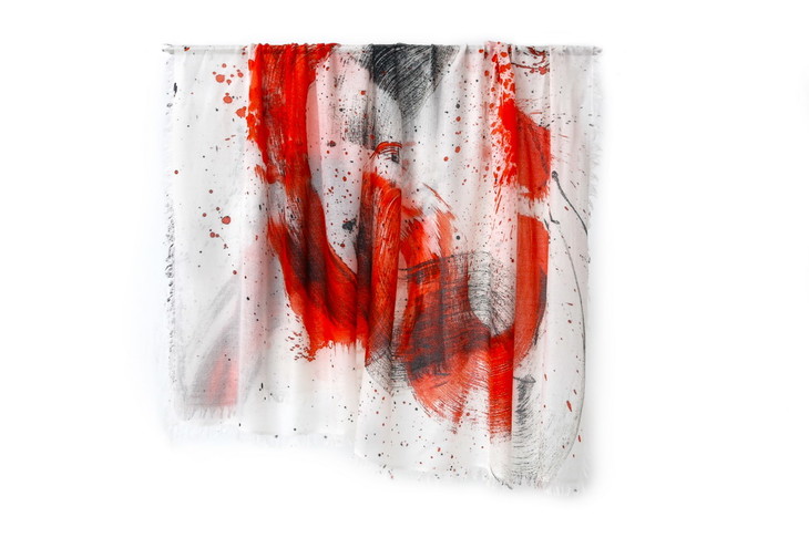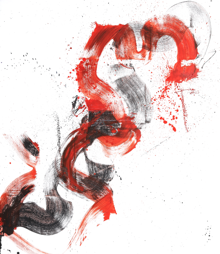 兼容中国泼墨书法的劲与力,以惯用的西方油画颜料,肆意挥色描绘,现无尽灵动与飘逸。红黑色的激荡与碰撞,静如思绪超然物外,动若画笔舞动恣意挥洒灵感。纯白的底色,黑灰的主色调,时而出现几抹明亮的红色夺人心魄,这飘逸的一抹,是动与静的融合与和谐,她曼妙的灵感,和熠熠生辉的中国老庄哲学那般贴近,清净和谐,逍遥无待。