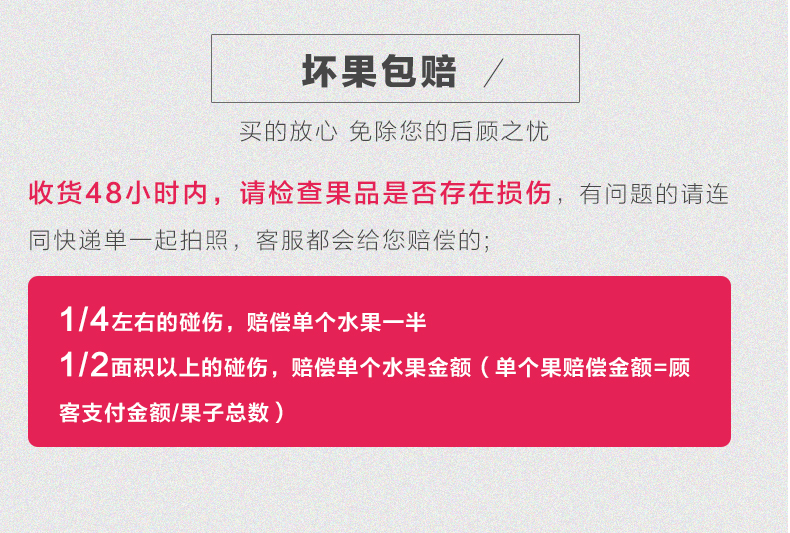 ④到货后,先签收,请在24小时内把快递单和坏果放一起拍照(能看到运单号、姓名,坏果情况),我们将根据果子实际损坏情况,按照“付款价格÷个数×坏果数量=赔付的金额”标准进行赔付