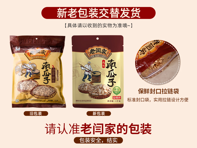 - 老闫家南瓜子三代人用心坚守每一颗南瓜子执行同一个标准,严选产区,15道工序,坚持古法炒制10次,层层质检严控,只为每一颗好南瓜子。