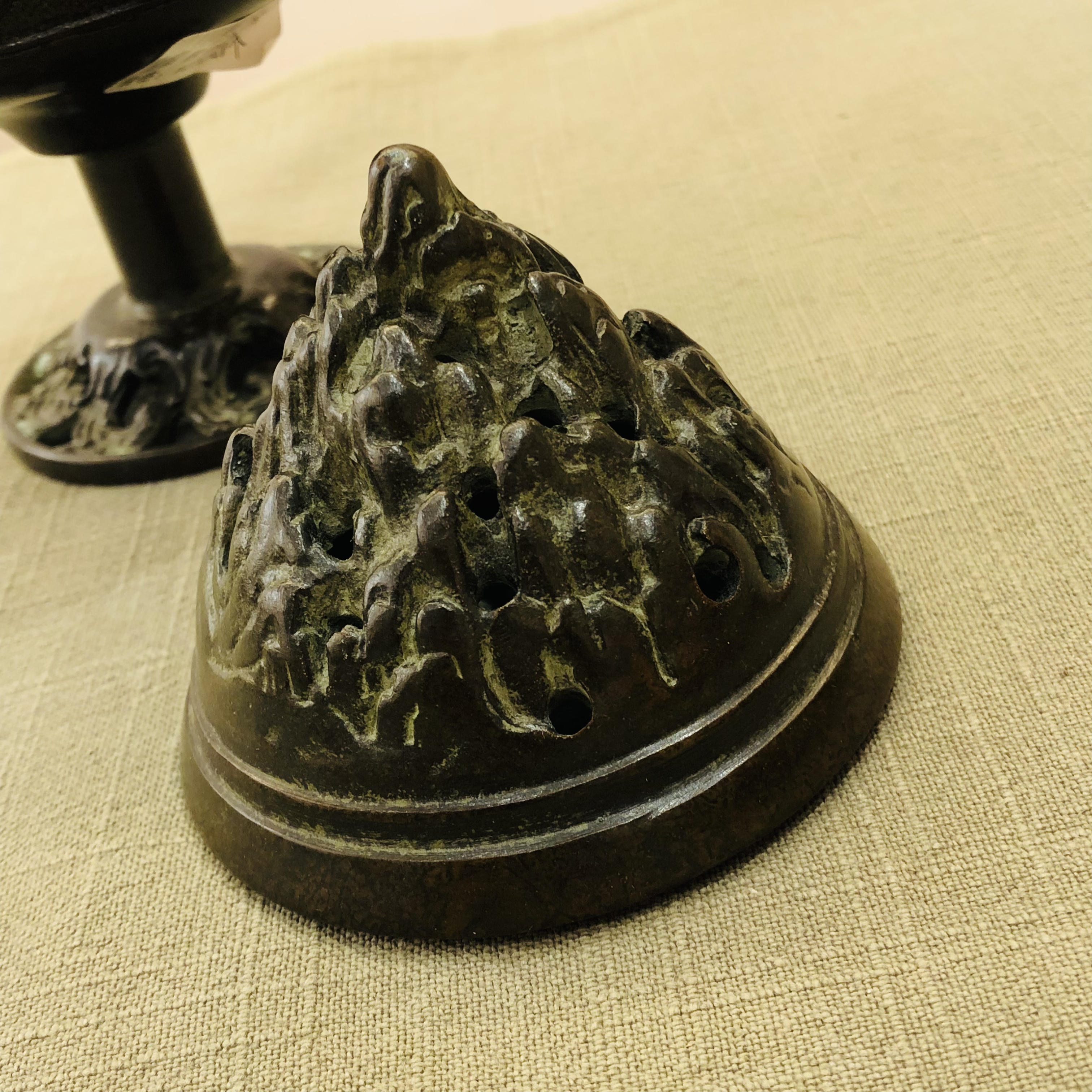 炉体上有盖,盖高而尖,镂空,呈山形,当炉腹内燃烧香料时,烟气从镂空的山形中散出,有如仙气缭绕,给人以置身仙境的感觉。