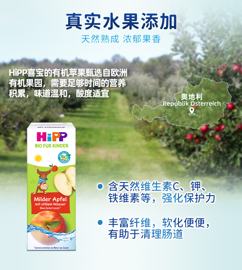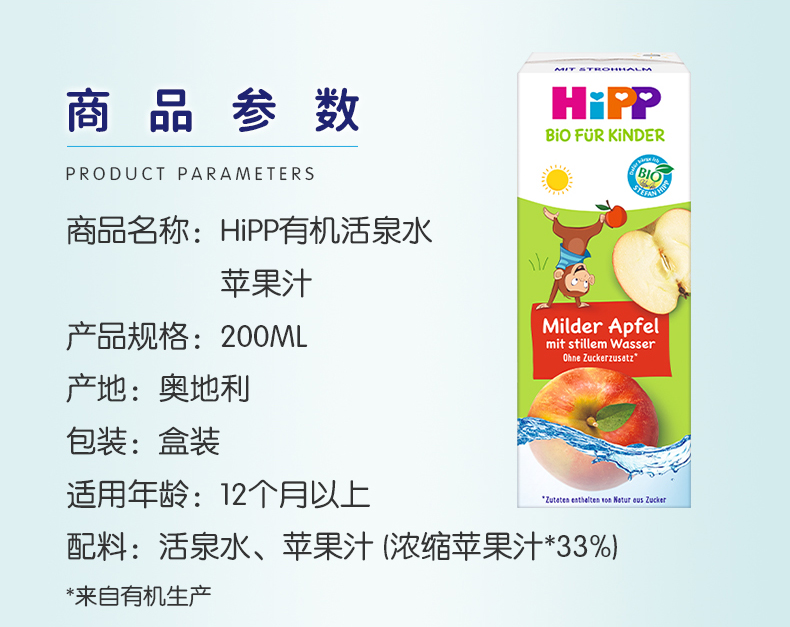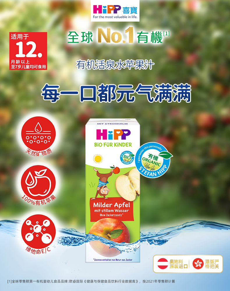 新品(香港直邮)HiPP有機活泉水蘋果汁200ml*15盒/箱 採用100%有機蘋果 無香料、無添加糖分、無色素及無防腐劑