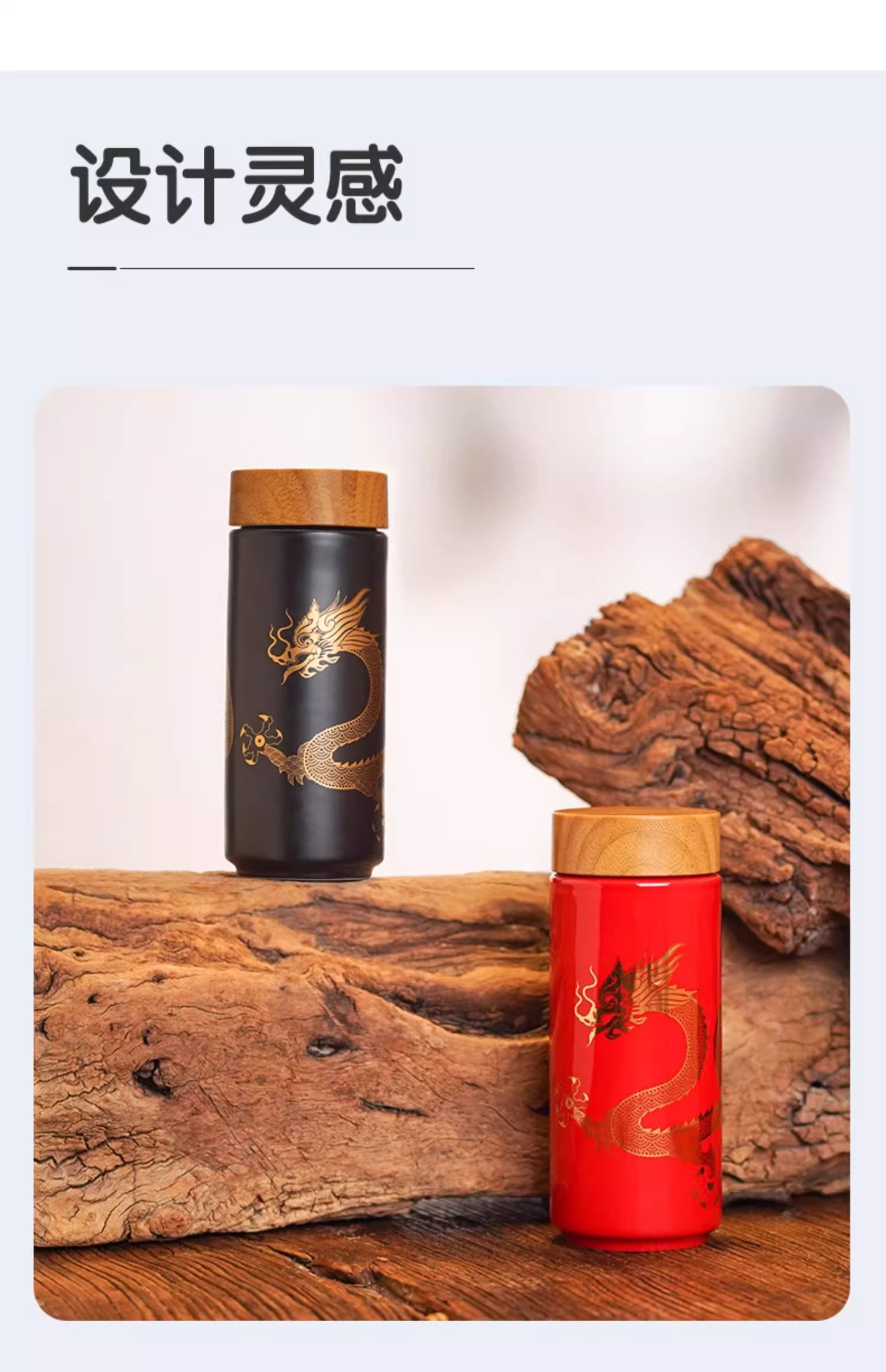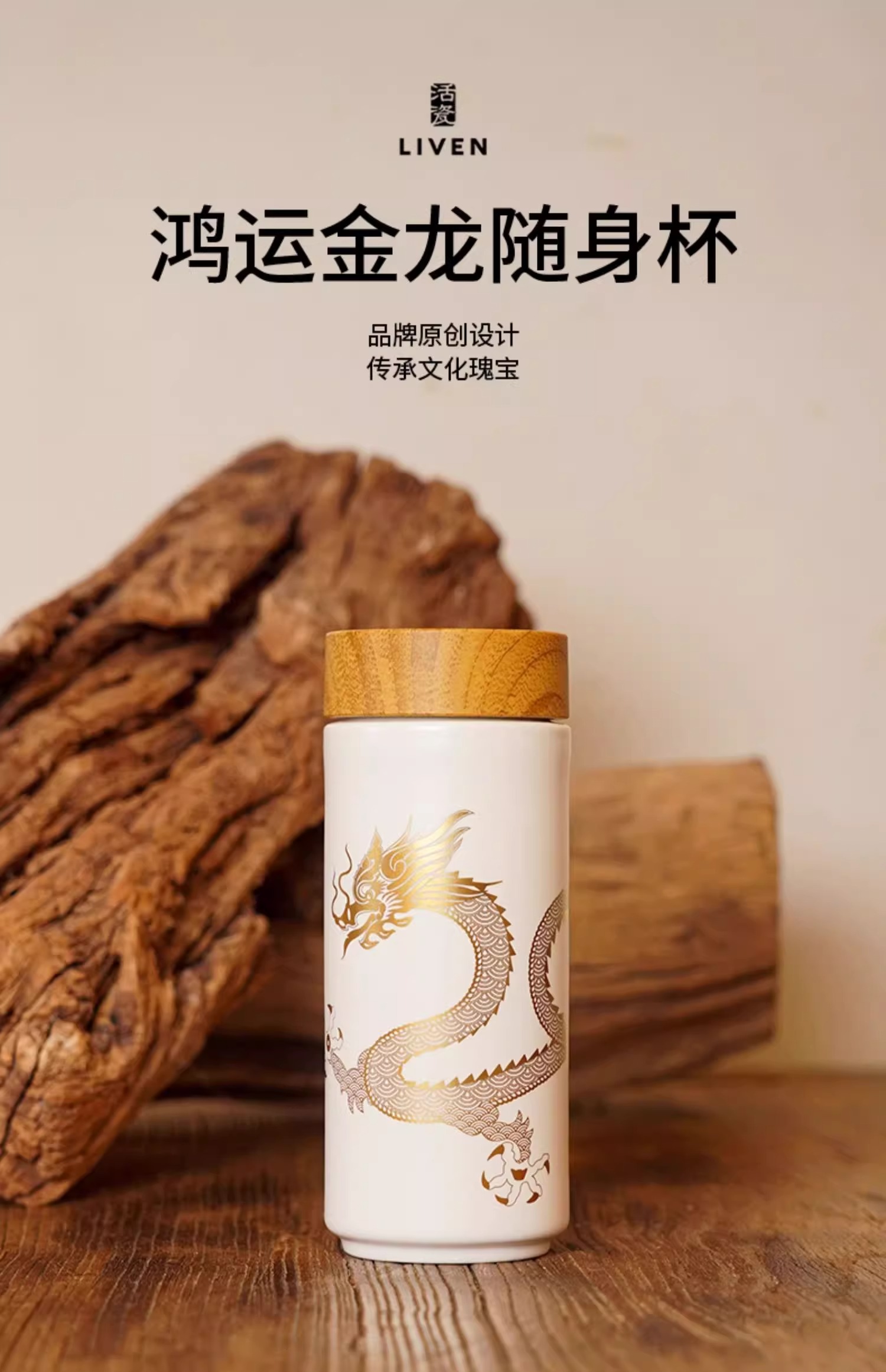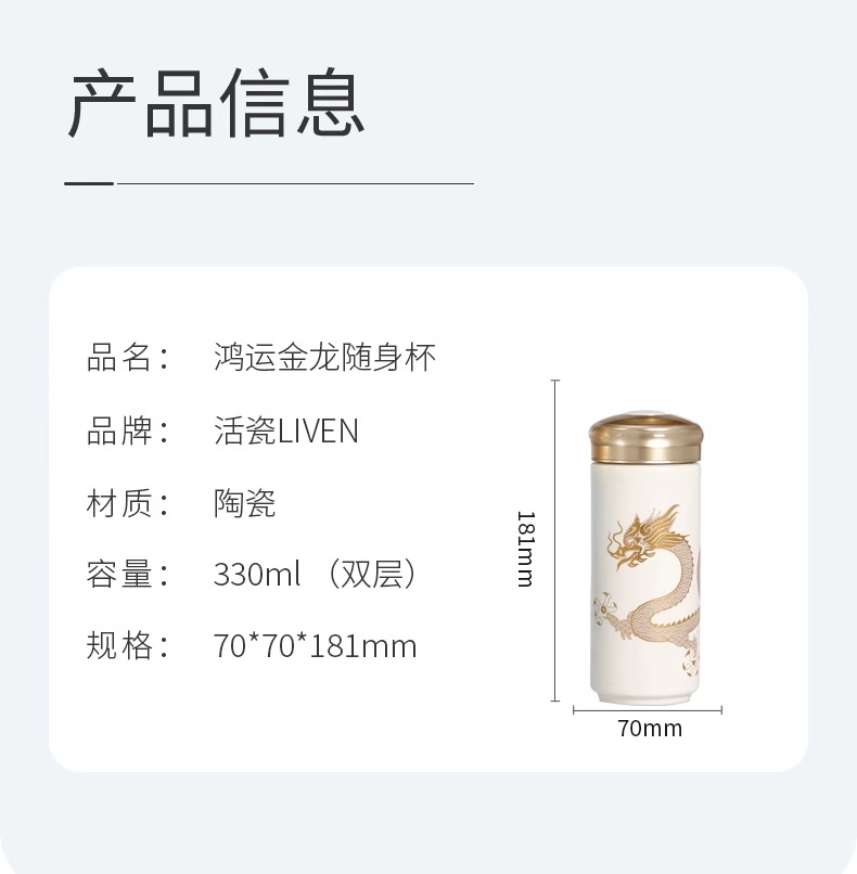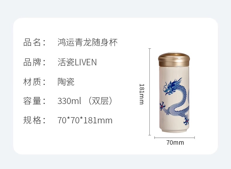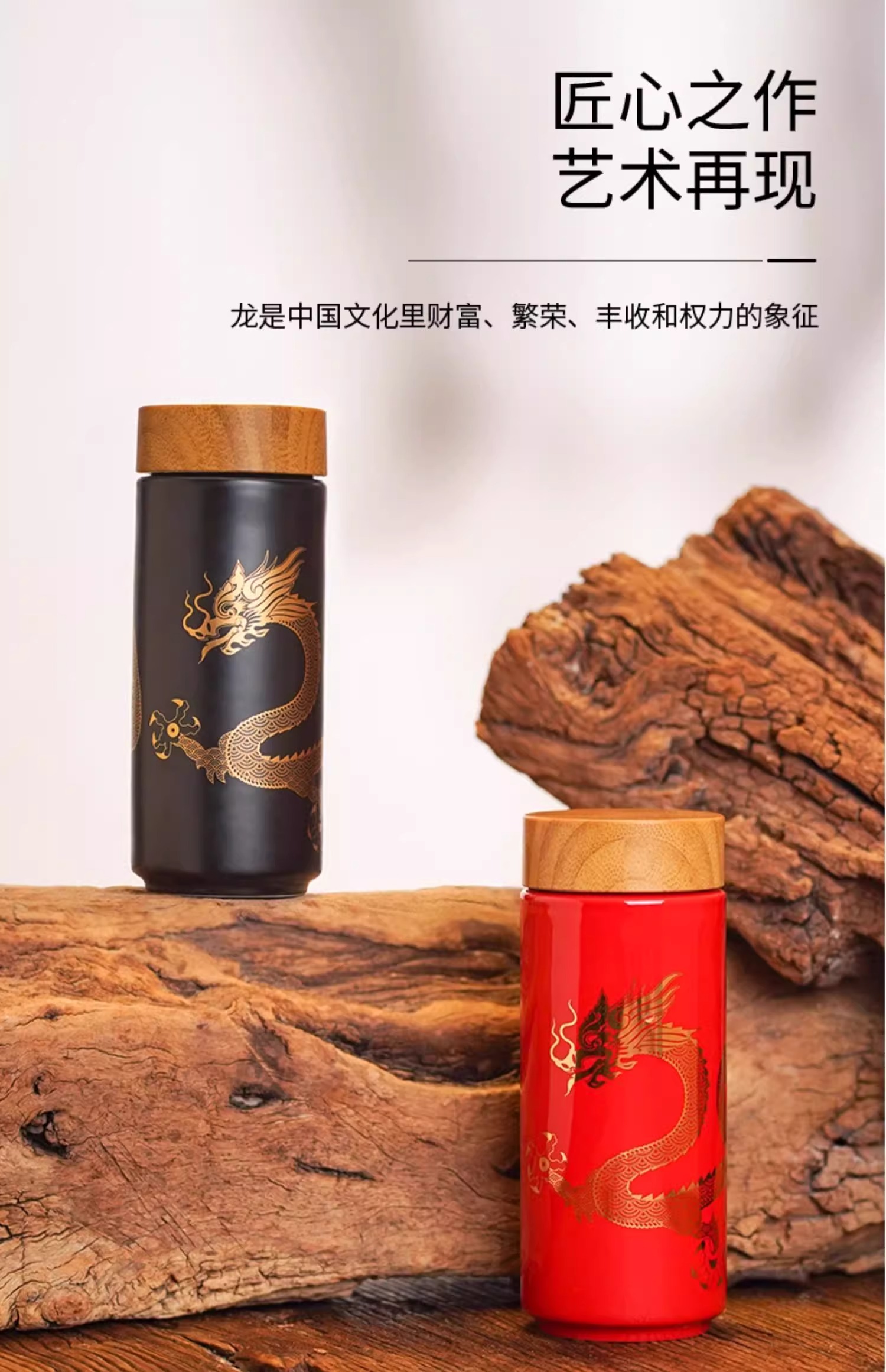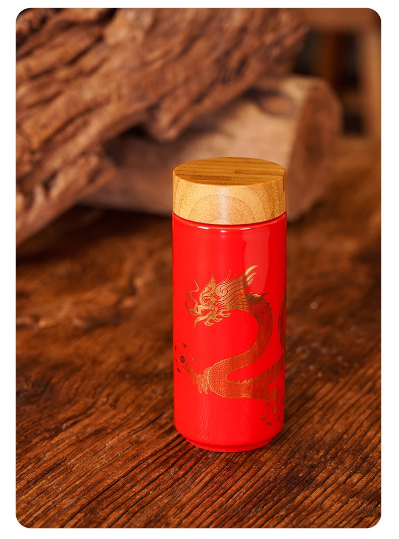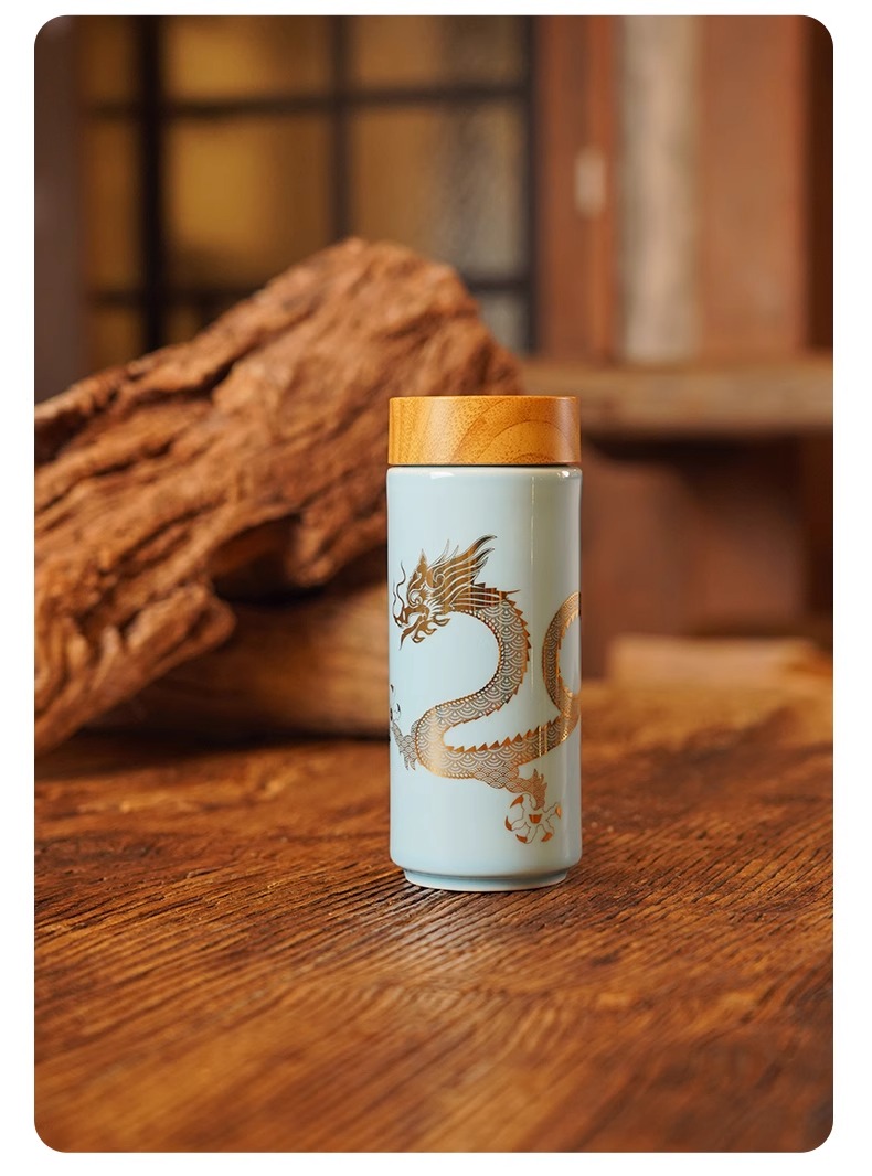 【样品特惠4折,仅1个无原包装,无货退款】乾唐轩鸿运金龙随身杯(木纹盖)无光黑活瓷杯330ml