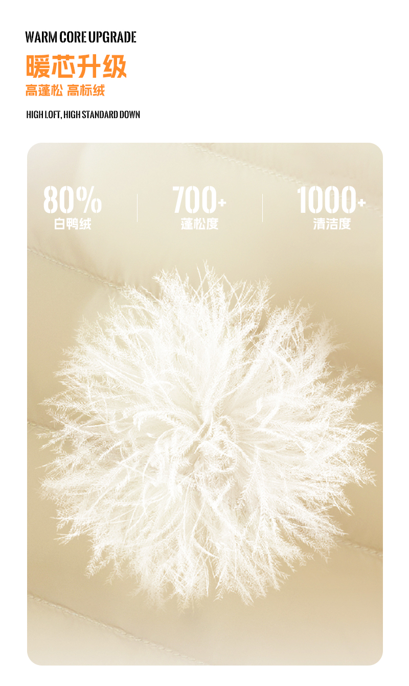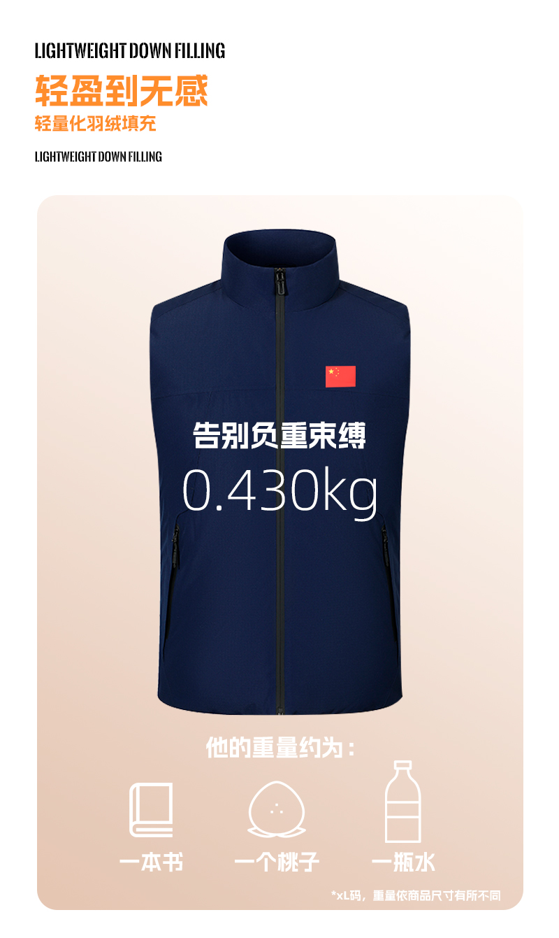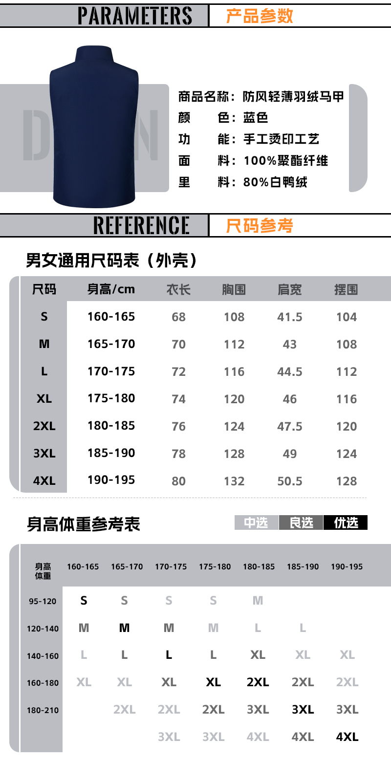 充绒量:S码60g,M码64g,L码69g,XL码75g,2XL码82g,3XL90g码,4XL码99g
