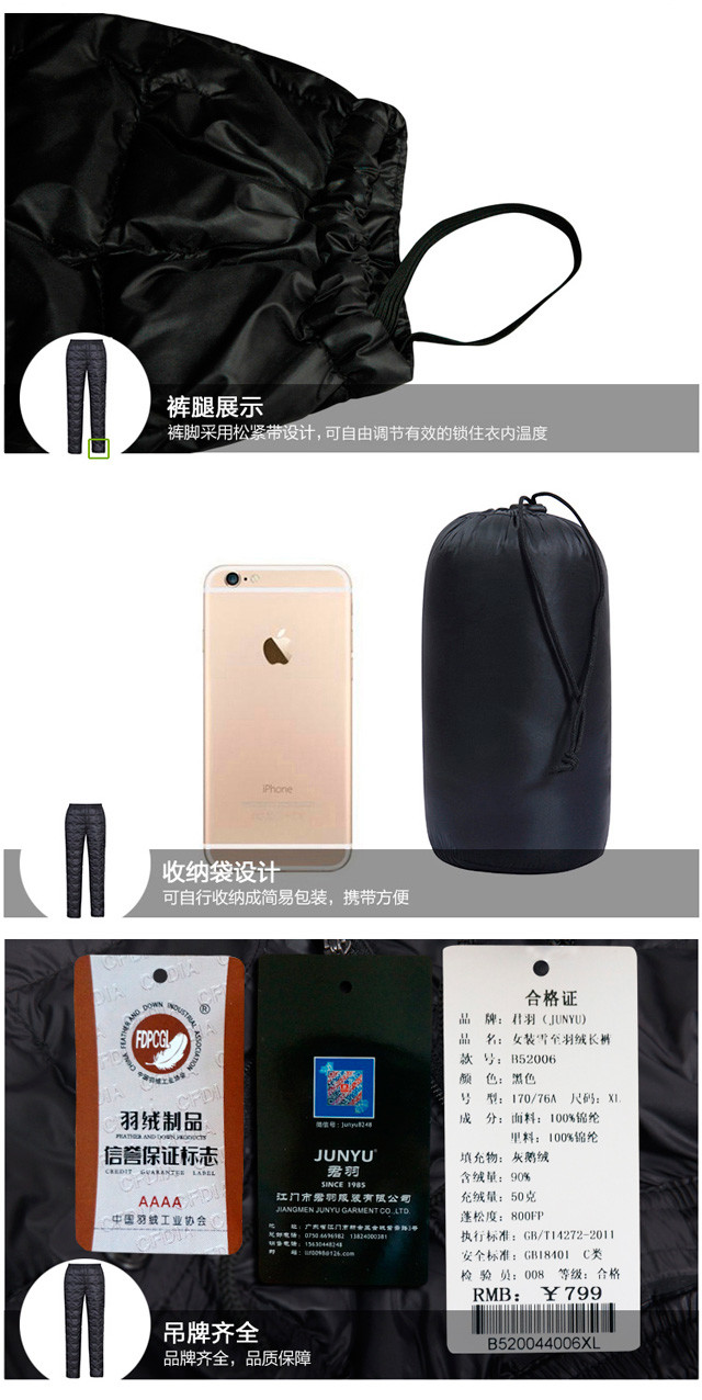 君羽 B52004 女装雪至加厚鹅绒长裤 保暖轻便可收纳