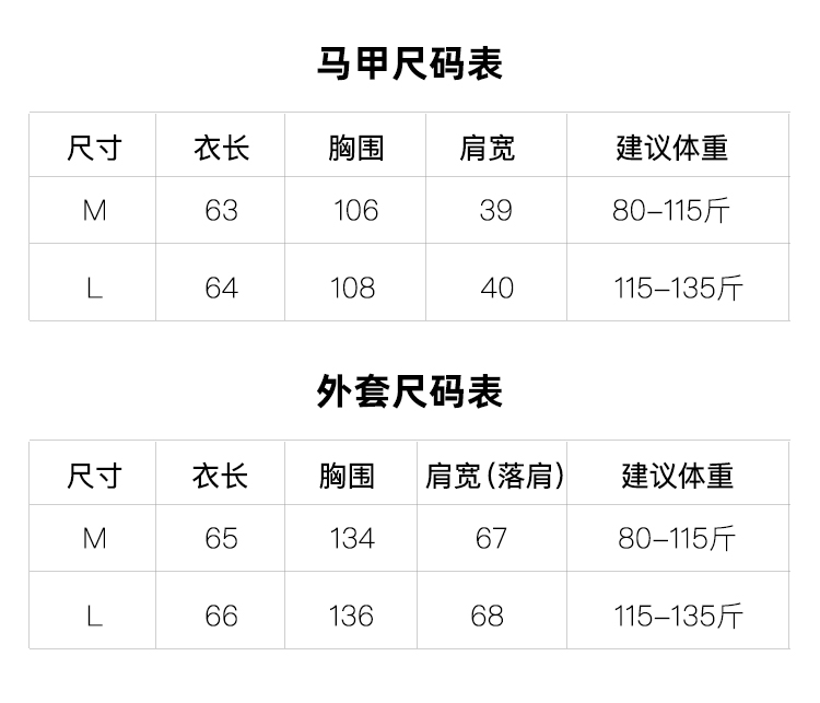外套、马甲可选:M(80-115斤)、L(115-135斤)。