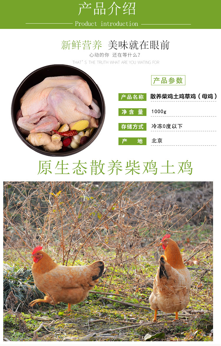 农场规模和养殖过程 农场不大,在山脚下,鸡主要以产蛋为主,1年以上的鸡,由于产蛋率下降,会自然淘汰成散养柴鸡进行售卖,总共鸡的养殖容量在2000只左右(鸡苗交替时节一般会在3000-4000只)。 养殖过程中,不使用外面售卖的成品添加剂饲料,完全是村里收购来的玉米,豆子,经过碾压、磨碎后给鸡食用,夏天由于山间有青草虫子,鸡的食物来源较多,冬季我们会给鸡增加胡萝卜、白菜等蔬菜。 山是一对老夫妇承包的,他们两人终年在山上,不会使用任何防疫措施(比如给鸡扎针之类的),完全按照土办法进行养鸡。所以,安全方面,敬请放心。 母鸡品相说明母鸡大部分有乌鸡血统,大部分是下绿壳蛋(少量粉壳蛋),市面上比较少见,难以作假。因此,鸡屠宰后,大腿和翅膀部分会发黑,有的鸡身体也会是黑皮,只是因为有乌鸡血统的原因,不是病态,如果您非常介意,请慎拍。 由于担心鸡会坏掉,一般会采用冷冻方式进行配送(尤其夏季),因此,想要冷鲜鸡的朋友,请一定提前沟通,仅限冬季可以提供冷鲜配送方式。 鸡是采用家庭屠宰模式,不是大规模屠宰场的那种,不会采用沥青进行脱毛处理,可以放心食用,外包装是简单的真空塑料包装。不是豪华礼盒模式。想买绿壳鸡蛋的朋友,请点这里 绿壳鸡蛋链接:关于配送问题,请关注由于没有使用任何激素,鸡完全按照自由的方式产蛋,因此,在冬季和夏季产蛋量会下降,届时,我们会尽量少杀鸡,在优先配给会员的情况下,不能保证您拍的鸡随时都能配送到,所以拍鸡时,如果方便,请与客服沟通,以确保不耽误您食用! 配送时间安排: 1、周一中午之前拍下的订单,我们会安排周二当天送达; 2、周四中午12:00之前拍下的订单,我们会安排周五当天送达。 彩虹雨的配送人员,大部分是自己开车配送,不是普通的圆通、申通快递,因此,请您尽量保证家里留人,手机开机,以免因为您这一家影响到其他家的配送,也非常感谢您的合作!!农场照片 照片是冬季照的,山上略显萧瑟,但这就是鸡的自然生长环境,农场这一对老夫妇,是住在简易房子里面,冬天比较冷,但鸡和鸡蛋确实是原始的味道,也希望在大家的鼎力支持下,他们的鸡场会越办越好