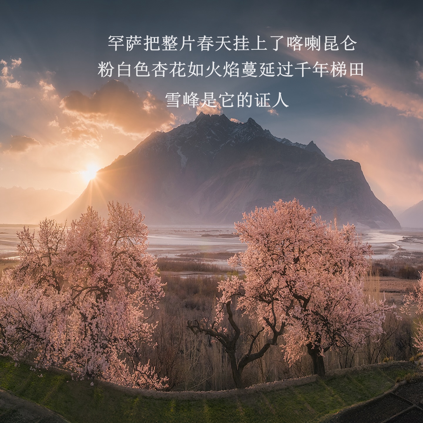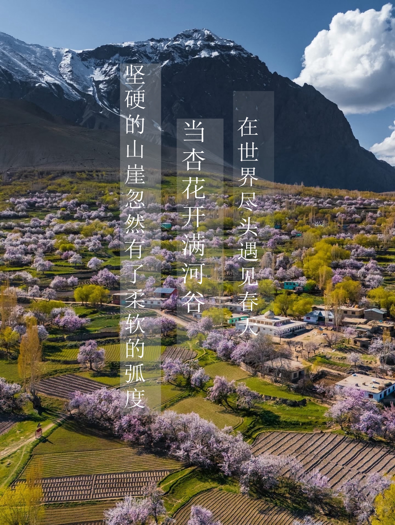 四月,杏花像一声叹息般绽放,瞬间铺满所有视线可及的悬崖与屋檐。在这里,能同时听见两种声音:冰川崩裂的轰鸣,与花瓣触及泥土的轻颤。