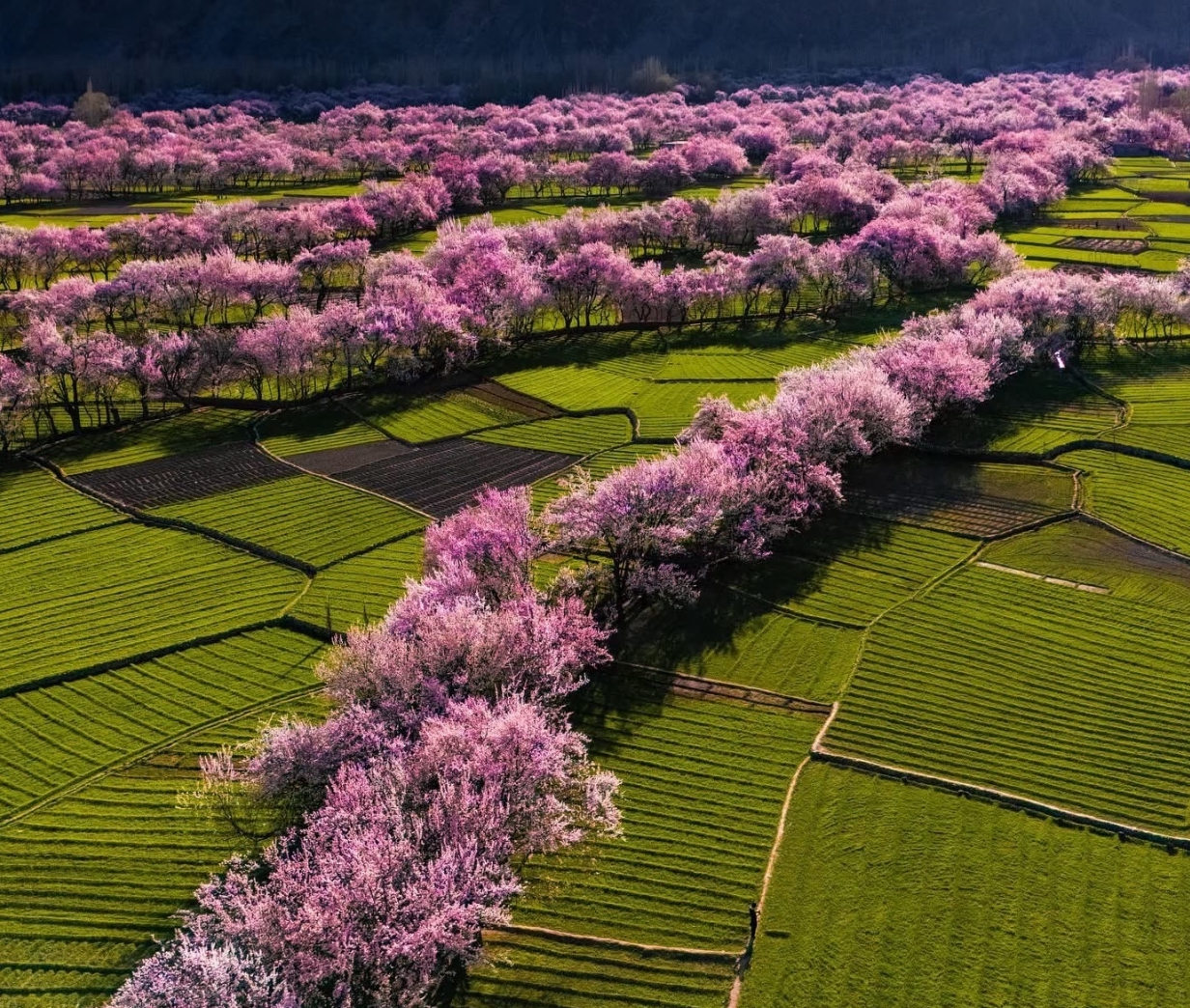粉白色杏花如火焰蔓延过千年梯田,雪峰是它冷静的证人。