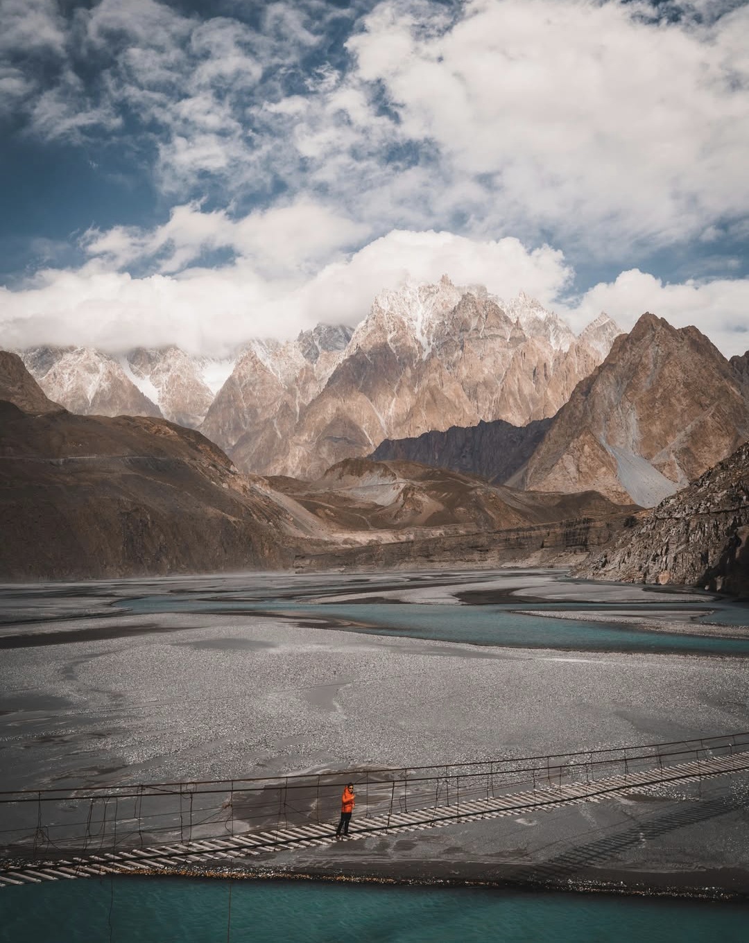 宫崎骏的风之谷日出,五座7000米的雪山将整个山谷环抱其中,雪山映衬杏花,胡赛尼吊桥与山谷河流杏花组合吊桥上是观赏帕苏锥峰的最佳地点。博里特湖群山环绕中的湖泊,帕苏冰川拍摄。