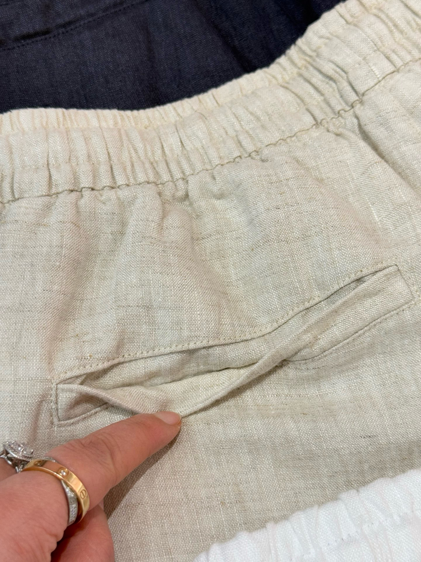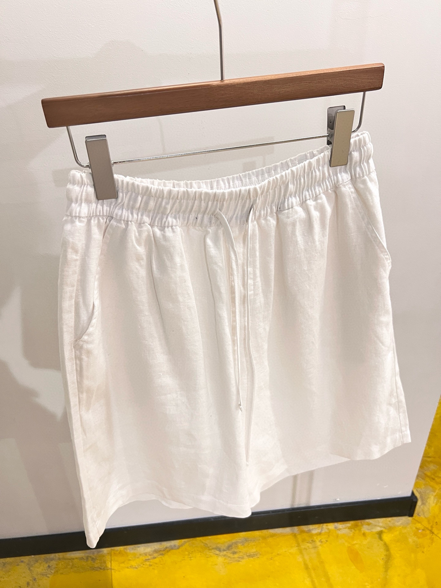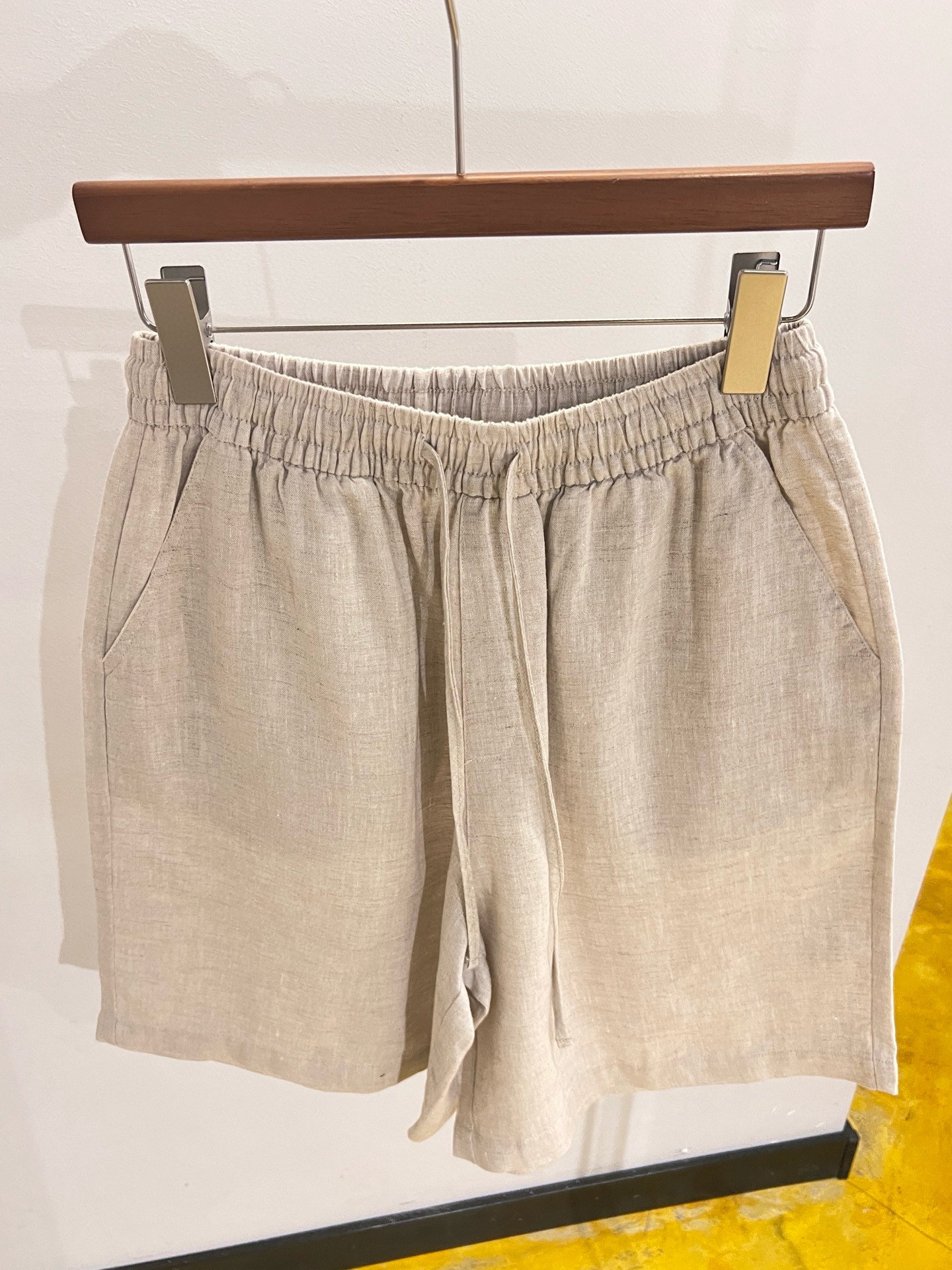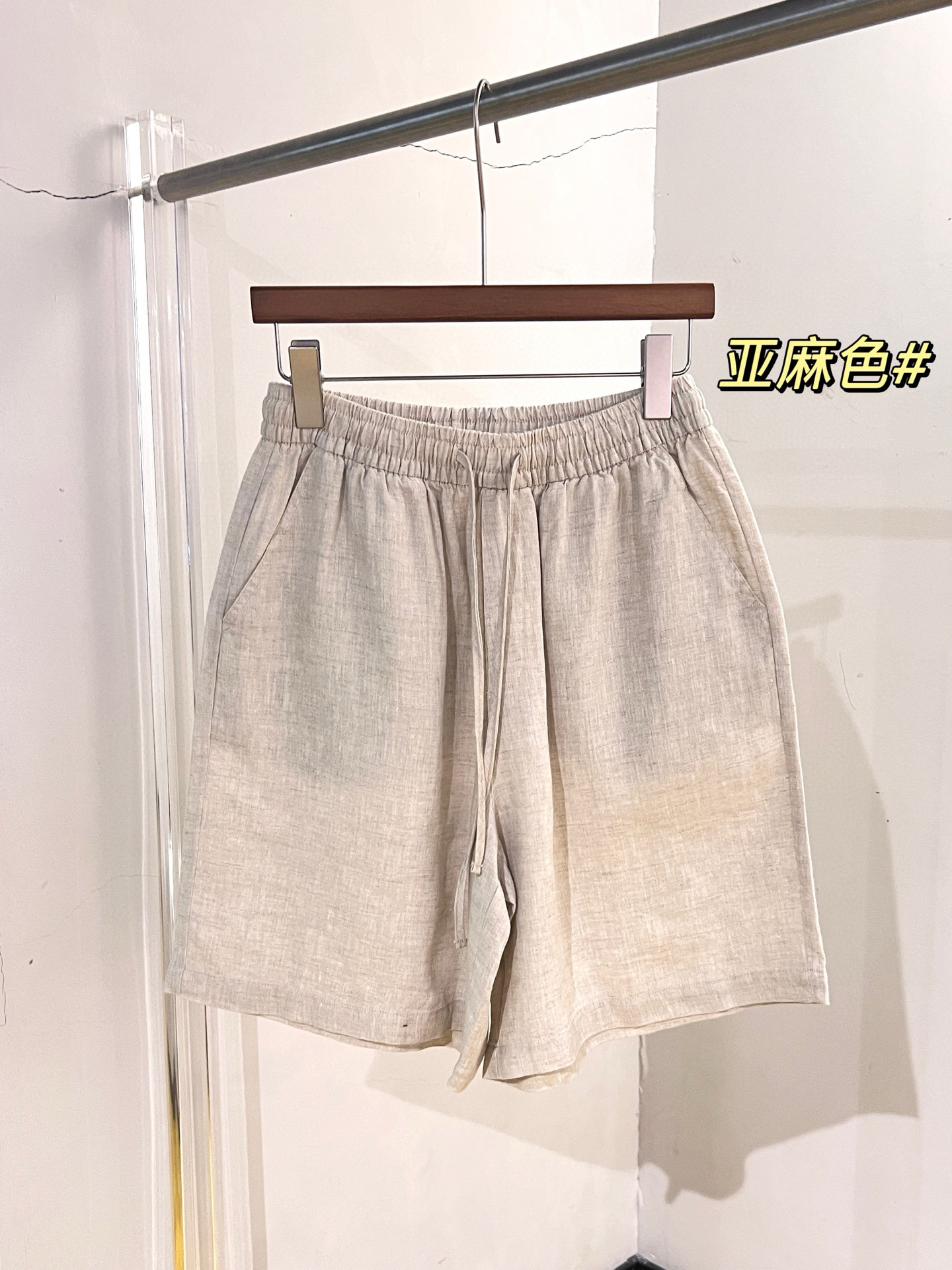 100%全亚麻材质,表面肌理感清晰。这个短裤是那种很细致的亚麻精纺哈,贴肤完全无压力,上身凉爽舒适,有很好的稳固性和挺括感,透气吸湿,不闷不热!~
