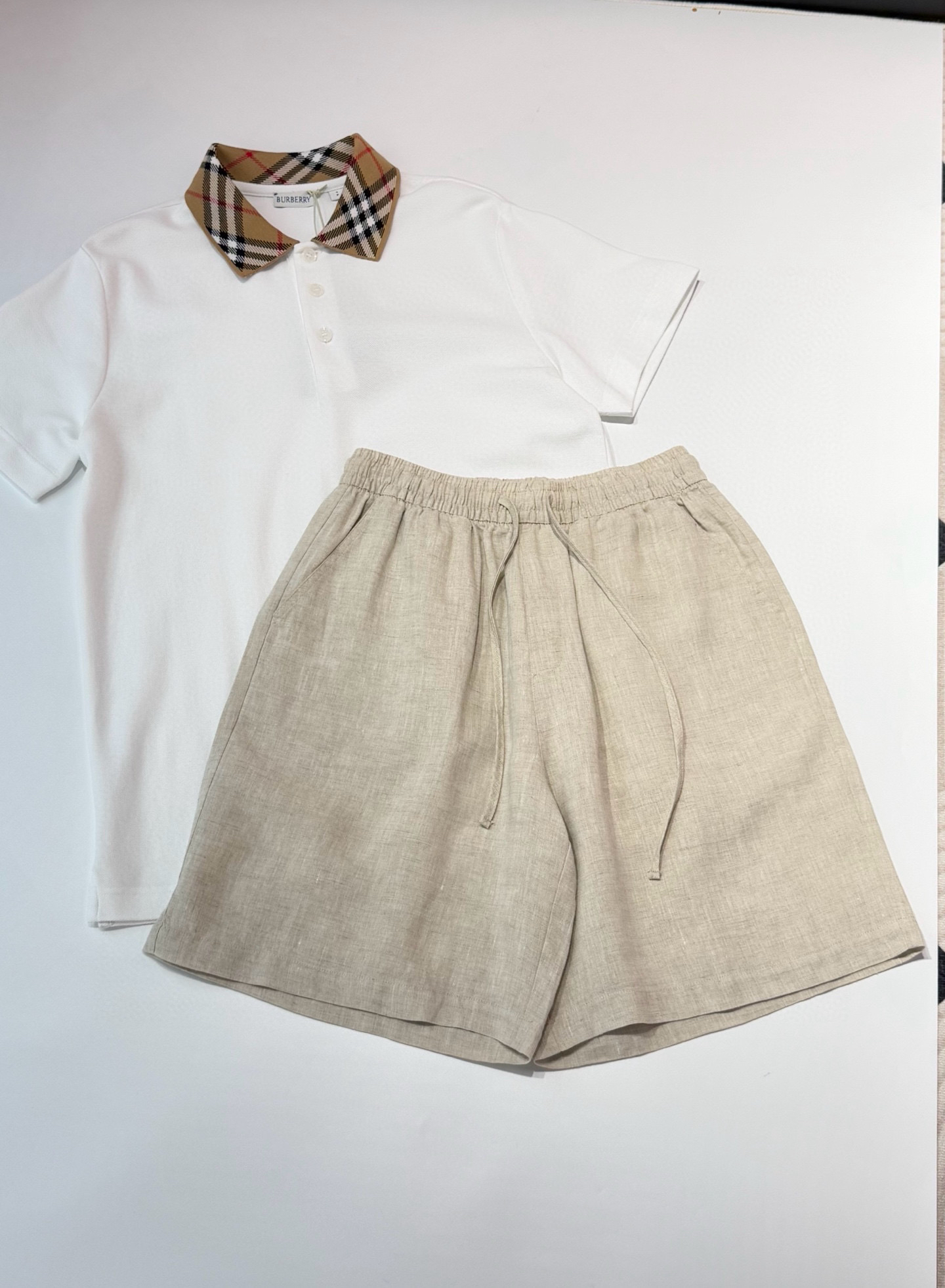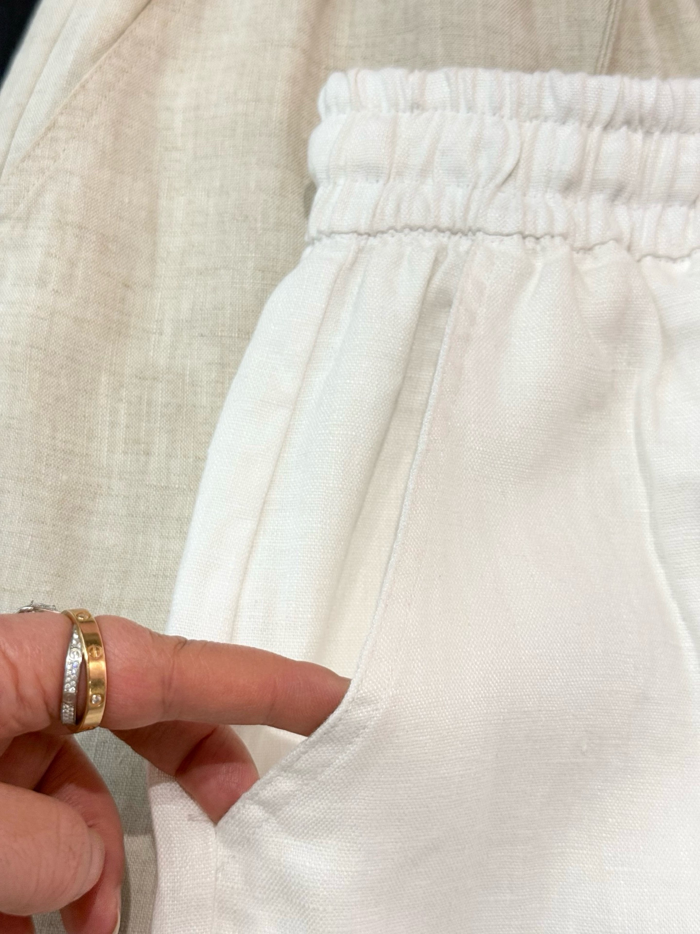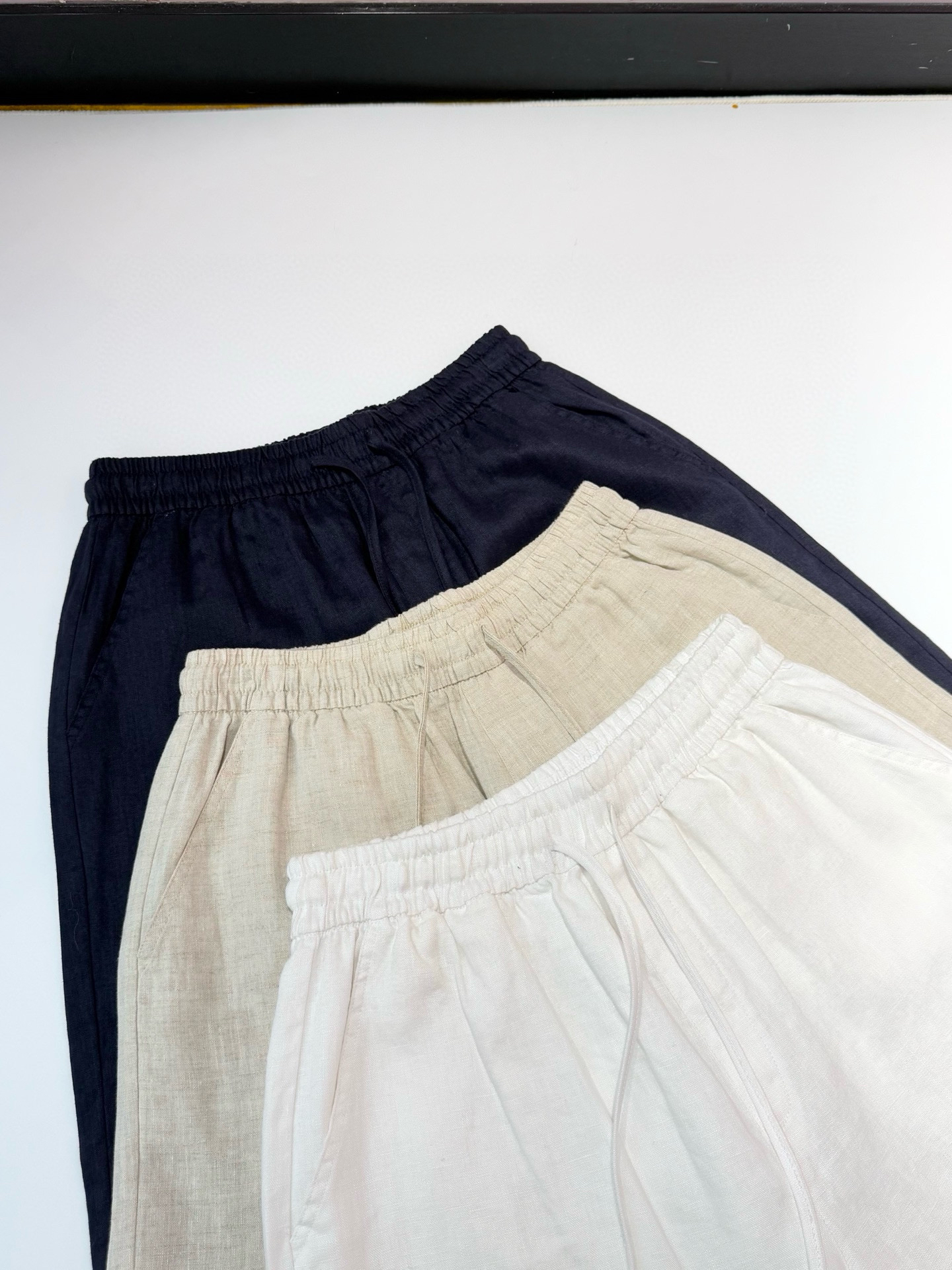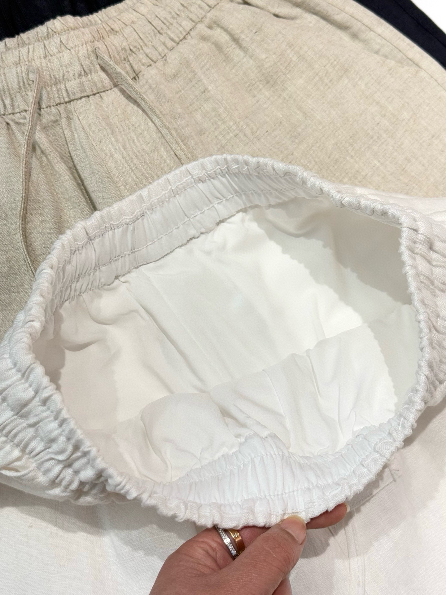 100%全亚麻材质,表面肌理感清晰。这个短裤是那种很细致的亚麻精纺哈,贴肤完全无压力,上身凉爽舒适,有很好的稳固性和挺括感,透气吸湿,不闷不热!~